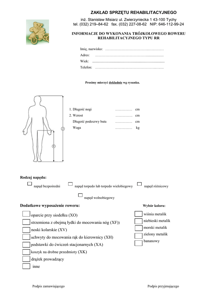 ZAKŁAD SPRZĘTU REHABILITACYJNEGO inż. Stanisław Misiarz ul. Zwierzyniecka 1 43-100 Tychy tel. (032) 219–84-62 fax. (032) 227-08-62 NIP: 646-112-99-24 INFORMACJE DO WYKONANIA TRÓJKOŁOWEGO ROWERU REHABILITACYJNEGO TYPU RR Imię, nazwisko: Adres: Wiek: Telefon: ……………………………………….………….…. ………………………………………………......................... .................................................................................. ………………………………………………………..…..…. Prosimy mierzyć dokładnie wg rysunku. 1. Długość nogi ……………… cm 2. Wzrost ……………… cm Długość podeszwy buta ……………… cm Waga ……………… kg Rodzaj napędu: napęd bezpośredni napęd torpedo lub torpedo wielobiegowy napęd różnicowy napęd wolnobiegowy Dodatkowe wyposażenie roweru: Wybór koloru: oparcie przy siodełku (XO) wiśnia metalik strzemiona z obejmą łydki do mocowania nóg (XF)) niebieski metalik noski kolarskie (XV) uchwyty do mocowania rąk do kierownicy (XH) podstawki do ćwiczeń stacjonarnych (XA) morski metalik zielony metalik bananowy koszyk na drobne przedmioty (XK) drążek prowadzący inne Podpis zamawiającego Podpis przyjmującego