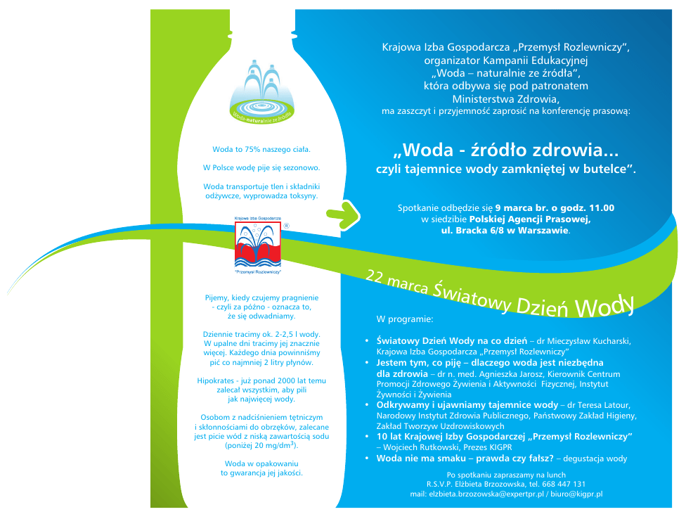 Krajowa Izba Gospodarcza „Przemysł Rozlewniczy”, organizator Kampanii Edukacyjnej „Woda – naturalnie ze źródła”, która odbywa się pod patronatem Ministerstwa Zdrowia, ma zaszczyt i przyjemność zaprosić na konferencję prasową: Woda to 75% naszego ciała. „Woda - źródło zdrowia... W Polsce wodę pije się sezonowo. czyli tajemnice wody zamkniętej w butelce”. Woda transportuje tlen i składniki odżywcze, wyprowadza toksyny. Spotkanie odbędzie się 9 marca br. o godz. 11.00 w siedzibie Polskiej Agencji Prasowej, ul. Bracka 6/8 w Warszawie. 22 m a Pijemy, kiedy czujemy pragnienie - czyli za późno - oznacza to, że się odwadniamy. Dziennie tracimy ok. 2-2,5 l wody. W upalne dni tracimy jej znacznie więcej. Każdego dnia powinniśmy pić co najmniej 2 litry płynów. Hipokrates - już ponad 2000 lat temu zalecał wszystkim, aby pili jak najwięcej wody. Osobom z nadciśnieniem tętniczym i skłonnościami do obrzęków, zalecane jest picie wód z niską zawartością sodu (poniżej 20 mg/dm3). Woda w opakowaniu to gwarancja jej jakości. rca Ś w iatow y W programie: Dzień Wody • Światowy Dzień Wody na co dzień – dr Mieczysław Kucharski, Krajowa Izba Gospodarcza „Przemysł Rozlewniczy” • Jestem tym, co piję – dlaczego woda jest niezbędna dla zdrowia – dr n. med. Agnieszka Jarosz, Kierownik Centrum Promocji Zdrowego Żywienia i Aktywności Fizycznej, Instytut Żywności i Żywienia • Odkrywamy i ujawniamy tajemnice wody – dr Teresa Latour, Narodowy Instytut Zdrowia Publicznego, Państwowy Zakład Higieny, Zakład Tworzyw Uzdrowiskowych • 10 lat Krajowej Izby Gospodarczej „Przemysł Rozlewniczy” – Wojciech Rutkowski, Prezes KIGPR • Woda nie ma smaku – prawda czy fałsz? – degustacja wody Po spotkaniu zapraszamy na lunch R.S.V.P. Elżbieta Brzozowska, tel. 668 447 131 mail: [email protected] / [email protected]