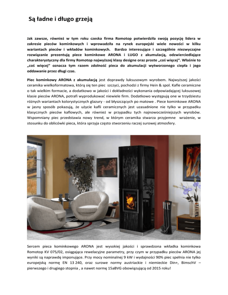 Są ładne i długo grzeją Jak zawsze, również w tym roku czeska firma Romotop potwierdziła swoją pozycję lidera w zakresie pieców kominkowych i wprowadziła na rynek europejski wiele nowości w kilku wariantach pieców i wkładów kominkowych. Bardzo interesujące i szczególnie niezwyczajne rozwiązanie prezentują piece kominkowe ARONA i LUGO z akumulacją, odzwierciedlające charakterystyczny dla firmy Romotop najwyższej klasy designe oraz proste „coś więcej“. Właśnie to „coś więcej“ oznacza tym razem zdolnośd pieca do akumulacji wytworzonego ciepła i jego oddawanie przez długi czas. Piec kominkowy ARONA z akumulacją jest doprawdy luksusowym wyrobem. Najwyższej jakości ceramika wielkoformatowa, którą się ten piec szczyci, pochodzi z firmy Hein & spol. Kafle ceramiczne o tak wielkim formacie, a dodatkowo w jakości i dokładności wykonania odpowiadającej luksusowej klasie pieców ARONA, potrafi wyprodukowad niewiele firm. Dodatkowo występują one w trzydziestu różnych wariantach kolorystycznych glazury - od błyszczących po matowe . Piece kominkowe ARONA w jasny sposób pokazują, że użycie kafli ceramicznych jest uzasadnione nie tylko w przypadku klasycznych pieców kaflowych, ale również w przypadku tych najnowocześniejszych wyrobów. Wspomniany piec przedstawia nowy trend, w którym ceramika stwarza przyjemne wrażenie, w stosunku do oblicówki pieca, która sprzyja często stworzeniu raczej surowej atmosfery. Sercem pieca kominkowego ARONA jest wysokiej jakości i sprawdzona wkładka kominkowa Romotop KV 075/02, osiągająca rewelacyjne parametry, przy czym w przypadku pieców ARONA jej wyniki są naprawdę imponujące. Przy mocy nominalnej 9 kW i wydajności 90% piec spełnia nie tylko europejską normę EN 13 240, oraz surowe normy austriackie i niemieckie Din+, BimschV – pierwszego i drugiego stopnia , a nawet normę 15aBVG obowiązującą od 2015 roku! Piec kominkowy ARONA przejął po wspomnianym już wkładzie kominkowym Romotop KV 075/02 szereg osiągnięd, do których zalicza się m.in. podwójne drzwiczki przeszklone, w których wewnętrzne szkło jest dodatkowo pokryte specjalną warstwą refleksyjną, odbijającą promienie cieplne z powrotem do komory pieca. Zastosowana zmiana obniża tak zwane ostre promieniowanie cieplne przez warstwę szkła i jednocześnie podnosi jakośd spalania. Dzięki temu szkło drzwiczek jest podczas palenia doskonale czyste, a do utrzymania jego czystości wystarczy tylko nawilżona szmatka, którą od czasu do czasu należy przetrzed osadzony kurz z unoszącego się popiołu. Ciekawostką jest również zmiana popielnika pieca, która przyjęła formę „boxu”. Naczynie popielnika można w prosty sposób opróżnid, bez ryzyka rozsypania lub rozdmuchania popiołu. Kolejnym dodatkowym elementem jest centralny przewód doprowadzający powietrze z zewnątrz (tzw. CPV), a także możliwośd górnego lub tylnego przyłączenia do komina. Klient ma również do wyboru dwa różne ramki umieszczone wokół drzwiczek, tj. polakierowaną na czarno lub oszlifowaną ze stali nierdzewnej. Popielnica kamieo ARONA – „Box” W jaki sposób osiągnięto wyjątkowe zdolności akumulacyjne pieców kominkowych ARONA? Oprócz samych kafli ważących aż 130 kg, energia cieplna jest gromadzona w wymienniku akumulacyjnym, umieszczonym nad wewnętrzną wkładką kominkową. Wymiennik akumulacyjny tworzą blaszane „boxy”, wyścielone specjalnymi kształtkami akumulacyjnymi Romotop. W ten sposób uzyskano kolejnych 130 kg masy specjalnego materiału przeznaczonego do gromadzenia ciepła. Piec kominkowy ARONA z akumulacją Podgląd pod płaszcz z wielkoformatowej ceramiki na wymienniki akumulacyjne Wymiennik akumulacyjny od wewnątrz Luksusowy piec kominkowy musi się odznaczad nie tylko wyjątkowym wyglądem, ale również osiągad odpowiednie wyniki w zakresie komfortu ogrzewania. Jak to wygląda w przypadku pieca ARONA, stwierdzimy to na podstawie poniższych wykresów uzyskanych na podstawie pomiarów przeprowadzonych na stanowisku kontrolnym firmy Romotop. Przy podjęciu decyzji, dotyczącej sposobu testowania pod kątem użytkowym pieca kominkowego Arona staraliśmy się kierowad upodobaniami klienta. Klient nie chce bowiem ciągle dokładad małą ilośd paliwa, aby uzyskad odpowiednią temperaturę , ale chce dołożyd tylko kilkakrotnie większą ilośd drewna i natychmiast zmagazynowad uzyskane ciepło na później. Testowanie zostało więc przeprowadzone w następujący sposób: Dołożyliśmy trzykrotnie 4 kg drzewa w odstępie 50 minut (w sumie więc tylko 3 przyłożenia do pieca). Ogrzewanie rozpoczęto o godzinie 7:35, a o godzinie 9:15 dołożyliśmy ostatnie 4 kg paliwa, w sumie więc 12 kg. Potem umiarkowanie przymknęliśmy powietrze spalania na około 1/4 i pozostawiliśmy piec bez dalszej obsługi. W ciągu całego testu mierzyliśmy temperaturę powierzchni kafli ceramicznych, odzwierciedlającą powierzchniowe promieniowanie cieplne pieca, aż w 38 różnych miejscach! W dalszej kolejności zmierzyliśmy temperaturę 10 cm przed szkłem drzwiczek, co odzwierciedlało promieniowanie cieplne przez szkło. Dodatkowo zmierzyliśmy również temperaturę powietrza konwekcyjnego wychodzącego przez szczeliny pokrywy ze stali nierdzewnej umieszczonej w stropie pieca. Pierwszy wykres prezentuje powierzchniowy czas oddawania ciepła z pieca. Jest to znane ciepło, którym człowieka obdarowało słooce już przed milionami lat i jest przez nas odczuwane jako najprzyjemniejsze. Jeżeli temperatura jest zbyt wysoka, ciepło promieniowania jest odczuwane jako zbyt ostre. Z wykresu wynika, że temperatury powierzchniowe pieca ARONA leżą w tych najbardziej optymalnych granicach. W dalszej kolejności widad, że ze zgromadzonego ciepła możemy korzystad przez całe 9 godzin – jeżeli nie będziemy brad pod uwagę temperatury niższej niż 30°C. Z biegu krzywej temperatury na wykresie można odcz
