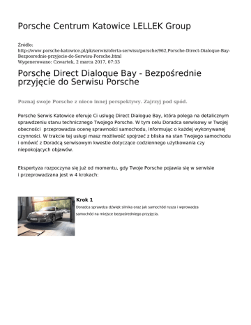 Porsche Centrum Katowice LELLEK Group Źródło: http://www.porsche-katowice.pl/pk/serwis/oferta-serwisu/porsche/962,Porsche-Direct-Dialoque-BayBezposrednie-przyjecie-do-Serwisu-Porsche.html Wygenerowano: Czwartek, 2 marca 2017, 07:33 Porsche Direct Dialoque Bay - Bezpośrednie przyjęcie do Serwisu Porsche Poznaj swoje Porsche z nieco innej perspektywy. Zajrzyj pod spód. Porsche Serwis Katowice oferuje Ci usługę Direct Dialogue Bay, która polega na detalicznym sprawdzeniu stanu technicznego Twojego Porsche. W tym celu Doradca serwisowy w Twojej obecności przeprowadza ocenę sprawności samochodu, informując o każdej wykonywanej czynności. W trakcie tej usługi masz możliwość spojrzeć z bliska na stan Twojego samochodu i omówić z Doradcą serwisowym kwestie dotyczące codziennego użytkowania czy niepokojących objawów. Ekspertyza rozpoczyna się już od momentu, gdy Twoje Porsche pojawia się w serwisie i przeprowadzana jest w 4 krokach: Krok 1 Doradca sprawdza dźwięk silnika oraz jak samochód rusza i wprowadza samochód na miejsce bezpośredniego przyjęcia. Krok 2 Doradca sprawdza funkcje we wnętrzu samochodu, takie jak: - sprawność przełączników i przycisków, - sprawność oświetlenia wewnątrz samochodu, - kontrola zestawu wskaźników, Po tym samochód zostaje poddany ocenie sprawności w zakresie: - oświetlenia zewnętrznego, - poziomu płynów, - uszkodzeń szyb, - zużycia piór wycieraczek, - uszkodzeń uszczelek; osłon, - kompletności wyposażenia związanego z bezpieczeństwem np. trójkąt ostrzegawczy. Krok 3 Następnie samochód zostaje podniesiony na podnośniku do połowy wysokości, aby umożliwić sprawdzenie stanu: - opon, - hamulców, - lakieru, - karoserii. Krok 4 Na końcu samochód podnoszony jest na platformie do samej góry i sprawdzane jest podwozie. Dokładnie wykonuje się oględziny: - układu wydechowego, - osłon podwozia, - elementów gumowych zawieszenia, - amortyzatorów, - komory silnika. Direct Dialogue Bay to usługa, dzięki której otrzymujesz kompletną diagnozę obecnego stanu technicznego Twojego Porsche wraz z listą wszystkich niezbędnych napraw oraz kosztem ich przeprowadzenia. Ponadto od Twojej decyzji zależy, w jakim zakresie serwis dokona naprawy. Skorzystaj z usługi i zarezerwuj termin wizyty. Zapraszamy do kontaktu z naszymi doradcami. Tweetnij