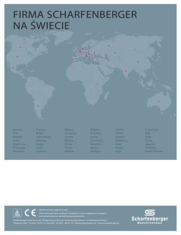 FIRMA SCHARFENBERGER NA ŚWIECIE Kanada USA Meksyk Chile Argentyna Portugalia Hiszpania Francja Belgia Luksemburg Holandia Anglia Dania Szwecja Niemcy Szwajcaria Austria Włochy Grecja Turcja Albania Bułgaria Rumunia Serbia Chorwacja Słowenia Węgry Słowacja Czechy Polska Ukraina Mołdawia Izrael Gruzja Rosja DIN EN ISO 9001:2008 97/23/WE Firma zastrzega sobie możliwość wystąpienia zmian związanych z rozwojem technologicznym bez uprzedniego powiadomienia. Scharfenberger GmbH & Co. KG / Philipp-Krämer-Ring 30 / Gewerbegebiet Bruch / D-67098 Bad Dürkheim Téléphone 0049 - (0) 6322 - 60 02 -0 / Fax 0049 - (0) 6322 - 60 02 -10 / [email protected] / www.scharfenberger.de Kazachstan RPA Indie Chiny Japonia Australia Nowa Zelandia Scharfenberger EuroPress EUROPRESS 3-60 HL FIRMY SCHARFENBERGER 3-60 hl EUROPRESS – GODNA TWOJEGO ZAUFANIA PONAD 45 LAT DOŚWIADCZENIA, KNOW HOW I INNOWACJI W PRASACH DO WINOGRON WYPOSAŻENIE • Wykonanie ze stali szlachetnej • Duży otwór zalewowy • W pełni automatyczny cyfrowy system sterowania z 12 zróżnicowanymi programami (do 80 poziomów ciśnienia) • Indywidualne programy (program Creamant etc.) • Zintegrowana sprężarka powietrza • Pompa próżniowa o wysokiej pojemności (również jako dmuchawa wstępna) • Tłumik akustyczny o wysokim stopniu absorpcji • • • • • Pracujący powoli silnik napędzający z biegiem w stronę lewą i prawą Wykonane ze stali szlachetnej zbiorniki na sok o wysokiej pojemności Tryb napełniania jako pochylanie, obracanie przerywane lub stałe Elementy usuwające wytłoczyny pod membraną do szybkiego opróżniania prasy Specjalne mocowanie membrany 02 | 03 Sterowanie cyfrowe Łatwa dostępność do wszystkich agregatów/szafki rozdzielczej Centralne napełnianie Już pierwsza nasza prasa Europress w roku 1971 wytyczyła standard dla delikatnego przetwórstwa zbiorów. Stały rozwój, nieprzerwanie najwyższa jakość, najnowocześniejsza technologia, opracowane własne systemy sterowania, elastyczność oraz rzetelna obsługa klienta powodują, że nowa Europress ponownie wytycza standard dla delikatnego przetwórstwa. Nowa Europress wyróżnia się poprzez niesamowitą trwałość wartości i długowieczność, zastosowanie komponentów najwyższej jakości oraz wysoką przyjazność dla użytkownika, włącznie z systemem sterowania. OPCJE • • • • • • • • Silniki napędowe ze zmiennymi prędkościami obrotowymi (w zależności od modelu) Napełnianie centralne DN 80 / 100 / 125 Systemy oczyszczania Indywidualna regulacja wysokości stelaża Króciec zasypowy do całych owoców Platforma Różne systemy zbiorników na sok Uruchamiany pneumatycznie otwór zasypowy • • • • • Otwór zasypowy z uszczelnieniem pneumatycznym (zamykany system dualny) System transportu wytłoczyn Jednostki zdalnego sterowania Elektryczny układ napędowy oraz wiele więcej… P Membra Sprężone powietrze P na Dokładnie dopasowana membrana na ia ro ro hn w zc ko ier wa Pow Moszcz w ko wa na Pow i c erz hn ia Sok Duża powierzchnia odpływu soku z rowkami stożkowymi OTWARTY SYSTEM WYCISKANIA EUROPRESS MODEL P W przypadku otwartego systemu wyciskania kosz wyciskający jest w połowie wyposażony w drobne rowki stożkowe. Forma i rozkład rowków gwarantują najwyższą jakość soku i zapobiegają zatykaniu się otworów rowków. ZALETY • • • • delikatne wyciskanie duży otwór zasypowy łatwe oczyszczanie krótkie czasy wyciskania dzięki dużej powierzchni odpływu soku DANE TECHNICZNE SYSTEMÓW WYCISKANIA SCHARFENBERGER UCHWYT MEMBRANY Specjalne mocowanie membrany umożliwia najszybszą zmianę membrany i redukuje obrót okruchów do minimum 04 | 05 P Sprężone powietrze P Pneumatycznie uszczelniane drzwi Membra na Moszcz < Kanały na sok > Wewnętrzne kanały na sok < Króciec wypływowy Sok Wyloty na sok ZAMKNIĘTY SYSTEM WYCISKANIA EUROPRESS MODEL T W przypadku zamkniętego systemu wyciskania kosz wyciskający dysponuje rozkładanymi lub wyciąganymi wewnętrznymi kanałami na sok wyposażonymi w drobne rowki. Sok poprzez kanały wylotowe przedostaje się do zbiornika na sok. ZALETY • • • • delikatne wyciskanie duże powierzchnie odlewowe znakomity dla maceracji i przeznaczony do fermentacji moszczu łatwe oczyszczanie rozkładanych lub wyjmowanych wewnętrznych kanałów na sok POZYCJA WYCISKANIA POZYCJA OCZYSZCZANIA KANAŁ WTYKOWY DO 3-42 HL • łatwy demontaż KANAŁ ROZKŁADANY DO 52-60 HL • duża powierzchnia • łatwe otwieranie odpływu soku • oczyszczanie bez • łatwe oczyszczanie demontażu POZYCJA OCZYSZCZANIA • duża POZYCJA WYCISKANIA powierzchnia odpływu soku P MEMBR SPRĘŻONE POWIETRZE P P MEMBR ANA SPRĘŻONE POWIETRZE P ANA MOSZCZ MOSZCZ < KANAŁY NA SOK < KANAŁY NA SOK < KRÓCIEC WYPŁYWOWY SOK SOK Dualny system wyciskania z i bez zewnętrznych kanałów na sok DUALNY SYSTEM WYCISKANIA EUROPRESS MODEL S Jako pierwszy producent pras do winogron polecamy dualny system wyciskający łączący zalety otwartego i zamkniętego systemu w jednym. W ten sposób możliwe jest wyciskanie w zależności od potrzeby: w systemie otwartym lub zamkniętym. Montaż i demontaż kanałów na sok umieszczonych na zewnątrz na koszu wyciskającym montowane i demontowane są za pomocą kilku uchwytów, co gwarantuje długotrwałą elastyczność w zakresie wyboru systemu wyciskania. ZALETY • • • • System ten jednoczy zalety systemu otwartego i zamkniętego łatwy demontaż kanałów na sok znajdujących się na zewnątrz długotrwała elastyczność w zakresie wyboru systemu wyciskania łatwe oczyszczanie DANE TECHNICZNE Model Pojemność kosza Objętość zasypu”1 Długość *1 w zależności od modelu, rodzaju winogron, procesu napełniania rodzaju moszczu oraz stanu i dojrzałości zbiorów. Dane dotyczące modeli i dane techniczne nie są wiążące. * 2 Model T * 3 Drzwi przesunięte na bok * 4 Opcja l całe winogrona kg winogrona po usunięciu