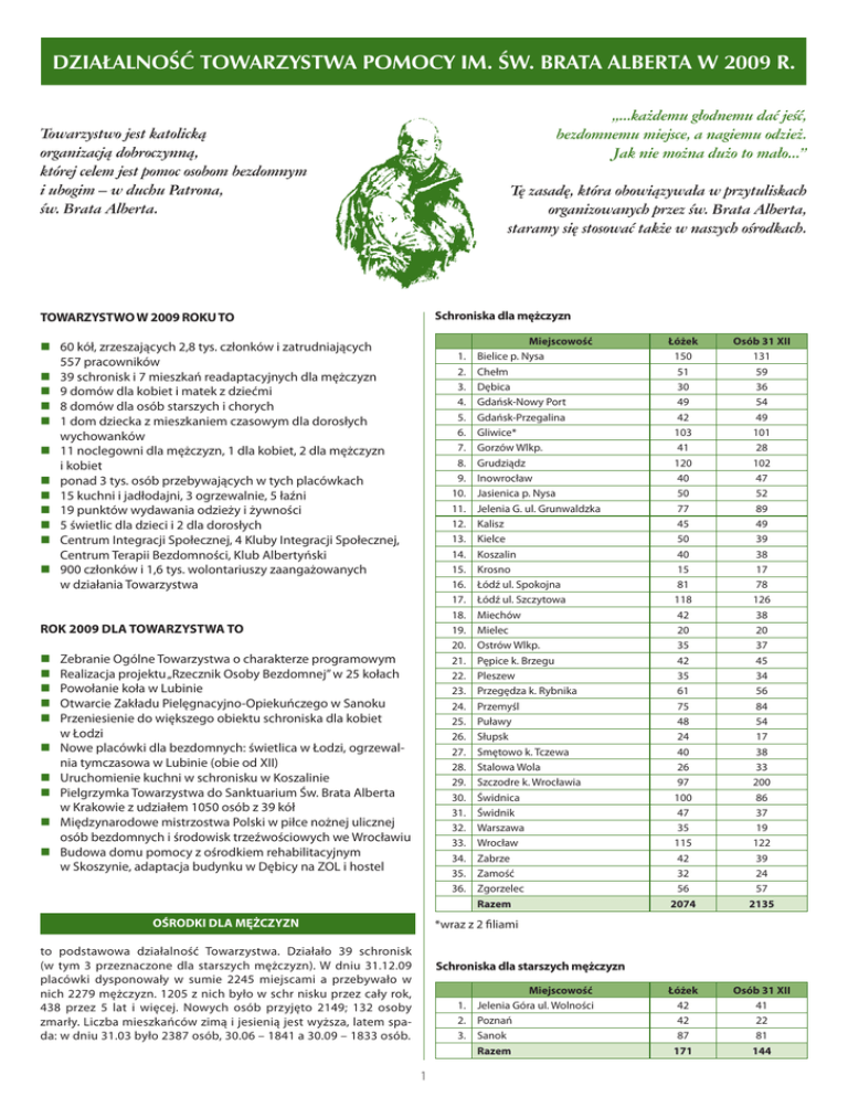 DZIAŁALNOŚĆ TOWARZYSTWA POMOCY IM. ŚW. BRATA ALBERTA W 2009 R. „...każdemu głodnemu dać jeść, bezdomnemu miejsce, a nagiemu odzież. Jak nie można dużo to mało...” Towarzystwo jest katolicką organizacją dobroczynną, której celem jest pomoc osobom bezdomnym i ubogim – w duchu Patrona, św. Brata Alberta. Tę zasadę, która obowiązywała w przytuliskach organizowanych przez św. Brata Alberta, staramy się stosować także w naszych ośrodkach. Schroniska dla mężczyzn TOWARZYSTWO W 2009 ROKU TO n n n n n n n n n n n n 60 kół, zrzeszających 2,8 tys. członków i zatrudniających 557 pracowników 39 schronisk i 7 mieszkań readaptacyjnych dla mężczyzn 9 domów dla kobiet i matek z dziećmi 8 domów dla osób starszych i chorych 1 dom dziecka z mieszkaniem czasowym dla dorosłych wychowanków 11 noclegowni dla mężczyzn, 1 dla kobiet, 2 dla mężczyzn i kobiet ponad 3 tys. osób przebywających w tych placówkach 15 kuchni i jadłodajni, 3 ogrzewalnie, 5 łaźni 19 punktów wydawania odzieży i żywności 5 świetlic dla dzieci i 2 dla dorosłych Centrum Integracji Społecznej, 4 Kluby Integracji Społecznej, Centrum Terapii Bezdomności, Klub Albertyński 900 członków i 1,6 tys. wolontariuszy zaangażowanych w działania Towarzystwa 1. 2. 3. 4. 5. 6. 7. 8. 9. 10. 11. 12. 13. 14. 15. 16. 17. 18. 19. 20. 21. 22. 23. 24. 25. 26. 27. 28. 29. 30. 31. 32. 33. 34. 35. 36. ROK 2009 DLA TOWARZYSTWA TO n n n n n n n n n n Zebranie Ogólne Towarzystwa o charakterze programowym Realizacja projektu „Rzecznik Osoby Bezdomnej” w 25 kołach Powołanie koła w Lubinie Otwarcie Zakładu Pielęgnacyjno-Opiekuńczego w Sanoku Przeniesienie do większego obiektu schroniska dla kobiet w Łodzi Nowe placówki dla bezdomnych: świetlica w Łodzi, ogrzewalnia tymczasowa w Lubinie (obie od XII) Uruchomienie kuchni w schronisku w Koszalinie Pielgrzymka Towarzystwa do Sanktuarium Św. Brata Alberta w Krakowie z udziałem 1050 osób z 39 kół Międzynarodowe mistrzostwa Polski w piłce nożnej ulicznej osób bezdomnych i środowisk trzeźwościowych we Wrocławiu Budowa domu pomocy z ośrodkiem rehabilitacyjnym w Skoszynie, adaptacja budynku w Dębicy na ZOL i hostel OŚRODKI DLA MĘŻCZYZN Miejscowość Bielice p. Nysa Chełm Dębica Gdańsk-Nowy Port Gdańsk-Przegalina Gliwice* Gorzów Wlkp. Grudziądz Inowrocław Jasienica p. Nysa Jelenia G. ul. Grunwaldzka Kalisz Kielce Koszalin Krosno Łódź ul. Spokojna Łódź ul. Szczytowa Miechów Mielec Ostrów Wlkp. Pępice k. Brzegu Pleszew Przegędza k. Rybnika Przemyśl Puławy Słupsk Smętowo k. Tczewa Stalowa Wola Szczodre k. Wrocławia Świdnica Świdnik Warszawa Wrocław Zabrze Zamość Zgorzelec Razem Łóżek 150 51 30 49 42 103 41 120 40 50 77 45 50 40 15 81 118 42 20 35 42 35 61 75 48 24 40 26 97 100 47 35 115 42 32 56 2074 Osób 31 XII 131 59 36 54 49 101 28 102 47 52 89 49 39 38 17 78 126 38 20 37 45 34 56 84 54 17 38 33 200 86 37 19 122 39 24 57 2135 Łóżek 42 42 87 171 Osób 31 XII 41 22 81 144 *wraz z 2 filiami to podstawowa działalność Towarzystwa. Działało 39 schronisk (w tym 3 przeznaczone dla starszych mężczyzn). W dniu 31.12.09 placówki dysponowały w sumie 2245 miejscami a przebywało w nich 2279 mężczyzn. 1205 z nich było w schr nisku przez cały rok, 438 przez 5 lat i więcej. Nowych osób przyjęto 2149; 132 osoby zmarły. Liczba mieszkańców zimą i jesienią jest wyższa, latem spada: w dniu 31.03 było 2387 osób, 30.06 – 1841 a 30.09 – 1833 osób. Schroniska dla starszych mężczyzn Miejscowość 1. Jelenia Góra ul. Wolności 2. Poznań 3. Sanok Razem PRACA OPIEKUŃCZO-WYCHOWAWCZA n praca Mieszkańcy pracują w schronisku, przy pozyskiwaniu środków dla schroniska oraz na rzecz miejscowej społeczności. Utrzymują porządek w schronisku i otoczeniu, pracują w kuchni, kotłowni, pralni, wykonują konserwacje i bieżące remonty budynków. Modernizują i rozbudowują swoje placówki. W Bielicach produkują koperty. W 7 schroniskach uprawiali ogrody warzywne; w 2 uprawiali własne pole, w 4 schroniskach hodowali trzodę. Pracują w hurtowniach i sklepach w zamian za potrzebne w schronisku artykuły, w lesie - za opał, u rolników – za płody rolne lub użyczenie maszyn. Wykonywali prace porządkowe na cmentarzach, ulicach, parkach, przystankach, targowiskach. Na wrocławskim cmentarzu wymienili 100 zniszczonych krzyży. Pomagali swoją pracą parafiom, placówkom pomocy społecznej i służby zdrowia, szkołom, sąsiadom. Brali udział w kwestach. Uczestniczyli w zbiórkach żywności i pracowali przy dystrybucji żywności, m. in. z UE w ramach PEAD. Pomagali przy organizacji imprez miejskich (Przemyśl), wigilii dla samotnych (Koszalin, Pleszew), półkolonii (Chełm). W J. Górze opiekowali się wieżą widokową. W Łodzi byli w obsłudze autobusu i świetlicy dla bezdomnych, w Słupsku w obsłudze ogrzewalni. n zaspokojenie podstawowych potrzeb bytowych nocleg, 3 posiłki, odzież, środki higieny. n pomoc lekarska W 11 schroniskach działały gabinety lekarskie, w których udzielono 5 tys. porad (w tym 2,3 tys. w Łodzi). Pozostałe schroniska kierowały chorych do publicznych przychodni. 711 osób przebywało w szpitalach, 34 w sanatoriach. n opieka duszpasterska W 23 schroniskach są kaplice, w tym 12 z Najśw. Sakramentem. 30 schronisk było objętych opieką kapelana – księdza z parafii lub zakonu. W schroniskach w Inowrocławiu i Pępicach kapelani byli codziennie, w Sanoku 4 razy w tygodniu, w Przemyślu 2 razy w tygodniu; w 14 domach byli raz na tydzień, w 12 raz lub 2 razy na miesiąc. Msze Św. były odprawiane w 27 domach: w 2-ch codziennie, w 12-tu co tydzień, w 9ciu raz lub dwa razy w miesiącu. W 4 domach kilka razy w roku. Z reguły uroczyście obchodzone jest święto naszego Patrona. W 28 schroniskach odbyły się rekolekcje wielkopostne i w 25 adwentowe. Prawie wszędzie była codzienna wspólna modlitwa, rano lub przed obiadem. W 17 schroniskach odbywały s