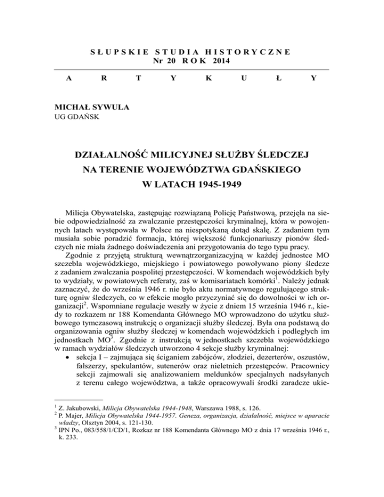 Działalność gdańskiego... S Ł U P milicyjnej S K I E służby S T śledczej U D I na A terenie H I Swojewództwa TORYC ZNE 195 Nr 20 R O K 2014 A R T Y K U Ł Y MICHAŁ SYWULA UG GDAŃSK DZIAŁALNOŚĆ MILICYJNEJ SŁUŻBY ŚLEDCZEJ NA TERENIE WOJEWÓDZTWA GDAŃSKIEGO W LATACH 1945-1949 Milicja Obywatelska, zastępując rozwiązaną Policję Państwową, przejęła na siebie odpowiedzialność za zwalczanie przestępczości kryminalnej, która w powojennych latach występowała w Polsce na niespotykaną dotąd skalę. Z zadaniem tym musiała sobie poradzić formacja, której większość funkcjonariuszy pionów śledczych nie miała żadnego doświadczenia ani przygotowania do tego typu pracy. Zgodnie z przyjętą strukturą wewnątrzorganizacyjną w każdej jednostce MO szczebla wojewódzkiego, miejskiego i powiatowego powoływano piony śledcze z zadaniem zwalczania pospolitej przestępczości. W komendach wojewódzkich były to wydziały, w powiatowych referaty, zaś w komisariatach komórki1. Należy jednak zaznaczyć, że do września 1946 r. nie było aktu normatywnego regulującego strukturę ogniw śledczych, co w efekcie mogło przyczyniać się do dowolności w ich organizacji2. Wspomniane regulacje weszły w życie z dniem 15 września 1946 r., kiedy to rozkazem nr 188 Komendanta Głównego MO wprowadzono do użytku służbowego tymczasową instrukcję o organizacji służby śledczej. Była ona podstawą do organizowania ogniw służby śledczej w komendach wojewódzkich i podległych im jednostkach MO3. Zgodnie z instrukcją w jednostkach szczebla wojewódzkiego w ramach wydziałów śledczych utworzono 4 sekcje służby kryminalnej: • sekcja I – zajmująca się ściganiem zabójców, złodziei, dezerterów, oszustów, fałszerzy, spekulantów, sutenerów oraz nieletnich przestępców. Pracownicy sekcji zajmowali się analizowaniem meldunków specjalnych nadsyłanych z terenu całego województwa, a także opracowywali środki zaradcze ukie——————— 1 Z. Jakubowski, Milicja Obywatelska 1944-1948, Warszawa 1988, s. 126. 2 P. Majer, Milicja Obywatelska 1944-1957. Geneza, organizacja, działalność, miejsce w aparacie władzy, Olsztyn 2004, s. 121-130. 3 IPN Po., 083/558/1/CD/1, Rozkaz nr 188 Komendanta Głównego MO z dnia 17 września 1946 r., k. 233. 196 Michał Sywula runkowane na minimalizację zjawisk sprzyjających przestępczości. Sprawowali jednocześnie ścisły nadzór nad prowadzeniem szczególnie skomplikowanych dochodzeń. W praktyce wyglądało to tak, że z chwilą wpłynięcia meldunku referent zapoznawał się z jego treścią i opracowywał plan prowadzenia sprawy, nadzorując jednocześnie prawidłowość podejmowanych decyzji. Pilnował także, aby sprawy, w których nie wyczerpano wszystkich możliwości śledczych nie były kierowane do umorzenia; • sekcja II (rozpoznawczo-daktyloskopijna, statystyki i kartotek) – oprócz sporządzania wykazów statystycznych i registratury daktyloskopijnej prowadziła także arkusze informacyjne zawodowych przestępców, tzw. dossier4, oraz kartotekę osób poszukiwanych i dokumentów zaginionych. Referenci sekcji zajmowali się także poszukiwaniem osób zaginionych i identyfikacją zwłok osób nierozpoznanych. Do zadań sekcji należała również kontrola osób przedterminowo zwolnionych. W sekcji przechowywano fotografie przestępców, dowody rzeczowe oraz skorowidze rzeczy skradzionych, zgubionych i znalezionych; • sekcja III (naukowej ekspertyzy) – zajmująca się wykonywaniem fotografii na miejscu zdarzenia oraz analizowaniem znalezionych śladów i odcisków; • sekcja IV (operacyjna) – prowadząca dochodzenia w ważniejszych wypadkach na terenie województwa, dokonywała inwigilacji osób lub miejsc podejrzanych oraz prowadziła pościg za szczególnie niebezpiecznymi przestępcami5. W komendach powiatowych istniały referaty śledcze składające się z szefa referatu i odpowiedniej liczby funkcjonariuszy. Milicjanci śledczy działający na „obcym” terenie zobowiązani byli zameldować powyższy fakt właściwemu komendantowi, który z kolei miał obowiązek udzielić im wszelkiej pomocy w ludziach i sprzęcie. W razie niedopełnienia tej formalności, co możliwe było jedynie w uzasadnionych okolicznościach, należało złożyć raport swojemu zwierzchnikowi, który następnie przedkładał go komendantowi wojewódzkiemu. Instrukcja śledcza wprowadzała obowiązek organizowania codziennych odpraw dla wszystkich będących na służbie funkcjonariuszy. W ich trakcie dokonywano rozdziału służby, przyjmowano sprawozdania, zapoznawano się z rozkazami i okólnikami oraz podobiznami osób poszukiwanych. Wprowadzono także zarządzane przez dyżurnego komendy całodobowe pogotowie, którego stan zależny był od potrzeb ustalanych przez szefa wydziału lub sekcji. Z reguły jednak w jego skład wchodziło kilku funkcjonariuszy6. ——————— 4 Był to wykaz zarejestrowanych przestępców zawodowych i szczegółów dotyczących ich życia. Gromadzono w nim różnego rodzaju dokumenty, takie jak: wyciąg z aktu urodzenia, odpisy kart karnych lub wyroków, artykuły prasowe odnoszące się do danego przestępcy, fotografie, odciski linii papilarnych, a nawet przechwycone grypsy. 5 IPN Po., 083/558/1/CD/1, Tymczasowa instrukcja o organizacji ogniw śledczych w Milicji Obywatelskiej, k. 235-278; P. Majer, Milicja Obywatelska 1944-1957…, s. 131. 6 IPN Po., 083/558/1/CD/1, Tymczasowa instrukcja o organizacji ogniw śledczych w Milicji Obywatelskiej, k. 235-278. Działalność milicyjnej służby śledczej na terenie województwa gdańskiego... 197 Nie udało się ustalić dokładnej daty powstania wydziału śledczego KW MO w Gdańsku. Z analizy rozkazów personalnych wynika jednak, że nastąpiło to najprawdopodobniej w maju 1945 r., bowiem wtedy przyjęci zostali do niego pierwsi funkcjonariusze. W skład omawianego wydziału, w okresie, gdy nie obowiązywała jesz