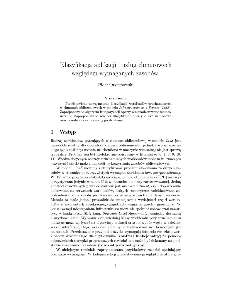 Klasykacja aplikacji i usªug chmurowych wzgl¦dem wymaganych zasobów. Piotr Orzechowski Streszczenie Przedstawiono now¡ metod¦ klasykacji workloadów uruchamianych w chmurach obliczeniowych w modelu Infrastructure as a Service (IaaS ). Zaproponowano algorytm kategoryzacji oparty o nienadzorowane metody uczenia. Zaproponowano równiez klasykator oparty o sie¢ neuronow¡ oraz przedstawiono wyniki jego dziaªania. 1 Wst¦p Rodzaj workloadów pracuj¡cych w chmurze obliczeniowej w modelu IaaS jest niezwykle istotny dla operatora chmury obliczeniowej, jednak rozpoznanie jakiego typu aplikacja zostaªa uruchomiona w maszynie wirtualnej nie jest spraw¡ trywialn¡. Problem ten byª wielokrotnie opisywany w literaturze [6, 7, 8, 9, 10, 11]. Wiedza dotycz¡ca rodzaju uruchamianych workloadów mo»e m.in. znacz¡co przyczyni¢ si¦ do maksymalizacji wykorzystania zasobów obliczeniowych. W modelu IaaS mo»emy zidentykowa¢ problem alokowania za du»ych zasobów w stosunku do rzeczywistych wymaga« workloadu tzw. overprovisioning. W [12] autor przytacza statystyki mówi¡ce, »e moc obliczeniowa (CPU) jest wykorzystywana jedynie w okoªo 36% w stosunku do mocy zarezerwowanej. Jedn¡ z metod stosowanych przez dostawców jest overcommitment, czyli dopuszczenie alokowania na serwerach workloadów, których sumaryczne zadeklarowane zapotrzebowanie na zasoby jest wi¦ksze ni» istniej¡ce zasoby na danym serwerze. Metoda ta mo»e jednak prowadzi¢ do zmniejszenia wydajno±ci cz¦±ci workloadów w momentach zwi¦kszonego zapotrzebowania na zasoby przez inne. W konsekwencji udost¦pniana infrastruktura mo»e nie speªnia¢ zobowi¡za« zawartycg w konkraktcie SLA (ang. Software Level Agreement) pomi¦dzy dostawc¡ a u»ytkownikiem. Wybranie odpowiedniej klasy workloadu przy uruchamianiu maszyny mo»e wpªywa¢ na algorytmy alokacji oraz na wybór w¦zªa w zale»no±ci od interferencji tego workloadu z innymi worklaodami uruchomionymi ju» na hostach. Przedstawione przypadki u»ycia wymagaj¡ istnienia rozdziaªu workloadów zrozumiaªego dla u»ytkownika (rozdziaª funkcjonalny).Za pomoc¡ odpowiednich narz¦dzi programowych rozdziaª ten mo»e by¢ dokonany na podstawie zu»ywanych zasobów (rozdziaª parametryczny). W niniejszym rozdziale zaproponowano przykªadowy rozdziaª speªniaj¡cy powy»sze wymaganie. W kolejnej sekcji przedstawiono przegl¡d literatury pre1 zentuj¡cy ró»ne podej±cia do rozdziaªu workloadów. W sekcji 3 zaprezentowano wykonanie eksperymentów kategoryzacji workloadów metodami nienadzorowanymi. Sekcja 4 opisuje proponowany algorytm klasykacji oraz jego implentacj¦ (4.2), a tak»e wyniki dziaªania klasykatora (4.3) . W ostatniej sekcji 5 podsumowano przeprowadzone prace i zaproponowano dalsze kierunki rozwoju klasykatora. 2 Metody klasykowania workloadów W literaturze istnieje kilka podej±¢ do kategoryzacji workloadów interesuj¡ce z punktu widzenia opisywanego problemu. Poni»ej przedstawiono wybrane przykªady. Jedn¡ z opisywanych w literaturze metod jest grupowanie workloadów bior¡c pod uwag¦ jedynie gªówny zasób, który jest wykorzystywany. I tak mo»na wyró»ni¢ workloady wykorzystuj¡ce gªównie procesor CPU-intensive i pasmo pami¦ci masowej IO-intensive. Przykªad takiego podej±cia zaprezentowano w [9], w którym autorzy opisuj¡ asymetrycn¡ metod¦ alokowania workloadów, w której wykorzystuje si¦ te dwie klasy workloadów. Bardziej rozbudowan¡ klasykacj¦ zaproponowano w [7], gdzie dodano nast¦pne klasy workloadów: memory-intensive oraz network-intensive. Zaproponowany podziaª zostaª wykorzystany do identykowania workloadów dziaªaj¡cych na maszynach wirtualnych. Na zbiorze testowym uzyskano 95% poprawno±ci klasykacji workloadów do odpowiedniej klasy. Podobne podej±cie do kategoryzacji workloadów zorientowane na metryki sprz¦towe przedstawiono w [8]. Zaprezentowano metod¦ wykorzystuj¡c¡ nast¦puj¡ce parametry: CPU_System/User (zu»ycie procesora przez system/u»ytkownika), Bytes_In/Out (bajty wysªane/odebrane przez sie¢), IO_BI/BO (bloki zapisane/odczytane na urz¡dzenia IO), Swap_In/Out (rozmiar pami¦ci zapisany i odczytany z urz¡dze« magazynuj¡cych). Metryki byªy wykorzystywane przez algorytm szeregowania zada« w systemach rozproszonych. Kategoryzacji dokonano przy pomocy dwóch algorytmów PCA i k-means. Inn¡ metod¡ klasykacji jest ich funkcjonalno±¢. W [10] autorzy proponuj¡ nast¦puj¡c¡ klasykacj¦: serwery aplikacyjne, bazy danych, serwery plików. Do okre±lenia przydziaªu do klas zastosowano metryki sprz¦towe takie jak: wykorzystanie CPU i pami¦ci oraz opó¹nienie operacji wej±cia/wyj±cia. Zaproponowano dwie metody klasykacji: jedno w oparciu o algorytm SVM a drugi o sie¢ neuronow¡. Kolejny przykªad klasykacji funkcjonalnej zaproponowano w [11]. Autorzy wyró»nili nast¦puj¡ce klasy worklodów: w stanie idle, transakcyjne bazy danych, serwery plików, naukowe, serwery aplikacyjne. Zaproponowana klasykacja zostaªa wykorzystana w algorytmach wydajnej migracji maszyn w czasie rzeczywistym. Powy»sze rozwi¡zania pokazuj¡ pewne mo»liwo±ci klasykacji workloadów jednak »aden z nich nie obejmuje szerszej grupy ró»nych typów workloadów funkcjnonalnych. Cz¦sto s¡ one ukierunkowane na pojedyncz¡ kategori¦ lub 2 dwie/trzy kategorie funkcjonalne. Rozwi¡zanie przedstawione w dalszej cz¦±ci eliminuje te ograniczenia. 3 Kategoryzacja workloadów metodami nienadzorowanymi Budowa algorytmu kategoryzacji workloadów wymagaªa zdeniowania kryterium klasykacji funkcjonalnej, a nast¦pnie monitorowania danych o zachowaniu i wykorzystaniu zasobów obliczeniowych przez workloady ró»nych typów. Metoda doboru i proponowany podziaª funkcjonalny zostaª przedstawiony w rozdziale 3, gdzie zostaªy wyró»nione nast¦puj¡ce klasy: bigdata, caching, oltp, science, streaming i webserving. Dane do eksperymentów zostaªy zgormadzone w ramach emulacji zachowania workloadów opisanych w rozdziale 5. I
