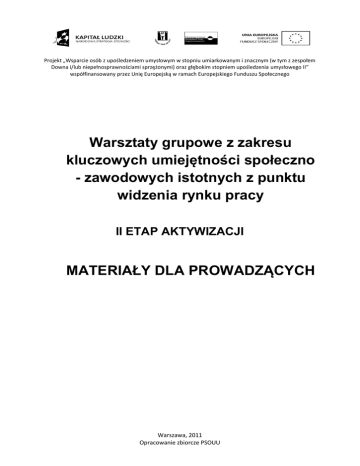 Projekt „Wsparcie osób z upośledzeniem umysłowym w stopniu umiarkowanym i znacznym (w tym z zespołem Downa i/lub niepełnosprawnościami sprzężonymi) oraz głębokim stopniem upośledzenia umysłowego II” współfinansowany przez Unię Europejską w ramach Europejskiego Funduszu Społecznego Warsztaty grupowe z zakresu kluczowych umiejętności społeczno - zawodowych istotnych z punktu widzenia rynku pracy II ETAP AKTYWIZACJI MATERIAŁY DLA PROWADZĄCYCH Warszawa, 2011 Opracowanie zbiorcze PSOUU Projekt „Wsparcie osób z upośledzeniem umysłowym w stopniu umiarkowanym i znacznym (w tym z zespołem Downa i/lub niepełnosprawnościami sprzężonymi) oraz głębokim stopniem upośledzenia umysłowego II” współfinansowany przez Unię Europejską w ramach Europejskiego Funduszu Społecznego DZIEŃ 1 Temat warsztatów: Gra emocji czyli wpływ emocji na nasze życie 1 POWITANIE CZAS: MATERIAŁY: 10 min Brak CEL: Przedstawienie tematyki zajęć danego dnia, metod ich realizacji i ram organizacyjno - czasowych METODA PRACY: Mini wykład trenera OPIS: Prowadzący przedstawia uczestnikom co będzie przedmiotem całego podaje temat dnia i ramy organizacyjno - czasowe; przypomina warunki ustalonego kontraktu; UWAGI: Dla ułatwienia można przygotować prezentację lub plakat, na którym wyraźnie danego dnia będzie rozpisany rozkład dnia (ramy czasowe i poszczególne ćwiczenia). Pozwala to uczestnikom na pełną orientację oraz dotrzymywanie czasu przerw. 2 KONTRAKT CZAS: 30 min MATERIAŁY: Duży arkusz papieru, mazaki, taśma do przymocowania karty na ścianę CEL: Ustalenie zasad panujących na warsztatach METODA PRACY: Dyskusja w grupie OPIS: Prowadzący prosi grupę o sugestie dotyczące zasad panujących w grupie podczas warsztatów i zapisuje każdą z nich na tablicy. Sugestie - powinny zawierać, np.: aktywne uczestnictwo, uważnie słuchamy, wzajemnie się szanujemy, każdy ma prawo do własnego zdania, nie krytykujemy wypowiedzi innych członów grupy, wyłączamy telefony komórkowe, mówi tylko jedna osoba, wzajemnie się wspieramy, jesteśmy punktualni. Prowadzący pyta grupę, czy satysfakcjonuje ją taki zbiór zasad. Następnie przedyskutuje zasady kontrowersyjne i ustala, czy powinny znaleźć się na liście. Informuje grupę, że lista wywieszana będzie na początku każdego spotkania gwoli przypomnienia. UWAGI: Warszawa, 2011 Opracowanie zbiorcze PSOUU Projekt „Wsparcie osób z upośledzeniem umysłowym w stopniu umiarkowanym i znacznym (w tym z zespołem Downa i/lub niepełnosprawnościami sprzężonymi) oraz głębokim stopniem upośledzenia umysłowego II” współfinansowany przez Unię Europejską w ramach Europejskiego Funduszu Społecznego Im więcej zasad zostanie zaproponowanych przez uczestników, a mniej przez prowadzącego, tym lepiej. Prowadzący nie powinien osądzać propozycji, tylko po prostu je zapisywać 3 ĆWICZENIE – „MOJE EMOCJE” CZAS: MATERIAŁY: 30 min. 2 pudełka, kartki z wypisanymi sytuacjami, czyste kartki papieru, mazaki, duży arkusz papieru, taśma do przymocowania CEL: Uświadomienie uczestnikom, że emocje towarzyszą nam w codziennym życiu, w najbardziej nawet zwyczajnych sytuacjach METODA PRACY: Praca w parach OPIS: Prowadzący prosi uczestników o dobranie się w pary. Prezentuje 2 pudelka, w których są kartki z opisem sytuacji pozytywnych i negatywnych. „Z dwóch pudełek, które mam przed sobą każda para wylosuje po jednej kartce (w jednym pudełku znajdują się sytuacje, którym mogą towarzyszyć pozytywne emocje, a w drugim – negatywne). Na kartkach opisane są rożne wydarzenia jakie mogą nas spotkać w życiu. Waszym zadaniem będzie wypisanie emocji jakie mogą towarzyszyć temu wydarzeniu”. Każda para po wypisaniu emocji, które mogą towarzyszyć danej sytuacji ma się zastanowić w jaki sposób daną emocję można wyrazić. Następnie prowadzący omawia na forum z każdą parą emocje, które zapisali oraz sposoby wyrażania. Przy każdym omówieniu pyta pozostałą część grupy o opinie, sugestie, etc. Na podsumowanie może poprosić uczestników o próbę stworzenia własnej definicji emocji (należy ją wtedy zapisać w widocznym dla wszystkich miejscu) oraz zadać ogólne pytania: • W jaki sposób można wyrazić emocje? • Jak się czujecie po wyrażeniu emocji? Czy to w jakiś sposób pomaga? Jeśli tak to w czym? UWAGI: Przykłady sytuacji społecznych: 1.Sytuacje społeczne, które wzbudzają pozytywne emocje: • Rodzice kupili ci długo oczekiwany komputer. • Znalazłeś 100 złotych na ulicy. • Wygrałeś w konkursie wakacje nad ciepłe morze. • Sytuacje społeczne, które wzbudzają negatywne emocje: • Spieszysz się na spotkanie i ucieka ci autobus. • Robisz zakupy i przy kasie zorientowałeś się, że nie masz portfela. • Długo przygotowywałeś się do klasówki a mimo to dostajesz niską ocenę. Warszawa, 2011 Opracowanie zbiorcze PSOUU Projekt „Wsparcie osób z upośledzeniem umysłowym w stopniu umiarkowanym i znacznym (w tym z zespołem Downa i/lub niepełnosprawnościami sprzężonymi) oraz głębokim stopniem upośledzenia umysłowego II” współfinansowany przez Unię Europejską w ramach Europejskiego Funduszu Społecznego 4 ĆWICZENIE – „WYRAŻANIE I ODCZYTYWANIE EMOCJI” CZAS: MATERIAŁY: 30 min. Duzy arkusz papieru, mazaki, kartki papieru dla uczestników, pisaki CEL: Doskonalenie umiejętności nazywania emocji i określania stanów emocjonalnych METODA PRACY: Praca indywidualna oraz grupowa OPIS: Prowadzący prosi aby uczestnicy podawali nazwy emocji, które znają. Zapisuje je na arkuszu papieru. Następnie numeruje wszystkie wypisane emocje. Rozdaje każdemu uczestnikowi mała kartkę papieru, na którą należy przepisać jedną z tych emocji. Prosi uczestników o odliczenie po kolei, począwszy od jednego i zapamiętanie swojego numeru. Następnie każda osoba ma przepisać na kartkę emocję o takim numerze jaki sama odliczyła 
