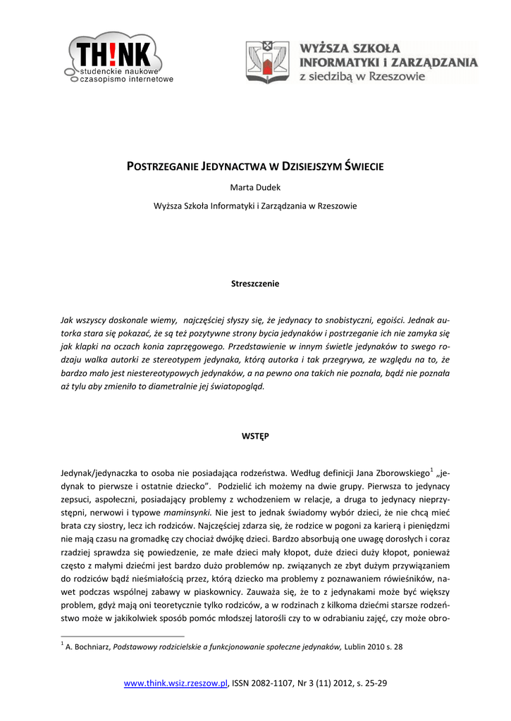 POSTRZEGANIE JEDYNACTWA W DZISIEJSZYM ŚWIECIE Marta Dudek Wyższa Szkoła Informatyki i Zarządzania w Rzeszowie Streszczenie Jak wszyscy doskonale wiemy, najczęściej słyszy się, że jedynacy to snobistyczni, egoiści. Jednak autorka stara się pokazad, że są też pozytywne strony bycia jedynaków i postrzeganie ich nie zamyka się jak klapki na oczach konia zaprzęgowego. Przedstawienie w innym świetle jedynaków to swego rodzaju walka autorki ze stereotypem jedynaka, którą autorka i tak przegrywa, ze względu na to, że bardzo mało jest niestereotypowych jedynaków, a na pewno ona takich nie poznała, bądź nie poznała aż tylu aby zmieniło to diametralnie jej światopogląd. WSTĘP Jedynak/jedynaczka to osoba nie posiadająca rodzeostwa. Według definicji Jana Zborowskiego1 „jedynak to pierwsze i ostatnie dziecko”. Podzielid ich możemy na dwie grupy. Pierwsza to jedynacy zepsuci, aspołeczni, posiadający problemy z wchodzeniem w relacje, a druga to jedynacy nieprzystępni, nerwowi i typowe maminsynki. Nie jest to jednak świadomy wybór dzieci, że nie chcą mied brata czy siostry, lecz ich rodziców. Najczęściej zdarza się, że rodzice w pogoni za karierą i pieniędzmi nie mają czasu na gromadkę czy chociaż dwójkę dzieci. Bardzo absorbują one uwagę dorosłych i coraz rzadziej sprawdza się powiedzenie, ze małe dzieci mały kłopot, duże dzieci duży kłopot, ponieważ często z małymi dziedmi jest bardzo dużo problemów np. związanych ze zbyt dużym przywiązaniem do rodziców bądź nieśmiałością przez, którą dziecko ma problemy z poznawaniem rówieśników, nawet podczas wspólnej zabawy w piaskownicy. Zauważa się, że to z jedynakami może byd większy problem, gdyż mają oni teoretycznie tylko rodziców, a w rodzinach z kilkoma dziedmi starsze rodzeostwo może w jakikolwiek sposób pomóc młodszej latorośli czy to w odrabianiu zajęd, czy może obro1 A. Bochniarz, Podstawowy rodzicielskie a funkcjonowanie społeczne jedynaków, Lublin 2010 s. 28 www.think.wsiz.rzeszow.pl, ISSN 2082-1107, Nr 3 (11) 2012, s. 25-29 Postrzeganie jedynactwa w dzisiejszym świecie nid przed innymi dziedmi. Ponadto często przy dwójce rodzeostwa, to starsze staje się swego rodzaju autorytetem dla młodszego. Kolejnym powodem mogą byd też problemy matek z zajściem w ciążę czy jej donoszeniem. Często rodzicom udaje się mied tylko jedno dziecko. Problemem nie pozwalającym na posiadanie wielu dzieci jest również status finansowy niektórych rodzin. Biedniejsze rodziny często chciałyby mied więcej niż jedno dziecko, lecz fakt, że nie mogłyby później zapewnid im odpowiedniego życia sprawia, że na kolejne się nie decydują. Równie często rodziny bez większego wytłumaczenia decydują się tylko na jedno dziecko. W dzisiejszych czasach zatem mamy do czynienia z częstym zjawiskiem modeli rodziny 2+1 tj. rodzice plus dziecko. Jednak niektórzy ludzie sceptycznie podchodzą do jedynaków. I właśnie o tym problemie traktuje tekst. O tym jak w kraju pełnym stereotypów, barier i ludzi „wszystko wiedzących” postrzega się jedynaków. Postaram się pokazad jak wygląda w oczach społeczeostwa jedynak i spróbuję zastanowid się nad tym, skąd wziął się stereotyp jedynaka i taka, a nie inna opinia o nim ludzi. Mimo, że coraz częściej da się zauważyd negatywne podejście do idei jedynactwa to będę chciała pokazad również pozytywne strony bycia jedynakiem, które niewątpliwe istnieją, lecz poprzez wszechobecny stereotyp jedynaka jako rasowego egoisty, samoluba, zapomina się o tym, że ludzie tacy wcale nie są aż tak pokrzywdzeni. Nie wszystko złoto, co się świeci, tak samo jak i nie każda blondynka jest głupia czy Niemka brzydka. Stereotypy czasem są bardzo krzywdzące, bo nie każdy musi byd taki jak stereotyp to przewiduje. ROZWINIĘCIE Na samym początku chciałabym zastrzec, iż nie jestem jedynaczką i to co tutaj zostanie napisane oparte będzie o literaturę i własne obserwacje. Jedynacy w powszechnej opinii to egocentrycy. Egocentryka charakteryzuje ogólne przekonanie, że cały świat kręci się wokół niego i wszyscy muszą byd jemu podporządkowani. Ocenia świat tylko z własnego punktu widzenia i nie interesuje się tym, że inny może myśled czy czud inaczej. Przyzwyczajony jest do tego, że on jest w domu jedynym dzieckiem, a rodzice cały swój czas i uwagę poświęcają właśnie jemu. Gdy dziecko takie idzie do przedszkola czy do szkoły, nadal chce byd w centrum zainteresowania, bo od zawsze tak było, ciężko mu jest przywyknąd do tego, że przykładowo w szkolnej klasie jest około trzydziestu dzieci, którym nauczyciel jednakowo musi poświęcid uwagę, a nie tylko naszemu jedynakowi. Często widad, że bardzo domagają się tej uwagi. Jedynak często postrzegany jest jako egoista. Egoizm według definicji encyklopedii PWN to „postawa życiowa charakteryzująca się dbałością o dobro i interesy własne, przeciwieostwo altruizmu”2. To człowiek, który myśli tylko o swoim JA, o swoich potrzebach. Najczęściej nie interesuje go to, czego chcą inni. Słyszy się o tym, że jedynacy uważają że wszystko im się należy i wszystko mogą mied, bo do tego przyzwyczaili ich rodzice. Z własnego doświadczenia mogę powiedzied, że zauważyłam, że ta cecha bardzo często występuje u jedynaków, przynajmniej u części tych, których miałam okazję poznad. Jedynacy często zamiast słów np. „Chciałbym mied ten rower” mówią „Będę miał ten rower”. To pierwsze powie człowiek najczęściej posiadający rodzeostwo myślący o różnych aspektach kupna tego roweru np. czy się przyda, czy rodzice akurat teraz mają pieniądze żeby kupid tak mu, bądź co 2 Encyklopedia PWN, Warszawa 2004 s. 193 26 Postrzeganie jedynactwa w dzisiejszym świecie bądź, drogą zabawkę. A jedynak powie, że będzie go miał, bo rodzice przyzwyczaili go do tego, że wszystko co chce, to b