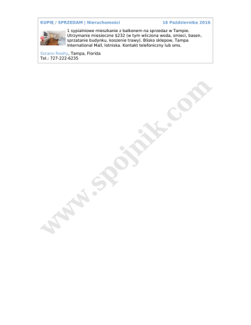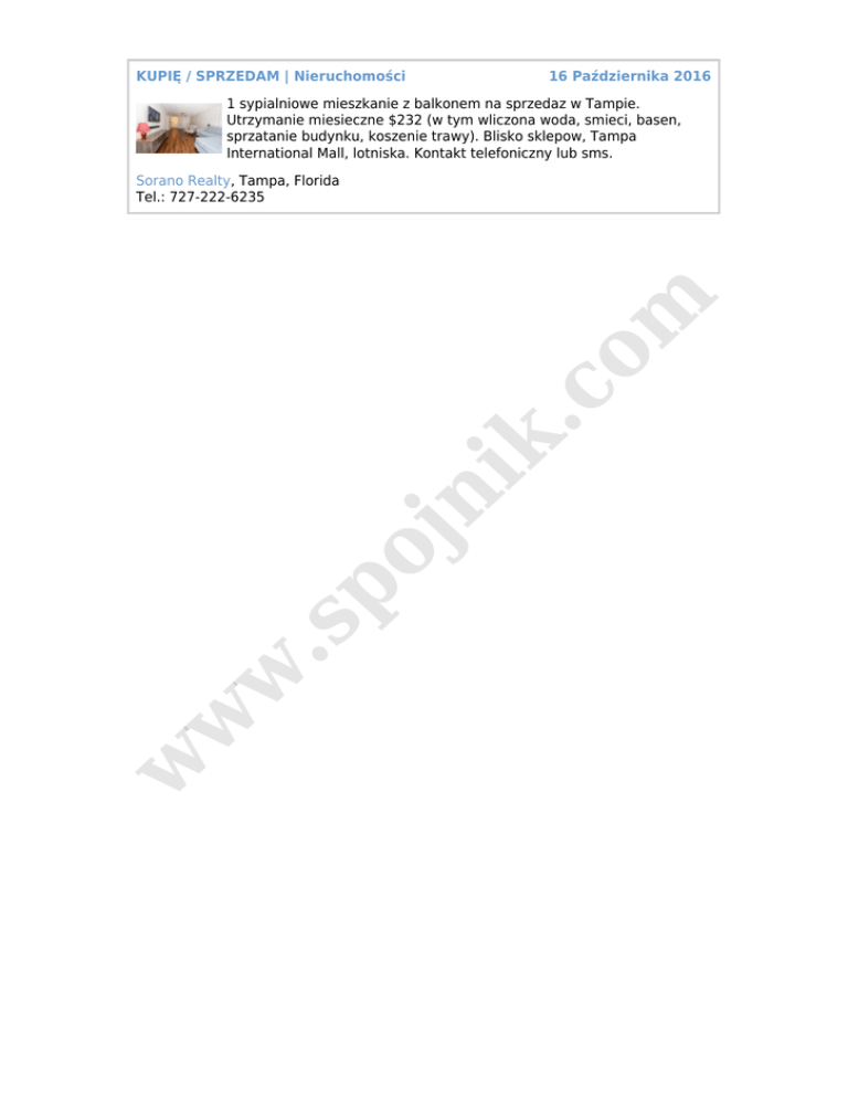 KUPIĘ / SPRZEDAM | Nieruchomości 16 Października 2016 1 sypialniowe mieszkanie z balkonem na sprzedaz w Tampie. Utrzymanie miesieczne $232 (w tym wliczona woda, smieci, basen, sprzatanie budynku, koszenie trawy). Blisko sklepow, Tampa International Mall, lotniska. Kontakt telefoniczny lub sms. w w w .s po jn ik .c o m Sorano Realty, Tampa, Florida Tel.: 727-222-6235
