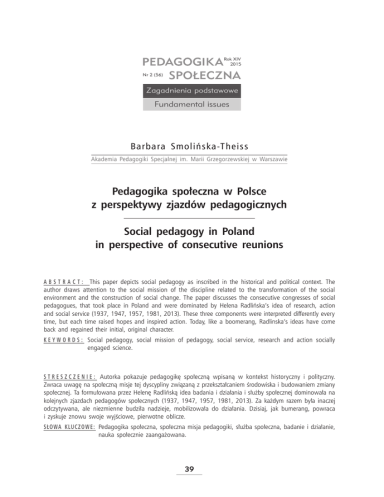 Rok XIV 2015 Nr 2 (56) Fundamental issues Barbara Smolińska-Theiss Akademia Pedagogiki Specjalnej im. Marii Grzegorzewskiej w Warszawie Pedagogika społeczna w Polsce z perspektywy zjazdów pedagogicznych Social pedagogy in Poland in perspective of consecutive reunions A b s t r a c t : This paper depicts social pedagogy as inscribed in the historical and political context. The author draws attention to the social mission of the discipline related to the transformation of the social environment and the construction of social change. The paper discusses the consecutive congresses of social pedagogues, that took place in Poland and were dominated by Helena Radlińska’s idea of research, action and social service (1937, 1947, 1957, 1981, 2013). These three components were interpreted differently every time, but each time raised hopes and inspired action. Today, like a boomerang, Radlinska’s ideas have come back and regained their initial, original character. K e y w o r d s : Social pedagogy, social mission of pedagogy, social service, research and action socially engaged science. S t r e s z c z e n i e : Autorka pokazuje pedagogikę społeczną wpisaną w kontekst historyczny i polityczny. Zwraca uwagę na społeczną misje tej dyscypliny związaną z przekształcaniem środowiska i budowaniem zmiany społecznej. Ta formułowana przez Helenę Radlińską idea badania i działania i służby społecznej dominowała na kolejnych zjazdach pedagogów społecznych (1937, 1947, 1957, 1981, 2013). Za każdym razem była inaczej odczytywana, ale niezmienne budziła nadzieje, mobilizowała do działania. Dzisiaj, jak bumerang, powraca i zyskuje znowu swoje wyjściowe, pierwotne oblicze. Słowa kluczowe: Pedagogika społeczna, społeczna misja pedagogiki, służba społeczna, badanie i działanie, nauka społecznie zaangażowana. 39 Barbara Smolińska-Theiss Nauka jest tworem społecznym – przekonywał ponad pół wieku temu John Ziman dowodząc, iż pracą naukową jest to, czym zajmuje się społeczność uczonych, a nauką to, na co się wspólnie zgadza (Ziman 1968, s. 41). Można przyjąć takie stwierdzenie jako pokłosie dyskusji między Logiką odkrycia naukowego Karla Poppera a Strukturą rewolucji naukowych Thomasa Kuhna, między krytycznym racjonalizmem a młodszą od niego filozofią nauki, wedle której rozwój dokonuje się przez przyjmowanie kolejnych pardygmatów. Nie wchodząc w szczegóły tej fundamentalnej dyskusji, jaka toczyła się zwłaszcza w zachodnich naukach społecznych, stanowisko Zimana brzmi nowatorsko, ale też i obrazoburczo. Ziman szczególną wagę przywiązuje do roli człowieka nauki i środowiska naukowego w rozwoju różnych dyscyplin akademickich. To środowisko naukowe decyduje „kogo należy słuchać, czyje poglądy jednomyślna opinia musi brać pod uwagę” (Ziman 1968, s. 113). W polskiej pedagogice prawie niewidoczna była dyskusja na temat filozofii nauki, paradygmatów pozytywistycznych i antypozytywistycznych, na temat zaangażowania społecznego nauki i naukowców. Z trudem i powoli przyjmowano pytania o rozwój, o postęp nauki, o różne drogi prowadzące do jej progresu lub regresu (Elias 2003, s. 137). Dzisiaj to pytanie stawia się znacznie wyraźniej i nabiera ono innego charakteru. Dotyczy nie tyle przyszłości, perspektyw rozwoju, sposobów uprawiania nauk społecznych, ale dostarcza również narzędzi do pokazania przeszłości. Można je potraktować jako heurystyczną matrycę rozpoznawania, rozumienia i wyjaśniania drogi, którą przeszła i podąża dalej polska pedagogika społeczna. Coraz wyraźniejsze, powszechniejsze, a nawet truistyczne staje się przekonanie o niekumulatywnym rozwoju nauki, o idiomatyczności, synergii, emergencji współczesnej pedagogiki (Kubinowski 2013). W tym procesie następuje różnorodne przekraczanie granic społecznych, metodologicznych, pojawiają się rożne bifurkacje, przełomy i przejścia. Na tym tle można postawić pytanie jak zmieniała się pedagogika społeczna w Polsce, jakie kolejne obrazy budowała, w jakim stopniu wpisywała się w historię polskich przewrotów i zmian. W jakim stopniu odbijała interesy różnych grup środowisk naukowych i ludzi, w jakim zaś czerpała ze swoich i obcych zasobów teoretycznych i metodologicznych. Odpowiedź ograniczy się jedynie do zasygnalizowania przełomów i bardzo schematycznego zarysowania kierunków i obrazów zmian. W tej krótkiej wersji będzie to wskazanie znaczących momentów wydarzeń w rozwoju tej dyscypliny. Będą się one odnosiły zarówno do zmian polityczno-społecznych wyznaczających kontekst funkcjonowania pedagogiki społecznej w Polsce, jak i do ważnych przełomowych zdarzeń, jakimi były kolejne zjazdy pedagogi40 Pedagogika społeczna w Polsce... ki społecznej, na których dokonywano zarówno prezentacji jak i obrachunku z tą dyscypliną (Theiss 2013). Społeczna misja pedagogiki społecznej Pedagogika społeczna w Polsce wyrastała z praktyki, była umiejscowiona w realnym świecie społecznym i skierowana ku temu światu. Miała służyć budowie lepszego jutra, poprawianiu warunków życia szerokich rzesz społecznych, a przede wszystkim rodzin z zaniedbanych środowisk robotniczych i wiejskich. Pedagogika społeczna przekształca środowisko siłami społecznymi w imię ideału – pisała prawie sto lat temu twórczyni tej dyscypliny – Helena Radlińska (Radlińska 1935, s. 19). Radlińska wierzyła w moc sprawczą nauki, wydawało jej się, że potrafi stworzyć dyscyplinę budującą lepszy świat. Wzorem pokolenia niepokornych intelektualistów przełomu wieków, sądziła iż drogą budowania i umacniania Rzeczypospolitej jest przede wszystkim szkoła i oświata. Stąd myśl Radlińskiej odczytuje się przede wszystkim w perspektywie zmian społecznych. Niektórzy skłonni są widzieć w niej głównie teorię przekształcania środowiska. Pedagogika społeczna Heleny Radlińskiej od początku ak