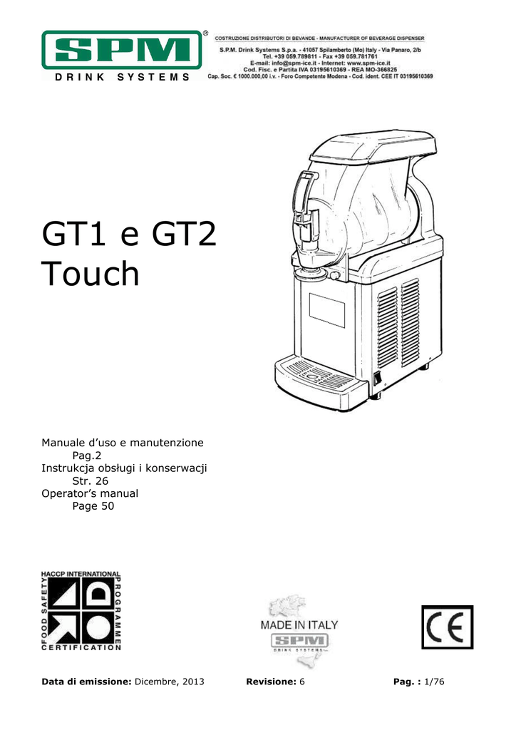 GT1 e GT2 Touch Manuale d’uso e manutenzione Pag.2 Instrukcja obsługi i konserwacji Str. 26 Operator’s manual Page 50 Data di emissione: Dicembre, 2013 Revisione: 6 Pag. : 1/76 INDICE 1. AVVERTENZE E CONSIGLI IMPORTANTI ......................................................................3 2. CORREDO DELL’APPARECCHIO ............3 3. INDICAZIONI UTILI PER IL TRASPORTO3 4. INDICAZIONI UTILI PER IL SOLLEVAMENTO .....................................3 5. SPECIFICHE TECNICHE ............................4 6. POSIZIONAMENTO ....................................5 7. COLLEGAMENTO ALLA RETE ELETTRICA ................................................6 8. OPERAZIONI DI AVVIAMENTO E MODALITA’ D’USO ..................................7 9. OPERAZIONI DI PULIZIA E SANITIZZAZIONE QUOTIDIANA ........14 10. MANUTENZIONE STRAORDINARIA ....21 Pulizia del condensatore ................................. 21 Controllo e sostituzione delle guarnizioni ...... 22 Stoccaggio invernale ....................................... 22 11. INFORMAZIONI UTILI SUI PREPARATI PER GELATO ...........................................23 12. ESCLUSIONE DI RESPONSABILITA’ ....23 13. GUIDA ALLA RISOLUZIONE DEI ..........24 14. WIRING DIAGRAM...................................73 Gentile Cliente, ci congratuliamo con Lei per aver scelto un prodotto di qualità che sicuramente risponderà alle Sue aspettative. RingraziandoLa per la preferenza accordataci, la invitiamo cortesemente a prendere attenta visione del presente manuale d’uso e manutenzione. Pubblicazione emessa da: SPM DRINK SYSTEMS S.p.a. Via Panaro n° 2 41057 Spilamberto (MO) Edizione: 12/2013 Revisione: 06 © 2013 – SPM Drink Systems Tutti i diritti di riproduzione del presente manuale sono riservati alla SPM DRINK SYSTEMS, la riproduzione anche parziale è vietata. Le descrizioni e le illustrazioni sono riferite alla specifica macchina/impianto in oggetto. SPM DRINK SYSTEMS si riserva il diritto di apportare in qualsiasi momento tutte le modifiche che riterrà opportune alla produzione di serie. Il presente manuale: è parte integrante della fornitura e deve essere letto attentamente al fine di un utilizzo corretto, in conformità ai requisiti essenziali di sicurezza; è elaborato secondo le disposizioni della Direttiva Macchine 2006/42/CE e riporta le informazioni tecniche necessarie per svolgere correttamente tutte le procedure in condizioni di sicurezza; deve essere conservato con cura (protetto in un involucro trasparente e stagno per evitarne il deterioramento) e deve accompagnare la macchina durante tutta la sua vita, compresi eventuali passaggi di proprietà. In caso di smarrimento o deterioramento è possibile riceverne una copia facendo richiesta alla SPM DRINK SYSTEMS segnalando i dati riportati sulla targhetta d’identificazione SPM DRINK SYSTEMS declina ogni responsabilità per uso improprio della macchina/impianto e/o per danni causati in seguito ad operazioni non contemplate in questo manuale. Data di emissione: Dicembre, 2013 Revisione: 6 Pag. : 2/76 1. AVVERTENZE E CONSIGLI IMPORTANTI 2. CORREDO DELL’APPARECCHIO Il presente manuale d’uso ed installazione è parte integrante dell’apparecchio e dovrà essere conservato per qualsiasi consultazione. Salvo diversa indicazione, il presente manuale è rivolto all’operatore (personale che usa quotidianamente l’apparecchio) e al manutentore (personale qualificato per installazione e/o manutenzione). Le parti del manuale rivolte solo al manutentore verranno opportunamente evidenziate. Leggere attentamente le avvertenze contenute nel presente manuale prima di installare ed utilizzare l’apparecchio. Il presente apparecchio è stato progettato per la produzione di gelati soft, creme gelato, sorbetti, creme fredde, frozen yogurt, smoothies e prodotti similari preparati miscelando acqua o latte con prodotti in polvere. Al momento del ricevimento di questo apparecchio assicurarsi che il codice di identificazione dello stesso corrisponda a quello da Voi ordinato e riportato sempre sui documenti di trasporto e cioè: - “nome apparecchio” seguito dal numero di matricola progressivo. Questo apparecchio è destinato solo ed esclusivamente all’uso per il quale è stato concepito ed il costruttore non può essere ritenuto responsabile per eventuali danni dovuti ad un uso improprio. Il presente apparecchio non è da intendersi adatto all’uso da parte di persone (incluso bambini) con ridotte capacità fisiche, sensoriali o mentali, o prive di esperienza e conoscenza, a meno che siano state supervisionate o istruite riguardo all’uso dell’apparecchio da una persona responsabile della loro sicurezza. I bambini dovrebbero essere supervisionati per assicurarsi che non giochino con l’apparecchio. Il presente apparecchio non è adatto all’uso esterno. Il presente apparecchio non è adatto all’installazione in luoghi in cui può essere utilizzato un getto d’acqua. Il presente apparecchio deve essere installato in luoghi dove possa essere controllato da personale qualificato. Data di emissione: Dicembre, 2013 Al momento dell’apertura all’interno dell’imballo si troveranno i seguenti elementi: - il presente manuale di uso e manutenzione, - la dichiarazione di conformità CE; - 1 tubetto di lubrificante (vaselina); - 1 vaschetta raccogli gocce e 3 guarnizioni a ventosa. 3. INDICAZIONI UTILI PER IL TRASPORTO Al fine di evitare che l’olio contenuto nel compressore ermetico defluisca nel circuito refrigerante, è necessario trasportare, immagazzinare e movimentare l’apparecchio in posizione verticale rispettando le indicazioni poste sull’imballo. Nel caso in cui l’apparecchio sia stato accidentalmente o volutamente per ragioni di trasporto, tenuto in posizione non verticale è necessario, prima del suo avviamento, tenerlo per circa 3-4 ore in posizione eretta in modo che l’olio ritorni nel compressore. 4. INDICAZIONI UTILI PER IL SOLLEVAMENTO Ogni apparecchio è munito di un apposito ba