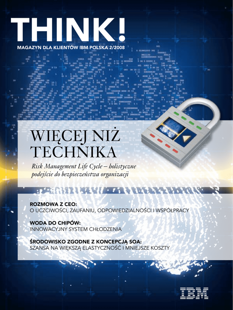 Think! Magazyn dla Klientów IBM Polska 2/2008 Więcej niż technika Risk Management Life Cycle – holistyczne podejście do bezpieczeństwa organizacji ROZMOWA Z CEO: O uczciwości, zaufaniu, odpowiedzialności i współpracy WODA DO CHIPÓW: Innowacyjny system chłodzenia Środowisko zgodne z koncepcją SOA: Szansa na większą elastyczność i mniejsze koszty Think! 2/2008 Jakie kroki podejmuje IBM, żeby zapobiegać kradzieży danych? Strona 8 3 Wstęp Dariusz Fabiszewski: Globalny Bilans Działania 4 Wydarzenia • KidSmart • Piątka na piątkę • IBM System i™ • IBM i Lenovo • BI w nowym wymiarze • Bliżej do sieci • Przedsiębiorstwo przyszłości • Czysta energia antidotum na zmiany • Najsłabsze ogniwo Sylwetka Okiem Lidera Rozwiązania 14 16 Krzysztof Komorowski Centrum Uwagi 8 WIĘCEJ NIŻ TECHNIKA W dzisiejszych czasach firmy potrzebują dogłębnych koncepcji bezpieczeństwa, dlatego IBM stworzył system Risk Management Life Cycle 13 22 produkty • System z10 • IBM BladeCenter S • DS8000 • Informacje na żądanie • Zielony Big Blue • Software: strategie przyszłości • IBM Lotus Symphony • Lotusphere 2008 34 14 Grafika: KircherBurkhardt 24 17 22 ROZMOWA Z CEO 17 NOWOŚCI Z LABORATORIUM 20 Innowacyjny system chłodzenia wodą centrów obliczeniowych chroni sprzęt przed przegrzaniem i pomaga oszczędzać energię 28 CZYNNIK RYZYKA Badanie dla Dyrektorów Finansowych Wszechstronne koncepcje bezpieczeństwa, uwzględniające aktualne i przyszłe zagrożenia Tematem przewodnim raportu jest sposób, w jaki firmy radzą sobie z szansami i zagrożeniami globalizacji THINK! 2/2008 | 2 RAPORT IBM Globalizacja i specjalizacja Dariusz Fabiszewski rozmawia z Piotrem Czarneckim, Prezesem Zarządu Raiffeisen Bank Polska na temat uczciwości i zaufania w biznesie raiffeisen bank polska Przebudowa infrastruktury zgodna z koncepcją SOA kolporter Dzięki serwerom IBM klienci otrzymują najwyższej jakości usługi 30 FIRST DATA POLSKA Konsolidacja platformy sprzętowej zrealizowana dzięki IBM 32 allegro IBM Server p5 590 sercem największego polskiego serwisu aukcyjnego Wstęp Globalny bilans działania Szanowni Państwo, Działalność w skali globalnej wiąże się z koniecznością zmian. Globalizacja wymaga, aby firmy stały się częścią światowego łańcucha dostaw, znały światową podaż siły roboczej i zarządzały talentami na całym świecie. Przedsiębiorstwa potrzebują właściwych narzędzi, procesów administracyjnych i ładu korporacyjnego, aby obsługiwać klientów, tworzyć nowe modele współpracy, zdobywać nowe rynki, czyli rozwijać działalność biznesową. Podczas rozmowy z Piotrem Czarneckim, CEO Raiffeisen Banku, miałem okazję przekonać się, że modele biznesowe IBM oraz jednego z największych w regionie Europy Centralnej i Wschodniej banków wykazują wiele podobieństw. W naszej codziennej pracy w pierwszej kolejności stawiamy na kontakt z klientem, innowacyjność i najwyższą etykę działania. Firma IBM od lat wyznacza trendy na rynku IT. Nie ulega wątpliwości, że będziemy obserwować coraz większy nacisk na innowację w projektowaniu modeli biznesowych. Jest jasne, że w tym kierunku prowadzi ścieżka do utrzymania przewagi konkurencyjnej. Drugi trend, który ewoluuje, to architektura zorientowana na usługi, czyli SOA. Jeśli ktoś chce być szybko reagującym, globalnym graczem, to stawia na SOA, aby coraz bardziej zwiększać elastyczność swoich aplikacji i procesów, ponieważ elastyczność jest kluczowym elementem do zmiany modelu biznesowego. Oprogramowanie jako usługa, będzie silnie konkurować z oprogramowaniem licencjonowanym tradycyjnie. Popyt na ekologiczne centra obliczeniowe i konsolidację serwerów oraz rosnące ceny energii będą wymuszać konieczność wprowadzenia oszczędności. Większa konkurencyjność przedsiębiorstw bezpośrednio przełoży się na konieczność modernizacji i budowania rozwiązań klasy Front Office w celu poprawy jakości obsługi klienta. Widać silną konwergencję rozwiązań mobilnych, jak również do transmisji głosu, przesyłu wideo i danych, zasobów aplikacyjnych. Jest to jeden ze sposobów, w jaki klienci mogą integrować swoje technologie, jednocześnie kontrolując koszty, zwiększając wydajność, usprawniając współpracę i przechodząc do nowych strategii biznesowych. Gwarantuję, że wszystkie tematy tego wydania są mocno zintegrowane z lokalnym rynkiem. Bardzo dziękuję wszystkim Klientom i Partnerom Handlowym IBM Polska, którzy obdarzyli nas zaufaniem. Zachęcam Państwa do lektury magazynu THINK! Dariusz Fabiszewski Dyrektor Generalny, IBM Polska THINK! 2/2008 | 3 Wydarzenia IBM KidSmart Ponad 150 kolejnych centrów komputerowych trafi w tym roku do polskich placówek nauczania początkowego Nauczanie początkowe w społeczeństwie wiedzy EDUKACJA Ponad 150 kolejnych centrów komputerowych trafi w tym roku do polskich placówek nauczania początkowego w ramach globalnej inicjatywy IBM KidSmart. Celem programu jest podnoszenie poziomu wykorzystania technologii informatycznych w edukacji oraz zmniejszenie różnic w wykształceniu dzieci z różnych regionów. Przedszkolakom z małych miejscowości, wsi oraz najbiedniejszych dzielnic miast, w których dostępność nowych technologii jest ograniczona, stwarza szansę oswojenia się z nowoczesnymi rozwiązaniami informatycznymi. W Polsce program realizowany jest od 2002 r. Do tej pory, we współpracy z samorządami, jednostkami doskonalenia nauczycieli, IBM THINK! 2/2008 | 4 przeszkolił kilkuset pedagogów i przekazał ponad 380 centrów komputerowych, które trafiły do blisko 200 placówek nauczania przedszkolnego w całym kraju. Nauka i zabawa W ramach programu IBM KidSmart przedszkolom oraz szkołom podstawowym przekazywane są centra komputerowe Young Explorer. W ich skład wchodzi komputer w atrakcyjnej wizualnie, kolorowej, a przy tym bezpiecznej dla dzieci obudowie oraz op