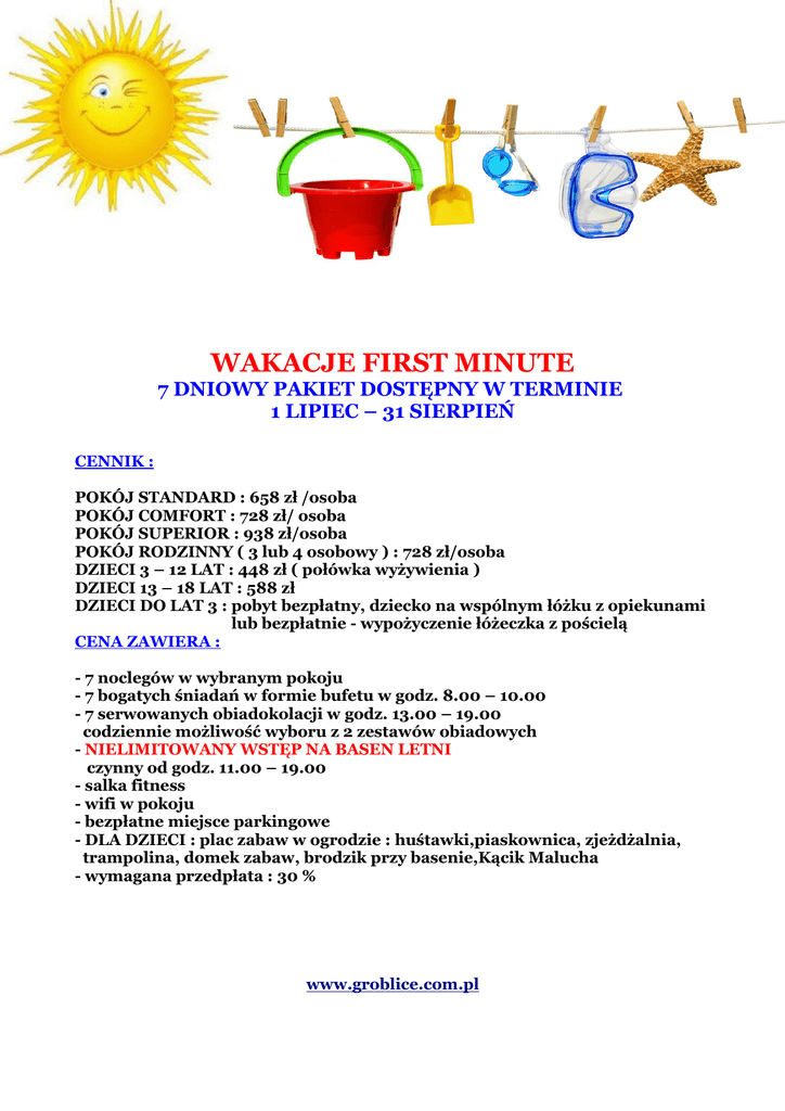 WAKACJE FIRST MINUTE 7 DNIOWY PAKIET DOSTĘPNY W TERMINIE 1 LIPIEC – 31 SIERPIEŃ CENNIK : POKÓJ STANDARD : 658 zł /osoba POKÓJ COMFORT : 728 zł/ osoba POKÓJ SUPERIOR : 938 zł/osoba POKÓJ RODZINNY ( 3 lub 4 osobowy ) : 728 zł/osoba DZIECI 3 – 12 LAT : 448 zł ( połówka wyżywienia ) DZIECI 13 – 18 LAT : 588 zł DZIECI DO LAT 3 : pobyt bezpłatny, dziecko na wspólnym łóżku z opiekunami lub bezpłatnie - wypożyczenie łóżeczka z pościelą CENA ZAWIERA : - 7 noclegów w wybranym pokoju - 7 bogatych śniadań w formie bufetu w godz. 8.00 – 10.00 - 7 serwowanych obiadokolacji w godz. 13.00 – 19.00 codziennie możliwość wyboru z 2 zestawów obiadowych - NIELIMITOWANY WSTĘP NA BASEN LETNI czynny od godz. 11.00 – 19.00 - salka fitness - wifi w pokoju - bezpłatne miejsce parkingowe - DLA DZIECI : plac zabaw w ogrodzie : huśtawki,piaskownica, zjeżdżalnia, trampolina, domek zabaw, brodzik przy basenie,Kącik Malucha - wymagana przedpłata : 30 % www.groblice.com.pl