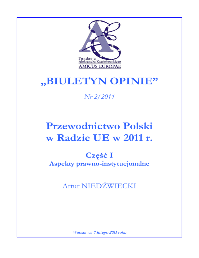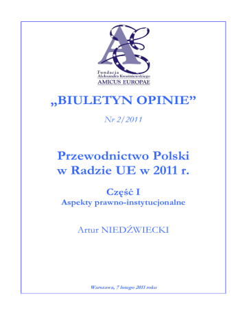 „BIULETYN OPINIE” Nr 2/2011 Przewodnictwo Polski w Radzie UE w 2011 r. Część I Aspekty prawno-instytucjonalne Artur NIEDŹWIECKI Warszawa, 7 lutego 2011 roku W opinii ekspertów przed przyjęciem Traktatu lizbońskiego rola Prezydencji w ramach systemu instytucjonalnego integracji europejskiej ulegała systematycznemu wzrostowi1. Przewodnictwa kolejnych państw członkowskich UE wywierały istotny wpływ na kształt agendy projektu europejskiego2. Prezydencje krajów UE zajmowały zasadniczą pozycję zwłaszcza w obszarach integracji europejskiej funkcjonujących na zasadzie metody międzyrządowej (II oraz III filar UE)3. Zmiany architektury instytucjonalnej zjednoczonej Europy po przyjęciu Traktatu lizbońskiego doprowadziły do modyfikacji roli Przewodnictwa państwa w Radzie Unii Europejskiej. Powołanie nowych funkcji Stałego Przewodniczącego Rady Europejskiej oraz Wysokiego Przedstawiciela ds Polityki Zagranicznej i Bezpieczeństwa skutkowało utratą szeregu kompetencji przez Prezydencję w ramach zjednoczonej Europy. Prezentowane zmiany doprowadziły do zmniejszenia politycznego oraz medialnego znaczenia Przewodnictwa państwa w obrębie Unii Europejskiej. Traktat lizboński generował konieczność prowadzenia skoordynowanych działań między Prezydencją a Stałym Przewodniczącym oraz Wysokim Przedstawicielem. Miało to istotne praktyczne znaczenie dla przygotowania oraz prowadzenia Przewodnictwa kraju na forum Unii Europejskiej4. Zmiany instytucjonalne UE prowadziły do zawęŜenia zakresu spraw zarządzanych przez Prezydencję na płaszczyźnie organizacyjnej oraz merytorycznej. Zapowiadały tym samym ograniczenie skali wpływu Przewodnictwa na program projektu europejskiego. Prezentowane modyfikacje stały się wyrazem woli duŜych państw członkowskich UE, wykazujących dąŜenia do osłabienia roli Prezydencji zwłaszcza na gruncie stosunków zewnętrznych UE. Przewodnictwo państwa w Radzie UE traciło walor strategiczny. Rodziło to niekorzystne konsekwencje szczególnie z punktu widzenia małych państw członkowskich UE5. Po przyjęciu Traktatu lizbońskiego Prezydencja nie obejmowała szczebla Rady Europejskiej. Przygotowanie oraz prowadzenie prac prezentowanego gremium powierzone zostało funkcji Stałego Przewodniczącego wybieranego na okres 2,5 roku (z moŜliwością ponownego wyboru). Stały Przewodniczący stał na straŜy prawidłowości oraz ciągłości prac Rady Europejskiej we współpracy z Komisją Europejską, Parlamentem Europejskim oraz Radą do Spraw Ogólnych. Zabiegał o osiąganie kompromisu oraz spójności działań Rady Europejskiej. Stały Przewodniczący reprezentował Unię Europejską na zewnątrz w ramach własnych kompetencji, bez naruszania uprawnień Wysokiego Przedstawiciela Unii ds. Polityki Zagranicznej i Bezpieczeństwa. Prezentowane zadania przed przyjęciem Traktatu lizbońskiego leŜały w gestii 1 J. Tallberg, Leadership and Negotiation in the European Union, Cambridge 2006. O. Elgström, European Union Council Presidencies, Routledge 2003. 3 E. J. Kirchner, Decision-making in the European Community: The Council Presidency and European integration, Manchester 1992. 4 J. Barcz, Prezydencja w Radzie UE – aspekty prawne i instytucjonalne, „Europejski Przegląd Sądowy”, 2010, nr 7., J. Barcz, Prezydencja w Radzie Unii Europejskiej, Warszawa 2010., M. Błaszczuk-Zawiła, Przewodnictwo Polski w Radzie Unii Europejskiej – przygotowania i priorytety, „Wspólnoty Europejskie” 2010, nr 4., A. Fuksiewicz, M. Szczepanik, Parlament Europejski jako partner polskiej prezydencji, „Analizy i Opinie ISP”, wrzesień 2010, nr 112., L. Jesień, R. Kołatek, Prezydencja grupowa UE: doświadczenia z lat 2007-2009, „Polski Przegląd Dyplomatyczny” 2010, t. 10, nr 3. 5 R. Thomson, The Council Presidency in the European Union: Responsibility with Power, „Journal of Common Market Studies”, Volume 46, Issue 3, June 2008. 2 2 państwa sprawującego Przewodnictwo w Radzie Unii Europejskiej6. Przejęcie omawianych kompetencji przez Stałego Przewodniczącego zapowiadało zaistnienie rywalizacji między nim a państwem sprawującym Prezydencję. Aktywność Stałego Przewodniczącego polegała na przygotowywaniu, kierowaniu oraz wypracowywaniu kompromisów w ramach Rady Europejskiej. W tym sensie uzyskał on znaczący wpływ na funkcjonowanie instytucji międzyrządowych Unii Europejskiej. Na Stałego Przewodniczącego nałoŜono obowiązek prowadzenia współpracy z państwem sprawującym Prezydencję w kwestii organizacji posiedzeń Rady Europejskiej7. Stały Przewodniczący przedstawiał Radzie do spraw Ogólnych projekt porządku obrad Rady Europejskiej, przygotowywał wstępny projekt konkluzji oraz wstępny projekt decyzji omawianego gremium. Prezentowane inicjatywy stawały się przedmiotem obrad na forum Rady do spraw Ogólnych. Kraj sprawujący Przewodnictwo w Radzie UE zastępować miał Stałego Przewodniczącego w przypadku śmierci lub utraty mandatu. Po wprowadzeniu funkcji Stałego Przewodniczącego doszło do zmiany równowagi między aktorami wpływającymi na proces wypracowywania porozumień podejmowanych na forum Rady Europejskiej. Przed przyjęciem Traktatu lizbońskiego projekty konkluzji Rady Europejskiej ustalane były przez państwo sprawujące Przewodnictwo w Radzie UE. W wyniku modyfikacji instytucjonalnych UE z głównego brokera porozumień międzynarodowych Prezydencja przeistoczyła się w uczestnika procesu dochodzenia do konsensusu. Po przyjęciu Traktatu lizbońskiego Przewodnictwo państwa nadal dysponowało uprzywilejowaną pozycją względem pozostałych krajów członkowskich w obrębie Rady Europejskiej. Znaczenie Prezydencji na płaszczyźnie wypracowywania treści konkluzji nadających impuls polityczny dla integracji europejskiej doznawało jednak ograniczeń8. Zgodnie z decyzją Rady Europejskiej z dnia 1 grudnia 2009 r. Stałym Przewodniczącym Rady Europejskie został premier Be