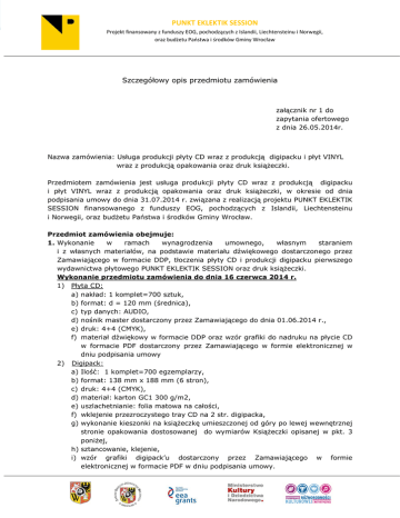 PUNKT EKLEKTIK SESSION Projekt finansowany z funduszy EOG, pochodzących z Islandii, Liechtensteinu i Norwegii, oraz budżetu Państwa i środków Gminy Wrocław Szczegółowy opis przedmiotu zamówienia załącznik nr 1 do zapytania ofertowego z dnia 26.05.2014r. Nazwa zamówienia: Usługa produkcji płyty CD wraz z produkcją digipacku i płyt VINYL wraz z produkcją opakowania oraz druk książeczki. Przedmiotem zamówienia jest usługa produkcji płyty CD wraz z produkcją digipacku i płyt VINYL wraz z produkcją opakowania oraz druk książeczki, w okresie od dnia podpisania umowy do dnia 31.07.2014 r. związana z realizacją projektu PUNKT EKLEKTIK SESSION finansowanego z funduszy EOG, pochodzących z Islandii, Liechtensteinu i Norwegii, oraz budżetu Państwa i środków Gminy Wrocław. Przedmiot zamówienia obejmuje: 1. Wykonanie w ramach wynagrodzenia umownego, własnym staraniem i z własnych materiałów, na podstawie materiału dźwiękowego dostarczonego przez Zamawiającego w formacie DDP, tłoczenia płyty CD i produkcji digipacku pierwszego wydawnictwa płytowego PUNKT EKLEKTIK SESSION oraz druk książeczki. Wykonanie przedmiotu zamówienia do dnia 16 czerwca 2014 r. 1) Płyta CD: a) nakład: 1 komplet=700 sztuk, b) format: d = 120 mm (średnica), c) typ danych: AUDIO, d) nośnik master dostarczony przez Zamawiającego do dnia 01.06.2014 r., e) druk: 4+4 (CMYK), f) materiał dźwiękowy w formacie DDP oraz wzór grafiki do nadruku na płycie CD w formacie PDF dostarczony przez Zamawiającego w formie elektronicznej w dniu podpisania umowy 2) Digipack: a) Ilość: 1 komplet=700 egzemplarzy, b) format: 138 mm x 188 mm (6 stron), c) druk: 4+4 (CMYK), d) materiał: karton GC1 300 g/m2, e) uszlachetnianie: folia matowa na całości, f) wklejenie przezroczystego tray CD na 2 str. digipacka, g) wykonanie kieszonki na książeczkę umieszczonej od góry po lewej wewnętrznej stronie opakowania dostosowanej do wymiarów Książeczki opisanej w pkt. 3 poniżej, h) sztancowanie, klejenie, i) wzór grafiki digipack’u dostarczony przez Zamawiającego w formie elektronicznej w formacie PDF w dniu podpisania umowy. PUNKT EKLEKTIK SESSION Projekt finansowany z funduszy EOG, pochodzących z Islandii, Liechtensteinu i Norwegii, oraz budżetu Państwa i środków Gminy Wrocław 3) 4) Książeczka: a) nakład: 1 komplet=700 szt., b) 120 mm x 120 mm’ c) ilość stron: 8, d) papier: powlekany typu Arctic SILK+,115g/m2 lub równoważnik pod względem jakościowym oraz technicznym, e) druk: 4+4 (CMYK), f) złożenie: oprawa zeszytowa (zszycie dwiema zszywkami), g) wzór grafiki książeczki dostarczony przez Zamawiającego w formie elektronicznej w formacie PDF w dniu podpisania umowy. Konfekcjonowanie płyt CD: a) umieszczenie każdej z płyt CD nadrukiem do góry w digipack’u, po jednej płycie w opakowaniu, b) umieszczenie każdej książeczki w kieszonce digipack’u, po jednej książeczce w opakowaniu, c) pakowane: w opakowania zbiorcze po 100 sztuk z informacją o tytule i ilości sztuk w opakowaniu, 2. Wykonanie w ramach wynagrodzenia umownego, własnym staraniem i z własnych materiałów tłoczenia płyty VINYL oraz produkcji opakowania pierwszego wydawnictwa płytowego PUNKT EKLEKTIK SESSION. Wykonanie przedmiotu zamówienia do dnia 31.07.2014 r. 1) Płyta VINYL: a) nakład: 1 komplet=700 sztuk, b) format: d = 12 cali (średnica), c) nośnik master dostarczony przez Zamawiającego do dnia 01.06.2014 r., d) druk: 4+4 (CMYK), e) materiał dźwiękowy w formacie DDP oraz wzór grafiki do nadruku na etykiecie płyty VINYL w formacie PDF dostarczony przez Zamawiającego w formie elektronicznej w dniu podpisania umowy. 2) Opakowanie – okładka na płytę VINYL. a) nakład: 1 komplet=700 sztuk, b) koperta kartonowa 220 g/m2, c) uszlachetnienie folią matową, d) druk: 4+4 (CMYK), e) wzór grafiki na przód i tył opakowania dostarczony przez Zamawiającego w formie elektronicznej w formacie PDF w dniu podpisania umowy. 3) Konfekcjonowanie płyt VINYL. a) umieszczenie każdej z płyt VINYL nadrukiem do góry w opakowaniu, po jednej płycie w opakowaniu, b) pakowane: w opakowania zbiorcze po 100 sztuk z informacją o tytule i ilości sztuk w opakowaniu. 3. Realizacja umowy obejmuje ponadto: 1) Produkcja przedmiotu umowy z własnych materiałów według zasad podanych w opisie przedmiotu zamówienia. PUNKT EKLEKTIK SESSION Projekt finansowany z funduszy EOG, pochodzących z Islandii, Liechtensteinu i Norwegii, oraz budżetu Państwa i środków Gminy Wrocław 2) Wykonawca jest zobowiązany do wykonania 5 egzemplarzy próbnych płyt VINYL i przedstawienia ich Zamawiającemu do akceptacji w terminie do dnia 30.06.2014r. 3) Zamawiający w terminie do jednego dnia roboczego od otrzymania próbnych egzemplarzy dokona ich akceptacji. 4) Dostarczenie wraz z wniesieniem opakowanego w sposób trwały i zabezpieczony przed wpływem czynników atmosferycznych przedmiotu umowy do siedziby Zamawiającego (ul. Namysłowska 8, 50-304 Wrocław). 4. Sposób wykonania przedmiotu umowy. Wykonawca oświadcza, że płyty wykonane będą w cyklu produkcyjnym spełniającym najwyższe wymagania jakościowe. Nadruki na płytach i wkładkach papierowych wykonywane są z klisz, zgodnych ze specyfikacją Wykonawcy, dostarczanych przez Zamawiającego.