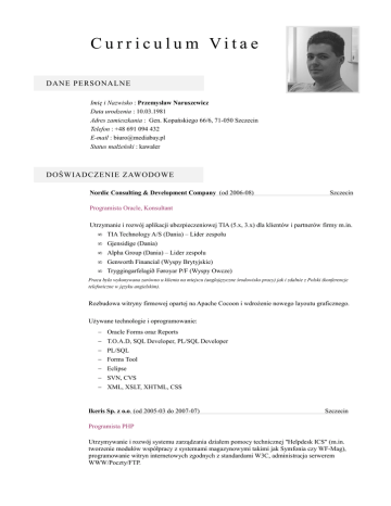 C u r r i c u l u m Vi t a e DANE PERSONALNE Imię i Nazwisko : Przemysław Naruszewicz Data urodzenia : 10.03.1981 Adres zamieszkania : Gen. Kopańskiego 66/6, 71-050 Szczecin Telefon : +48 691 094 432 E-mail : [email protected] Status małżeński : kawaler DOŚWIADCZENIE ZAWODOWE Nordic Consulting & Development Company (od 2006-08) Szczecin Programista Oracle, Konsultant Utrzymanie i rozwój aplikacji ubezpieczeniowej TIA (5.x, 3.x) dla klientów i partnerów firmy m.in. • TIA Technology A/S (Dania) – Lider zespołu • Gjensidige (Dania) • Alpha Group (Dania) – Lider zespołu • Genworth Financial (Wyspy Brytyjskie) • Tryggingarfelagið Føroyar P/F (Wyspy Owcze) Praca była wykonywana zarówno u klienta na miejscu (anglojęzyczne środowisko pracy) jak i zdalnie z Polski (konferencje telefoniczne w języku angielskim). Rozbudowa witryny firmowej opartej na Apache Cocoon i wdrożenie nowego layoutu graficznego. Używane technologie i oprogramowanie: − Oracle Forms oraz Reports − T.O.A.D, SQL Developer, PL/SQL Developer − PL/SQL − Forms Tool − Eclipse − SVN, CVS − XML, XSLT, XHTML, CSS Ikeris Sp. z o.o. (od 2005-03 do 2007-07) Szczecin Programista PHP Utrzymywanie i rozwój systemu zarządzania działem pomocy technicznej "Helpdesk ICS" (m.in. tworzenie modułów współpracy z systemami magazynowymi takimi jak Symfonia czy WF-Mag), programowanie witryn internetowych zgodnych z standardami W3C, administracja serwerem WWW/Poczty/FTP. Używane technologie i oprogramowanie : − PHP, XHTML, CSS, WAI − MySQL, MSSQL − SVN EUROSPORT Polska Sp. z o.o. (od 2005-02 do 2007-12) Warszawa Komentowanie programu TNA Wrestling. Geomar S.A. (od 2004-05 do 2004-07) Szczecin Członek zespołu wykonującego mapę cyfrową obszaru Bydgoszczy. Oprogramowanie : − Microstation EDUKACJA Politechnika Szczecińska (2000-10 – 2005-07) Szczecin Kierunek studiów : Informatyka Poziom studiów : Magisterskie KURSY I SZKOLENIA XIII Konferencja PLOUG (10-2007) Kościelisko Uczestnictwo w warsztatach i tutorialach : − 3 Perspektywy zarządzania projektem − Dlaczego to (nie) działa − Wirtualizacja serwerów − Oracle Data Mining INFORMACJE DODATKOWE Prawo jazdy kat. B Język angielski w stopniu dobrym Zainteresowania : Narciarstwo, Piłka nożna, Piłka ręczna, Profesjonalne zapasy (Wrestling), Kino Wyrażam zgodę na przetwarzanie moich danych osobowych zawartych w mojej ofercie pracy dla potrzeb niezbędnych do realizacji procesu rekrutacji (zgodnie z ustawą z dn. 29.08.97 roku o Ochronie Danych Osobowych Dz. Ust Nr 133 poz. 883).