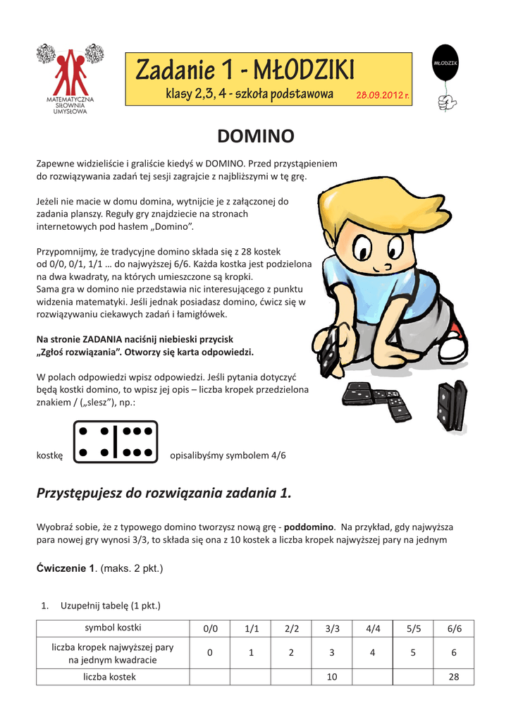 Zadanie 1 - MŁODZIKI klasy 2,3, 4 - szkoła podstawowa 28.09.2012 r. DOMINO Zapewne widzieliście i graliście kiedyś w DOMINO. Przed przystąpieniem do rozwiązywania zadań tej sesji zagrajcie z najbliższymi w tę grę. Jeżeli nie macie w domu domina, wytnijcie je z załączonej do zadania planszy. Reguły gry znajdziecie na stronach internetowych pod hasłem „Domino”. Przypomnijmy, że tradycyjne domino składa się z 28 kostek od 0/0, 0/1, 1/1 … do najwyższej 6/6. Każda kostka jest podzielona na dwa kwadraty, na których umieszczone są kropki. Sama gra w domino nie przedstawia nic interesującego z punktu widzenia matematyki. Jeśli jednak posiadasz domino, ćwicz się w rozwiązywaniu ciekawych zadań i łamigłówek. Na stronie ZADANIA naciśnij niebieski przycisk „Zgłoś rozwiązania”. Otworzy się karta odpowiedzi. W polach odpowiedzi wpisz odpowiedzi. Jeśli pytania dotyczyć będą kostki domino, to wpisz jej opis – liczba kropek przedzielona znakiem / („slesz”), np.: kostkę opisalibyśmy symbolem 4/6 Przystępujesz do rozwiązania zadania 1. Wyobraź sobie, że z typowego domino tworzysz nową grę - poddomino. Na przykład, gdy najwyższa para nowej gry wynosi 3/3, to składa się ona z 10 kostek a liczba kropek najwyższej pary na jednym Ćwiczenie 1. (maks. 2 pkt.) 1. Uzupełnij tabelę (1 pkt.) symbol kostki 0/0 1/1 2/2 3/3 4/4 5/5 6/6 liczba kropek najwyższej pary na jednym kwadracie 0 1 2 3 4 5 6 liczba kostek 10 28 Wyobraź sobie kostki nietypowego domino, na których na jednym kwadracie narysowano 7, 8 lub 9 kropek. 2. Uzupełnij tabelę (1 pkt.) symbol kostki 7/7 8/8 9/9 liczba kropek najwyższej pary na jednym kwadracie 7 8 9 liczba kostek Ćwiczenie 2. (maks. 3 pkt.) Informacje do zadań nr 3, 4, 5. Liczby trójkątne +2 +3 +4 1 3 6 10 Tak tworzone liczby 1, 3, 6, 10, … nazywają się liczbami trójkątnymi. Dowiedz się o nich więcej, korzystając z Internetu. Oblicz wartość szóstej, ósmej i dziewiątej liczby trójkątnej. 3. 4. 5. T6 = ……. (1 pkt.) T8 = ……. (1 pkt.) T9 = ……. (1 pkt.) Ćwiczenie 3. (maks. 4 pkt.) Okienka Z 4 kostek domino można utworzyć okienka jak pokazano na poniższym przykładzie: Narysuj trzy przykłady innych takich okienek - pamiętaj, że każdej kostki domino można użyć tylko raz. W odpowiednim miejscu karty odpowiedzi wpisz liczbę kropek znajdujących się na kolejnych kostkach według zasady opisanej na wstępie, wymieniając je w kolejności: A, B, C, D. 6. (1 pkt.) 7. (1 pkt.) B B A B A A C C D 9. 8. (1 pkt.) C D D Ile takich okienek można ułożyć, wykorzystując wszystkie kostki domina? …………. (1 pkt.) Ćwiczenie 4. (maks. 4 pkt.) Dodawanie z użyciem domino Używając 27 spośród 28 kostek domino można wykonać kilka działań "dodawania". Oto przykłady: Narysuj dokładnie dwa inne przykłady takich działań dodawania" - pamiętaj, że każdej kostki domino " można użyć tylko raz. W odpowiednim miejscu karty odpowiedzi wpisz liczbę kropek znajdujących się na kolejnych kostkach według zasady opisanej na wstępie. Nominały kostek wymieniaj w kolejności A, B, C. 10. (1 pkt.) 12. 11. (1 pkt.) A A B B C C Ile jest wszystkich takich działań "dodawania"? …………. (1 pkt.) 13. Której kostki nie użyjemy w tych działaniach? (1 pkt.) Ćwiczenie 5. (maks. 4 pkt.) Ramki z domino Wykorzystując wszystkie 28 kostek domino, ułóż kwadraty tak, aby na każdym boku suma oczek była taka sama. Oto przykłady: 3 11 11 3 3 11 3 11 Narysuj dwa przykłady innych takich kwadratów. Pamiętaj, że każdą kostkę domino można użyć tylko raz. W odpowiednim miejscu karty odpowiedzi wpisz liczbę kropek znajdujących się na kolejnych kostkach według zasady opisanej na wstępie. Nominały kostek wymieniaj w kolejności A, B, C, D. 14. (1 pkt.) 15. (1 pkt.) A A B D D C 16. B C Ile jest wszystkich takich kwadratów? (1 pkt.) 17. Wyłożono wszystkie 28 kostek, zgodnie z zasadami gry, w łańcuch, w ten sposób, że w jednym jego końcu jest 5 oczek. Ile oczek będzie na drugim jego końcu? ……. (1 pkt.) Ćwiczenie 6. (maks. 3 pkt.) Mnożenie z użyciem domino Spójrz na poniższe przykłady: 415 x 4 1660 551 x 4 2204 Podaj trzy inne przykłady takich iloczynów. Pamiętaj, że każdej kostki domino można użyć tylko raz. W odpowiednim miejscu karty odpowiedzi wpisz liczby kropek znajdujących się na kolejnych kostkach, według zasady podanej na wstępie. Nominały kostek wymieniaj w kolejności A, B, C, D. 18. (1 pkt.) 19. (1 pkt.) A A B D B C D 20. (1 pkt.) A B D C C Ćwiczenie 7. (maks. 5 pkt.) Figury magiczne Z kostek domino można układać figury tak, a by w każdym rzędzie poziomym i pionowym i w każdej z dwóch przekątnych suma oczek była jednakowa. Przykład: 12 12 12 12 21. 12 12 12 12 Z kostek umieszczonych poniżej ułóż magiczny kwadrat o sumie oczek równej 15. (2 pkt.) I. A B C 15 II. A B C 15 III. A B C 15 15 15 15 15 15 W odpowiednim miejscu karty odpowiedzi wpisz liczbę kropek znajdujących się na kolejnych kostkach według zasady opisanej na wstępie, najpierw w I rzędzie dla A, B, C, a następnie w II i III. 22. Zbuduj magiczną figurę z 16 dowolnych kostek o stałej sumie równej 18. (3 pkt.) I. A B C D 18 II. A B C D 18 III. A B C D 18 IV. A B C D 18 18 18 18 18 18 18 W odpowiednim miejscu karty odpowiedzi wpisz liczbę kropek znajdujących się na kolejnych kostkach według zasady opisanej na wstępie, najpierw w I rzędzie dla A, B, C,D, a następnie w II , III i IV. Załącznik - zestaw Domino www.explorapark.pl