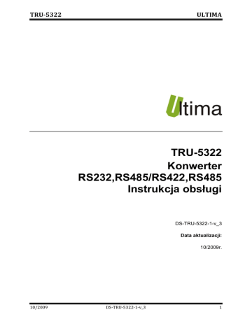 TRU-5322 ULTIMA TRU-5322 Konwerter RS232,RS485/RS422,RS485 Instrukcja obsługi DS-TRU-5322-1-v_3 Data aktualizacji: 10/2009r. 10/2009 DS-TRU-5322-1-v_3 1 TRU-5322 ULTIMA Spis treści Symbole i oznaczenia .......................................................................................................................... 3 Ogólne zasady instalacji i bezpieczeństwa ...................................................................................... 3 1. Przeznaczenie ............................................................................................................................... 4 2. Parametry urządzenia .................................................................................................................. 5 2.1. Parametry techniczne .......................................................................................................... 5 2.2. Parametry transmisji............................................................................................................. 6 2.3. Schemat blokowy .................................................................................................................. 6 2.4. Opis złącz............................................................................................................................... 7 2.5. Opis diod sygnalizacyjnych ................................................................................................. 8 2.6. Wymiary ................................................................................................................................. 9 3. Montaż ............................................................................................................................................ 9 4. Regulacja i użytkowanie ............................................................................................................ 10 4.1. Tryby pracy .......................................................................................................................... 10 4.2. Ustawienie parametrów transmisji oraz wybór rodzaju linii komunikacji szeregowej RS485/RS422. ................................................................................................................................ 12 4.3. 5. Ustawienie terminatorów końca linii RS422/RS485 ...................................................... 14 Dane kontaktowe ........................................................................................................................ 16 10/2009 DS-TRU-5322-1-v_3 2 TRU-5322 ULTIMA Symbole i oznaczenia Porada. Podpowiada czynności, które ułatwiają rozwiązanie problemu lub/i jego diagnozowanie. Wykonanie ich nie jest obowiązkowe i nie rzutuje na poprawność funkcjonowania urządzenia. Uwaga! Ważna informacja lub czynność mająca znaczenie dla prawidłowej pracy urządzenia. Wykonanie jej nie jest obowiązkowe. Jej brak nie spowoduje żadnych zagrożeń dla człowieka i urządzenia. Jedynym skutkiem niezastosowania może być nieprawidłowa praca urządzenia. Ostrzeżenie! Wskazuje ważne czynności, których niepoprawnie wykonane może spowodować zagrożenie dla obsługi, lub/i uszkodzenie urządzenia. Ogólne zasady instalacji i bezpieczeństwa Urządzenie należy instalować zgodnie z przeznaczeniem określonym w dokumentacji. Spełnienie tego warunku jest podstawa do zapewnienia bezpieczeństwa i poprawnej pracy urządzenia. W przypadku użycia urządzenia w sposób niewłaściwy lub niezgodny z przeznaczeniem może stać ono źródłem zagrożenia. Producent nie odpowiada za szkody wynikłe z użycia urządzenia w niewłaściwy sposób lub niezgodnie z przeznaczeniem. Przeróbki w urządzeniu są niedozwolone i mogą stać sie powodem zagrożenia. 10/2009 DS-TRU-5322-1-v_3 3 TRU-5322 ULTIMA 1. Przeznaczenie TRU-5322 pełni rolę konwertera standardów RS232, RS485 na RS422, RS485. Zapewnia jednocześnie galwaniczną separacje sygnału pomiędzy wejściem, a wyjściem. Urządzenie nie wymaga dodatkowych sygnałów sterujących kierunkiem transmisji. Konstrukcja TRU-5322 oparta jest na bazie programowalnych układów PLD. Linie RS485,RS422 dodatkowo zabezpieczone są przed przepięciami. Zastosowanie TRU-5322: - dopasowanie standardów transmisji, konwerter,separator i repeater: 1. konwerter, separator RS232-RS485, 2. konwerter, separator RS485-RS232, 3. konwerter, separator RS232-RS422, 4. konwerter, separator RS422-RS232, 5. konwerter, separator RS485-RS422, 6. konwerter, separator RS422-RS485, 7. repeater, separator RS485-RS485 - budowa sieci transmisyjnej o topologii gwiazdy, - urządzenie może pełnić rolę ochronnika, - poprawa jakości i sprawności transmisji (technologia automatycznego formowania ramki). Cechy urządzenia: - zakres obsługiwanych prędkości transmisji od 50b/s do 375 kb/s, - zakres temperatury pracy od -40 °C do 70°C, - szeroki zakres napięcia zasilania od 7V do 30V (stabilizowane), - niski pobór mocy, mniej niż 2W. - podłączenie RS232 za pomocą DB9 lub łącza śrubowego - zabezpieczenie linii RS422 i RS485 przed przepięciami, - kontrola przepływu danych (włączona / wyłączona kontrola parzystości), - możliwość elastycznego dołączania terminatorów linii portów RS422,485, - 10/2009 diodowe wskaźniki obecności zasilania, oraz przepływu danych, DS-TRU-5322-1-v_3 4 TRU-5322 - ULTIMA możliwa budowa bramek RS485 w oparciu o TRU-5322 do 256 punktów, - izolacja galwaniczną 3kV pomiędzy wejściem a wyjściem, 2. Parametry urządzenia 2.1. Parametry techniczne Parametry techniczne modułu zostały przedstawione w tablicy 2.1.1. Tab. 2.1.1. Parametry techniczne TRU-5322 Parametr Specyfikacja RS232 Obsługa linii RS232 Ochrona ESD RS232 Maksymalna długość linii RS-232 Podłączenie RS232 Specyfikacja RS422/RS485 Sterowanie kierunkiem transmisji Ochrona ESD RS422/RS485 Zabezpieczenie przeciwprzepięciowe i przeciwzwarciowe linii RS422/RS485 Terminatory linii RS422/RS485 Maksymalna liczba urządzeń Ma