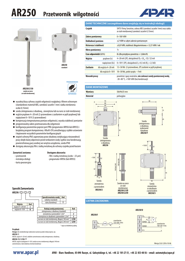 AR250 Przetwornik wilgotności DANE TECHNICZNE (szczegółowe dane znajdują się w instrukcji obsługi) Czujnik SHT31 firmy Sensirion, osłona ABS (szerokosć szczelin 1mm) oraz siatka ze stali nierdzewnej (szerokość szczelin 0,15mm) Zakres pomiarowy 0÷100 %RH Dokładność pomiaru ±2 %RH w całym zakresie pomiarowym Histereza i stabilność ±0,8 %RH, stabilność długoterminowa < 0,25 %RH / rok Okres pomiarowy 1s Czas odpowiedzi (63%) 8s (dla przepływu powietrza > 3,6km/h) Wyjścia 4÷20 mA (2P), obciążalność RO< (Uzas-12) / 22 mA prądowe (IH) napięciowe (UH) 0÷10 V (3P), obciążalność IO<4,5 mA (Rw > 2,5 kΩ) AR250 Zasilanie standard 12÷36 Vdc (2-przewodowe, 2P) zasilanie w pętli prądowej dla wyjścia 4÷20 mA dla wyjścia 0÷10 V 18÷30 Vdc, pobór prądu: ~7mA Warunki pracy powietrze i gazy neutralne, nie zalewać sondy pomiarowej wodą -30÷80 °C, <100 %RH (bez kondensacji) PROGRAMOWANIE DANE MONTAŻOWE sonda na rurce ze stali nierdzewnej AR956 KOPIOWANIE Wymiary 58x94x35 mm Materiał poliwęglan (standardowo materiał ABS, szerokość szczelin 1 mm i siatka nierdzewna oczko 0,15mm) n sonda zintegrowana z obudową, zewnętrzna lub na rurce ze stali nierdzewnej n wyjście prądowe 4÷20 mA (2-przewodowe z zasilaniem w pętli prądowej) lub napięciowe 0÷10 V (3-przewodowe) n kompensacja temperaturowa pomiaru wilgotności, wysoka stabilność pomiarów n programowalny zakres przetwarzania dla wilgotności n konfiguracja parametrów poprzez port PRG (programator AR956 lub AR955) i bezpłatny program komputerowy ARsoft-CFG umożliwiający szybkie ustawianie i kopiowanie wszystkich parametrów konfiguracyjnych n stopień ochrony IP65 zapewniany przez obudowę zwiększający niezawodność pracy dzięki dużej odporności przed wnikaniem wody i pyłów oraz kondensacją powierzchniową pary wodnej we wnętrzu urządzenia, sonda IP40 n dostępny akcesoryjny filtr z siatką metalową do ochrony czujnika przed kurzem Dostępne akcesoria: - filtr z siatką metalową (oczko ~25 μm) - programator AR956 (lub AR955) 35 Φ9 58 45 45 Sonda zintegrowana z obudową wykonanie kanałowe AR250/T Sonda zintegrowana z obudową AR250 ~1500 ~1500 140 lub 240 Zawartość zestawu: - przetwornik - instrukcja obsługi - karta gwarancyjna 58 94 80 64 wysokiej klasy cyfrowy czujnik wilgotności względnej z filtrem ochronnym n 62 100 lub 200 AR250/L150 58 45 15 Sonda zewnętrzna z przewodem AR250/2 Sposób Zamawiania 94 Sonda na rurce ze stali nierdzewnej AR250/L150 AR250/L250 AR250 / o /o /o Wyjście wyjście 4÷20 mA wyjście 0÷10 V Kod I U Sposób montażu sondy Kod radialny (standard) tylny (kanałowy) T Rodzaj sondy pomiarowej zintegrowana z obudową (standard) zewnętrzna z przewodem 1,5m* zewnętrzna w obudowie z przewodem 1,5m* na rurce ze stali nierdzewnej, długość 140 mm* na rurce ze stali nierdzewnej, długość 240 mm* LISTWA ZACISKOWA Kod 2 3 L150 L250 * opcje za dodatkową opłatą Przykład: Uwaga: dla standardowego wykonania wystarczy podać rodzaj wyjścia, np.: Sonda zewnętrzna w obudowie z przewodem AR250/3 AR250/U AR250/I 1 1 2 IH V+ + mA _ Ro zasilanie 12÷36_Vdc + UH + Rw 2 GND 3 GND 4 V+ V _ zasilanie 18÷30 Vdc _ + AR250 / I AR250, wyjście 4÷20 mA, radialnie zamontowana sonda zintegrowana z obudową AR250 / U / L150 / T AR250, wyjście analogowe 0÷10 V, sonda na rurce nierdzewnej o długości 140 mm zamontowana z tyłu obudowy (montaż kanałowy) www.apar.pl Wersja 3.0.0 2016-10-06 APAR - Biuro Handlowe, 05-090 Raszyn, ul. Gałczyńskiego 6, tel. +48 22 101-27-31, +48 22 853-48-56 • email: [email protected] CERTYFIKAT KALIBRACJI CYFROWYCH CZUJNIKÓW WILGOTNOŚCI I TEMPERATURY FIRMY SENSIRION