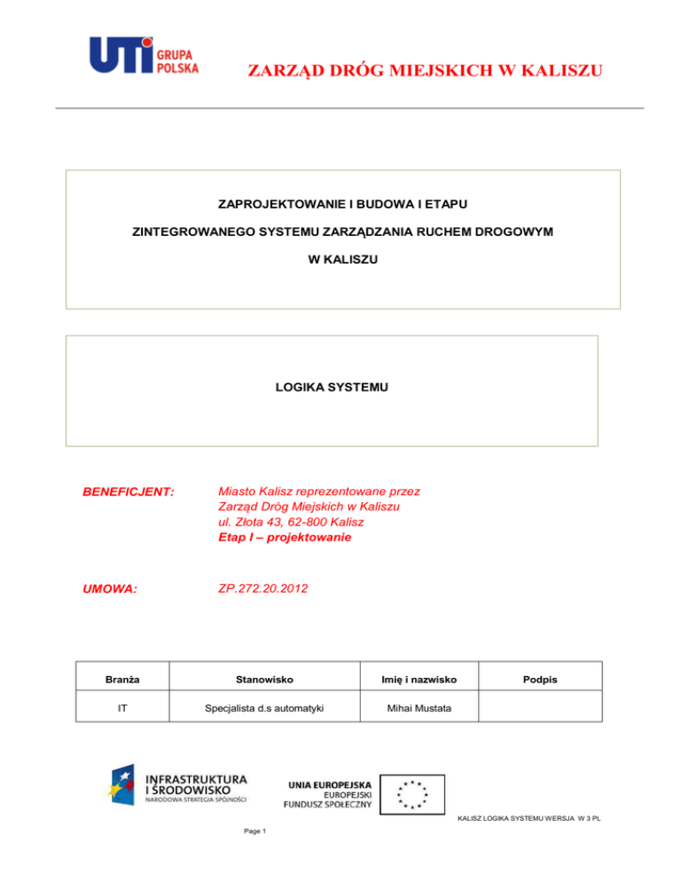 ZARZĄD DRÓG MIEJSKICH W KALISZU ZAPROJEKTOWANIE I BUDOWA I ETAPU ZINTEGROWANEGO SYSTEMU ZARZĄDZANIA RUCHEM DROGOWYM W KALISZU LOGIKA SYSTEMU BENEFICJENT: Miasto Kalisz reprezentowane przez Zarząd Dróg Miejskich w Kaliszu ul. Złota 43, 62-800 Kalisz Etap I – projektowanie UMOWA: ZP.272.20.2012 Branża Stanowisko Imię i nazwisko IT Specjalista d.s automatyki Mihai Mustata Podpis KALISZ LOGIKA SYSTEMU WERSJA W 3 PL Page 1 ZARZĄD DRÓG MIEJSKICH W KALISZU SPIS TREŚCI 1. Wstęp (str.5) 2. Podsystem monitorowania i zarządzania sygnalizacją świetlną (str.6) 3. Podsystem optymalizacji ruchu dla arterii miejskich (str.19) 4. Podsystem wykrywania pojazdów poszukiwanych (str.25) 5. Podsystem monitorowania wideo skrzyżowań (str.37) 6. Podsystem tablic znakowych zmiennej treści (str.43) 7. Podsystem wykrywania i rejetsracji pojazdów przekraczających dopuszczalny nacisk osi (str.52) 8. Podsystem dytrybucji danych ruchowych (str.68) 9. Podsystem rejestarcji pojazdów przekraczajacych dozwoloną preędkość przejazdu na odcinku drogi (str.74) 10. Podsystem rejetsracji pojazdów przejeżdzających na czerwonym sygnale przez sygnalizację świetlną (str.81) 11. Ectorian – oprogramowanie do mandatowania (str.92) 12. Podsystem automatycznego zliczania pojazdów z podziałem na kategorie (str.114) 13. Infrastruktura telematyczna (str.120) 14. Zintegrowane centrum sterowania ruchem drogowym w kaliszu (str.128) KALISZ LOGIKA SYSTEMU WERSJA W 3 PL Page 2 ZARZĄD DRÓG MIEJSKICH W KALISZU Lista załączników : 1. Adresacja IP urządzeń 2. Protokół komunikacyjny VCI pomiędzy oprogramowaniem centralnym i sterownikami sygnalizacji świetlnej. 3. Specyfikacja techniczna: Kamera cyfrowa HD BOSCH NBN921-P 4. Specyfikacja techniczna: Kamera cyfrowa SD BOSCH NBN-498-11P 5. Specyfikacja techniczna: Sterownik NISE 3500 6. Specyfikacja techniczna: Kamera SONY SNC-CH260 7. Specyfikacja techniczna: Rejestrator sieciowy 8. Specyfikacja techniczna: Wyświetlacz LCD 42’’ 9. Schemat rozmieszczenia paneli świetlnych w Centrum Sterownia Ruchem 10. Specyfikacja techniczna: Tablica VMS 11. Rysunek techniczny tablicy VMS 12. Certyfikat maksymalnej wartości prądu zasilającego diody LED 13. Protokół komunikacyjny stosowany pomiędzy znakami tesktowymi o zmiennej treści a oprogramowaniem zainstalowanym w CSR 14. Plan sytuacyjny parkingu 15. Specyfikacja techniczna: Klasyfikatir pętlowy TDS 821R 16A) Specyfikacja techniczna: Czujniki kwarcowe Kistler 16B) Certyfikat zatwierdzenia typu czujników 16C) Certyfikat OIML czujnik Kistler 17A) Specyfikacja techniczna: Przenośna waga samochodowa 17B) Certyfikat zatwierdzenia typu- Przenośna waga samochodowa 18. Karta katlogowa komputera HP ProBook 6570b 19. Neurocar 2.0 Terminal (WIM) podręcznik użytkownika 20. Charakterystyka techniczna: Serwer IBM System x3550 M3 21. Karta katalogowa drukarki 22. Specyfikacja techniczna: Przełącznik- switch IES 2208F KALISZ LOGIKA SYSTEMU WERSJA W 3 PL Page 3 ZARZĄD DRÓG MIEJSKICH W KALISZU 23. Specyfikacja techniczna: Przełącznik - switch IES 2216C 24. Specyfikacja techniczna: Konwenter 0101GB 25. Specyfikacja techniczna: Główny przełącznik LGS-2300 RPS 26. Specyfikacja techniczna: Przełącznik LGS- 2624C 27. Specyfikacja techniczna: Moduł Mini GBIC (SFP) 28. Specyfikacja techniczna: Router 28A Podręcznik instalacji i konfiguracji 29. Specyfikacja techniczna: Serwer IBM System x 3620 M3 30. Wyposażenie szaf 19” 30 A Tabela zapotrzebowania mocy dla CSR 30 B Tabela –wydzielanie ciepła przez urządzenia w CSR 31. Specyfikacja techniczna: ECO Pro CDS Rack 32. Specyfikacje techniczna: Mikrokable światłowodowe 33. Specyfikacja techniczna: UPS 34. Specyfikacja techniczna: Panel przeciwłamaniowy i kontroli dostepu 35. Specyfikacja techniczna: Panel przeciwpożarowy 36. Specyfikacja techniczna: Panel świetlny 37. Specyfikacje techniczna: Kontroler graficzny dla ściany graficznej 38. Specyfikacja techniczna: Oprogramowania do zarządzania ścianą wideo 39. Specyfikacja techniczna: Stanowisko robocze 39A) Monitor 39B) Komputer PC 39C) UPS 40. Specyfikacja techniczna notebooka do pracy w terenie. KALISZ LOGIKA SYSTEMU WERSJA W 3 PL Page 4 ZARZĄD DRÓG MIEJSKICH W KALISZU 1. WSTĘP Przedmiotem niniejszego opracowania jest budowa pierwszego etapu Zintegrowanego Systemu Zarządzania Ruchem Drogowym w Kaliszu. Podstawowym zadaniem jest poprawa bezpieczeństwa ruchu i ochrona środowiska poprzez redukcję zanieczyszczeń emitowanych do atmosfery, hałasu oraz drgań. Drugim zadaniem jest zwiększenie przepustowości infrastruktury drogowej oraz komfortu jazdy. Niniejszy dokument przedstawia podsystemy, które będą zainstalowane w celu stworzenia jak najbardziej funkcjonalnego systemu. Dokument zawiera opis jak działają poszczególne podsystemy, w jaki sposób spełniają wymagania PFU oraz SPFU a także opis urządzeń, z których będą zbudowane. KALISZ LOGIKA SYSTEMU WERSJA W 3 PL Page 5 ZARZĄD DRÓG MIEJSKICH W KALISZU 2. PODSYSTEM MONITOROWANIA I ZARZĄDZANIA SYGNALIZACJĄ ŚWIETLNĄ. W ramach pierwszego etapu budowy kaliskiego Zintegrowanego Systemu Zarządzania Ruchem monitoringiem i zarządzaniem sygnalizacją świetlną objęte będą 23 skrzyżowania. Fizycznie do Systemu będzie podłączonych 100 skrzyżowań. Skrzyżowania działające w ramach tego podsystemu to: 1. Skrzyżowanie dróg Al. Sikorskiego - Stawiszyńska - Al. Wojska Polskiego [9] 2. Skrzyżowanie dróg Al. Wojska Polskiego – wyjazd z osiedla Dobrzec [14] 3. Skrzyżowanie dróg Al. Wojska Polskiego – Skłodowskiej-Curie [15] 4. Skrzyżowanie dróg Al. Wojska Polskiego – wyjazd z Tesco [16] 5. Skrzyżowanie dróg Al. Wojska Polskiego – wyjazd z Makro [17] 6. Skrzyżowanie dróg Al. Wojska Polskiego – Tylna (Castorama) [18] 7. Skrzyżowanie dróg Al. Wojska Polskiego – Wrocławska [19] 8. Skrzyżowanie dróg Wrocławska – 29 Pułku Piechoty [20] 9. Skrzyżowanie dróg Poznańska - Harcerska – Al. Wojska Polski