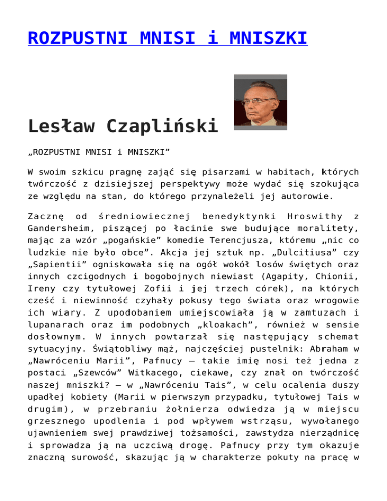 ROZPUSTNI MNISI i MNISZKI Lesław Czapliński „ROZPUSTNI MNISI i MNISZKI” W swoim szkicu pragnę zająć się pisarzami w habitach, których twórczość z dzisiejszej perspektywy może wydać się szokująca ze względu na stan, do którego przynależeli jej autorowie. Zacznę od średniowiecznej benedyktynki Hroswithy z Gandersheim, piszącej po łacinie swe budujące moralitety, mając za wzór „pogańskie” komedie Terencjusza, któremu „nic co ludzkie nie było obce”. Akcja jej sztuk np. „Dulcitiusa” czy „Sapientii” ogniskowała się na ogół wokół losów świętych oraz innych czcigodnych i bogobojnych niewiast (Agapity, Chionii, Ireny czy tytułowej Zofii i jej trzech córek), na których cześć i niewinność czyhały pokusy tego świata oraz wrogowie ich wiary. Z upodobaniem umiejscowiała ją w zamtuzach i lupanarach oraz im podobnych „kloakach”, również w sensie dosłownym. W innych powtarzał się następujący schemat sytuacyjny. Świątobliwy mąż, najczęściej pustelnik: Abraham w „Nawróceniu Marii”, Pafnucy – takie imię nosi też jedna z postaci „Szewców” Witkacego, ciekawe, czy znał on twórczość naszej mniszki? – w „Nawróceniu Tais”, w celu ocalenia duszy upadłej kobiety (Marii w pierwszym przypadku, tytułowej Tais w drugim), w przebraniu żołnierza odwiedza ją w miejscu grzesznego upodlenia i pod wpływem wstrząsu, wywołanego ujawnieniem swej prawdziwej tożsamości, zawstydza nierządnicę i sprowadza ją na uczciwą drogę. Pafnucy przy tym okazuje znaczną surowość, skazując ją w charakterze pokuty na pracę w latrynie: „Potrzeba żebyś słodycze grzeszne pochlebnej rozkoszy zmyła upokorzeniem zbytniego fetoru” (Wielka Literatura Powszechna, t. 5, Warszawa 1932, ss. 633-635). Na początku „Nawrócenia Marii” Abraham, aby uchronić swą bratanicę przed pokusami tego świata, umieszcza w celi, sąsiadującej z własną. Zabawne, że w pamflecie Jerzego Urbana przeciw aktywiście antyalkoholowemu Włodzimierzowi Marcinkowskiemu, który w celu zapoznania dziennikarza ze swoją działalnością, podejmował go suto zakrapianą kolacją, przywołał podobną sytuację: „nawet średniowieczni mnisi nie wieszali w swoich celach podobizn nagich dziwek, żeby pobudziwszy namiętności, tym większą mieć zasługę w ich zwalczaniu i chłostaniu” („Jego totalność dr Marcinkowski”, Polityka 7/1963). Artykuł ten zaszczycił swą uwagą Władysław Gomułka, czyniąc go przedmiotem krytyki (obok m.in. „Noża w wodzie” Romana Polańskiego) na poświęconym w kulturze plenum Komitetu Centralnego Polskiej Zjednoczonej Partii Robotniczej, a jego autor objęty zakazem druku, z którego to powodu zmuszony był publikować pod pseudonimem Jana Rema, a do którego powrócił po latach, gdy stanął po drugiej stronie barykady jako rzecznik prasowy rządu w okresie stanu wojennego. Z kolei (postać Don Juana na kart y literatury wprowadził) twórcą pierwszego literackiego opracowania legendy o Don Juanie, czyli „Zwodziciela z Sewilli i kamiennego gościa” był hiszpański ksiądz zakonny ze zgromadzenia mercedariuszy – Tirso de Molina (właśc. Gabriel Tellez). Również inny jego bardzo popularny dramat – „Zielony gil” – poświęcony jest awanturom miłosnym i wynikającym z nich perypetiom, w których ważną rolę odgrywa przebranie i zamiana ról, przypisanych poszczególnym płciom. Tego rodzaju sztuki o czysto świeckiej tematyce przeważają w jego dorobku nad bogobojnymi dramatami religijnymi i właściwymi dla teatru hiszpańskiego alegorycznymi misteriami bożonarodzeniowymi, czyli tzw. autos sacramentales. Nie umknęło to uwadze ówczesnych władz duchownych, a konkretnie Rady do spraw Naprawy Obyczajów, które w liście do króla zwracały się o interwencję: „skandal, jaki wywołuje swoimi sztukami teatralnymi pisanymi w świeckim stylu, które stanowią zachętę do niecnych czynów i szerzą zły przykład. A ponieważ zdarza się to notorycznie, uradzono powiadomić o tym Jego Królewską Mość, po to, żeby spowiednik zwrócił się do Nuncjusza wypędzenie go stąd do któregoś z najodleglejszych klasztorów, a także nałożył nań latae sententiae eskomunikę większą, aby więcej nie pisał już sztuk, ani żadnego innego rodzaju świeckich wierszy” (za: Tirso de Molina „Dramaty”, Wrocław 1999, s. XIX). Skutkiem tego było dyscyplinarne przeniesienie do innej miejscowości. Inny duchowny – abbé Prévost wymyślił libertyńską historię Manon Lescaut i kawalera des Grieux, który zaznawszy z jej strony zawodu miłosnego przywdziewa, niczym jego twórca, sukienkę duchowną, którą niebawem zrzuci, ponownie przez nią zwiedziony. W swoim czasie powieść ta została uznana za tak śmiałą obyczajowo i wywrotową, że w latach 1733-35 konfiskowano kolejne jej wydania, a w korespondencji pomiędzy urzędnikami o tym decydującymi pojawił się następujący passus: „Ta wstrętna książka sprzedawana jest w Paryżu i rozprzestrzenia się niczym ogień, do którego należałoby wrzucić książkę wraz z jej autorem ”. Pomysł palenia niepokornych twórców dopiero co przeszedł do przeszłości, natomiast czas palenia per procura ich dzieł dopiero miał nadejść! Na koniec chciałbym zająć się niemiecką mistyczką Anną Katarzyna Emmerich. W swojej „Pasji” (tł. Ks. Krzysztof Stola, Radom 2005) (swoim „Żywocie i bolesnej męce Pana naszego Jezusa Chrystusa”, tł. Władysław Rakowski, Częstochowa 1991) z upodobaniem delektuje się opisem nagości poniżanego przez swych oprawców Jezusa: „Jezus stojąc przed słupem, dygotał i trząsł się. Tam własnoręcznie ściągnął swe odzienie, dłońmi drżącymi, okrwawionymi i opuchniętymi od ostrych pęt naglony do pośpiechu przez oprawców, którzy nie dawali mu ani chwili spokoju. (…) Całym sobą zwróciwszy się do słupa, by nim zakryć swą nagość, rzekł do Matk