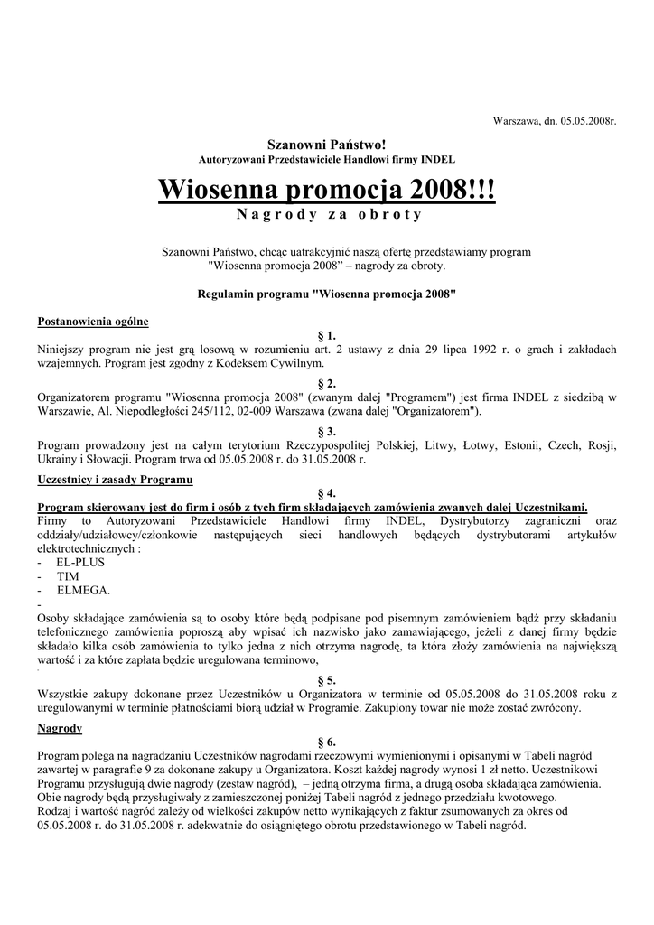 Warszawa, dn. 05.05.2008r. Szanowni Państwo! Autoryzowani Przedstawiciele Handlowi firmy INDEL Wiosenna promocja 2008!!! Nagrody za obroty Szanowni Państwo, chcąc uatrakcyjnić naszą ofertę przedstawiamy program "Wiosenna promocja 2008” – nagrody za obroty. Regulamin programu "Wiosenna promocja 2008" Postanowienia ogólne § 1. Niniejszy program nie jest grą losową w rozumieniu art. 2 ustawy z dnia 29 lipca 1992 r. o grach i zakładach wzajemnych. Program jest zgodny z Kodeksem Cywilnym. § 2. Organizatorem programu "Wiosenna promocja 2008" (zwanym dalej "Programem") jest firma INDEL z siedzibą w Warszawie, Al. Niepodległości 245/112, 02-009 Warszawa (zwana dalej "Organizatorem"). § 3. Program prowadzony jest na całym terytorium Rzeczypospolitej Polskiej, Litwy, Łotwy, Estonii, Czech, Rosji, Ukrainy i Słowacji. Program trwa od 05.05.2008 r. do 31.05.2008 r. Uczestnicy i zasady Programu § 4. Program skierowany jest do firm i osób z tych firm składających zamówienia zwanych dalej Uczestnikami. Firmy to Autoryzowani Przedstawiciele Handlowi firmy INDEL, Dystrybutorzy zagraniczni oraz oddziały/udziałowcy/członkowie następujących sieci handlowych będących dystrybutorami artykułów elektrotechnicznych : - EL-PLUS - TIM - ELMEGA. Osoby składające zamówienia są to osoby które będą podpisane pod pisemnym zamówieniem bądź przy składaniu telefonicznego zamówienia poproszą aby wpisać ich nazwisko jako zamawiającego, jeżeli z danej firmy będzie składało kilka osób zamówienia to tylko jedna z nich otrzyma nagrodę, ta która złoży zamówienia na największą wartość i za które zapłata będzie uregulowana terminowo, - § 5. Wszystkie zakupy dokonane przez Uczestników u Organizatora w terminie od 05.05.2008 do 31.05.2008 roku z uregulowanymi w terminie płatnościami biorą udział w Programie. Zakupiony towar nie może zostać zwrócony. Nagrody § 6. Program polega na nagradzaniu Uczestników nagrodami rzeczowymi wymienionymi i opisanymi w Tabeli nagród zawartej w paragrafie 9 za dokonane zakupy u Organizatora. Koszt każdej nagrody wynosi 1 zł netto. Uczestnikowi Programu przysługują dwie nagrody (zestaw nagród), – jedną otrzyma firma, a drugą osoba składająca zamówienia. Obie nagrody będą przysługiwały z zamieszczonej poniżej Tabeli nagród z jednego przedziału kwotowego. Rodzaj i wartość nagród zależy od wielkości zakupów netto wynikających z faktur zsumowanych za okres od 05.05.2008 r. do 31.05.2008 r. adekwatnie do osiągniętego obrotu przedstawionego w Tabeli nagród. § 7. W programie nie biorą udziału faktury zakupowe za rozszerzenie i pakiety mające możliwość zwrotu towaru. Chyba, że Uczestnik oświadczy, iż chce, aby taka faktura brała udział w programie i wówczas nie będzie zwracał towaru, a termin płatności będzie standardowy. Oświadczenie może być ustne lub pisemne ale musi być dokonane przed upływem standardowego terminu płatności. § 8. Warunkiem wzięcia udziału w promocji jest zakup u Organizatora dowolnych produktów za minimalną kwotę 800 zł netto, która uprawnia uczestnika do otrzymania nagrody. § 9. Tabela nagród Lp. Minimalna kwota netto dokonanych zakupów 1 1600 zł 2 3000 zł 3 4000 zł 4 6000 zł 5 10.000 zł 6 15.000 zł 7 20.000 zł 8 30.000 zł 9 40.000 zł 10 60.000 zł 11 100.000 zł Nagroda Radiobudzik sony IC-FC 205L lub Toster ROMIX TO 30 750W lub Głosniki komputerowe CREATIVE, inspire 265 lub Mysz komputerowa Trust do USB Telefon bezprzewodowy PANASONIC KX-TG 1100 lub Kamera internetowa MEDIATECH MT 4017 PIXER LED lub Myszka bezprzewodowa TRUST Mi 4520T lub Głośniki komputerowe INSPIRE A 200 Toster ZELMER Z7 2012 900W lub Wentylator DE LONGHI VL-P400, wysoki lub Zestaw głośników do komputera – 2+1 CREATIVE 3100 lub Radiobudzik PANASONIC RC-Q 720 EPE Odkurzacz SAMSUNG S.C. 4140 lub Głośniki komputerowe 5+1 CREATIVE INSPIRE 6100 lub Drukarka laserowa SAMSUNG 2010 PR lub Odtwarzacz DVD LG , DV-X 286 Czajnik SIEMENS – PORSCHE DESIGN TW911P2 lub Wentylator BORK SF-TOR 2960BK super elegancki lub Odtwarzacz DVD PIONEER DV400VS 369 silver lub Radiomagnetofon z CD PANASONIC RX-D 29 EK Odkurzacz ZXM-7010 workowy ELECTROLUX lub Aparat cyfrowy NIKON P50 czarny 8,1 mln lub Radioodtwarzacz samochodowy SONY MEX1GP Tel/fax laserowy PHILIPS LPF 925 lub Monitor LCD SAMSUNG SM 2032 20 cali lub Drukarka kolorowa SAMSUNG CLP 300N laserowa lub Palmtop MIO P360 GPS Monitor LCD+TV LG 20” M208-WA-BZ lub Kamera DVD SONY DCR-DVD 110 lub Zest. kina domowego PANASONIC S.C.-PT 550 czarny lub Nawigacja GPS BLAUPUNKT TRVEL PILOT LUCCA Komputer PC NTT home W603A INTEL 2,4 GHz 320GB lub Kamera DVD SONY DC-RDVD 410E, pamięć 8GB lub Nawigacja NOKIA N500+Automapa EU 5,0 30 krajów Telewizor TOSHIBA 32”, 32C 3500PG czarny lub Zest. kina domowego YAMAHA RXV361/DVD661 lub Notebook HP DV 6715EW 1,6GHz 2048 MB DDR Telewizor LG 42” 42LF75 FULL HD lub Laptop SONY FZ31M lub Laptop TOSHIBA Satelite U300-151 Wartość rynkowa nagrody 59,90 zł 59,90 zł 59,90 zł 59,90 zł 119 zł 119 zł 99 zł 99 zł 139 zł 149 zł 189 zł 149 zł 219 zł 199 zł 239 zł 199 zł 419 zł 429 zł 369 zł 429 zł 599 zł 599 zł 599 zł 749 zł 799 zł 799 zł 799 zł 1149 zł 1199 zł 1199 zł 1299 zł 1899 zł 1849 zł 1699 zł 2799 zł 2699 zł 2699 zł 4499 zł 4499 zł 4449 zł Co stanowi około % wartości zakupu 7% 7% 7% 7% 8% 8% 8% 8% 9% 9% 9% § 10. Nagrody zostaną dostarczone na koszt Organizatora za potwierdzeniem odbioru w terminie 30 dni od terminowego uregulowania płatności za faktury biorące udział w Programie. Uczestnik, który zakwalifikuje się na nagrodę zostanie o tym poinformowany. § 11. Organizator zastrzega sobie prawo do zamiany, z przyczyn niezależnych od Organizatora, nagród na inne, o tym samym charakterze i podobnej wartości rynkowej. Nagrody rzeczowe nie podlegają wymianie na ekwiwalent pieniężny, ani też na inne przedmioty. Postanowienia końcowe § 12. 
