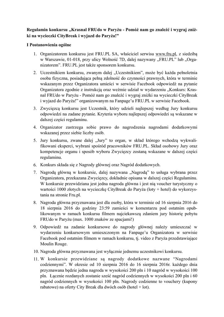 Regulamin konkursu „Krasnal FRUdo w Paryżu - Pomóż nam go znaleźć i wygraj zniżki na wycieczki CityBreak i wyjazd do Paryża!” I Postanowienia ogólne 1. Organizatorem konkursu jest FRU.PL SA, właściciel serwisu www.fru.pl, z siedzibą w Warszawie, 01-018, przy ulicy Wolność 7D, dalej nazywany „FRU.PL” lub „Organizatorem”. FRU.PL jest także sponsorem konkursu. 2. Uczestnikiem konkursu, zwanym dalej „Uczestnikiem”, może być każda pełnoletnia osoba fizyczna, posiadająca pełną zdolność do czynności prawnych, która w terminie wskazanym przez Organizatora umieści w serwisie Facebook odpowiedź na pytanie Organizatora zgodnie z instrukcją oraz weźmie udział w wydarzeniu „Konkurs: Krasnal FRUdo w Paryżu - Pomóż nam go znaleźć i wygraj zniżki na wycieczki CityBreak i wyjazd do Paryża!” organizowanym na Fanpage’u FRU.PL w serwisie Facebook. 3. Zwycięzcą konkursu jest Uczestnik, który udzieli najlepszej według Jury konkursu odpowiedzi na zadane pytanie. Kryteria wyboru najlepszej odpowiedzi są wskazane w dalszej części regulaminu. 4. Organizator zastrzega sobie prawo do nagrodzenia nagrodami dodatkowymi wskazanej przez siebie liczby osób. 5. Jury konkursu, zwane dalej „Jury” to organ, w skład którego wchodzą wykwalifikowani eksperci, wybrani spośród pracowników FRU.PL. Skład osobowy Jury oraz kompetencje organu i sposób wyboru Zwycięzcy zostaną wskazane w dalszej części regulaminu. 6. Konkurs składa się z Nagrody głównej oraz Nagród dodatkowych. 7. Nagrodą główną w konkursie, dalej nazywana „Nagrodą” to usługa wybrana przez Organizatora, przekazana Zwycięzcy, dokładnie opisana w dalszej części Regulaminu. W konkursie przewidziana jest jedna nagroda główna i jest nią voucher turystyczny o wartości 1000 złotych na wycieczkę CityBreak do Paryża (loty + hotel) do wykorzystania na stronie Fru.pl. 8. Nagroda główna przyznawana jest dla osoby, która w terminie od 16 sierpnia 2016 do 18 sierpnia 2016 do godziny 23:59 zamieści w komentarzu pod ostatnim opublikowanym w ramach konkursu filmem najciekawszą zdaniem jury historię pobytu FRUdo w Paryżu (max. 1000 znaków ze spacjami!) 9. Odpowiedź na zadanie konkursowe do nagrody głównej należy umieszczać w wydarzeniu konkursowym umieszczonym na Fanpage’u Organizatora w serwisie Facebook pod ostatnim filmem w ramach konkursu, tj. video z Paryża przedstawiające Moulin Rouge. 10. Nagroda główna przyznawana jest wyłącznie jednemu uczestnikowi konkursu. 11. W konkursie przewidziane są nagrody dodatkowe nazwane “Nagrodami codziennymi”. W okresie od 10 sierpnia 2016 do 16 sierpnia 2016r. każdego dnia przyznawana będzie jedna nagroda w wysokości 200 pln i 10 nagród w wysokości 100 pln. Łącznie rozdanych zostanie sześć nagród codziennych w wysokości 200 pln i 60 nagród codziennych w wysokości 100 pln. Nagrody codzienne to vouchery (kupony rabatowe) na oferty City Break dla dwóch osób (hotel + lot). 12. Nagrody codzienne w formie voucherów przyznawane są dla uczestników konkursu, którzy w formie komentarza pod zamieszczonym video na facebooku poprawnie odpowiedzą na zadane zadania konkursowe. 13. Zadania konkursowe dzielą się na trzy kategorie. 14. Pierwsza kategoria zadań konkursowych to zadania tzw. Kto pierwszy ten lepszy. Dla osoby która jako pierwsza w komentarzu pod video poprawnie wskaże miejsce oraz czas pojawienia się krasnala FRUdo wygrywa voucher o wartości 200 pln, dla kolejnych 10 osób, które podadzą w komentarzu poprawną odpowiedź czekają vouchery o wartości 100 pln. 15. Druga kategoria zadań konkursowych to zadania opisowe. Dla osoby, która zdaniem jury w komentarzu zamieści najciekawszą krótką historię opisującą dlaczego krasnal znalazł się w danym miejscu na materiale video oraz poda dokładny czas kiedy FRUdo jest widoczny wygrywa voucher 200pln. Dla pozostałych 10 osób które napiszą zdaniem jury ciekawe historie czekają vouchery o wartości 100 pln. 16. Trzecia kategoria zadań konkursowych to zadania angażujące. Dla osoby, która napisze w komentarzu pod danym filmem w której sekundzie widoczny jest krasnal oraz zamieści zdaniem jury najciekawsze zdjęcie, filmik, mem lub grafikę z dowolnym krasnalem czeka voucher o wartości 200 pln. Dla 10 pozostałych najciekawszych zdaniem jury zdjęć, filmików, memów bądź grafik z krasnalem czekają vouchery o wartości 100 pln. 17. Do każdego video przyporządkowana zostanie tylko jedna kategoria zadań konkursowych. 18. Krasnal FRUdo to krasnal ogrodowy, który został umieszczony na kilku video z Paryżą nakręconych w technologii 360. 19. Konkurs nie podlega zatwierdzeniu w trybie określonym w ustawie z dnia 19 listopada 2009 r. o grach hazardowych (Dz. U. z 2009 r. Nr 201, poz. 1540 z późn. zm.). Organizator oświadcza, że Konkurs nie jest grą losową, loterią fantową, zakładem wzajemnym, loterią promocyjną, której wynik zależy od przypadku, ani żadną inną formą przewidzianą w ustawie z dnia 19 listopada 2009 r. o grach hazardowych. II Przebieg i czas trwania konkursu 20. Konkurs rozpoczyna się 10 sierpnia 2016 roku o godzinie 11:00 i trwa do 18 sierpnia 2016 roku do godziny 23:59. 21. Organizator zastrzega sobie prawo do zawieszenia konkursu, jego odwołania, skrócenia lub przedłużenia terminu jego trwania bez podania przyczyny. Wszelkie zmiany w zakresie czasu trwania konkursu będą ogłaszane w siedzibie Organizatora. 22. Warunkiem udziału w konkursie jest zapoznanie się z niniejszym Regulaminem oraz akceptacja wszystkich jego zapisów. 23. Warunkiem udziału w konkursie jest bycie osobą pełnoletnią. 24. Uczestnik bierze udział w konkursie poprzez odpowiedź na pytanie konkursowe zgodnie z instrukcją Organizatora. Odpowiedzi do nagrody głównej należy udzielać za pomocą prywatnej wiadomości na facebooku na fanpage’u FRU.PL, natomiast w przypadku nagrody dodatkowej w formie komentar