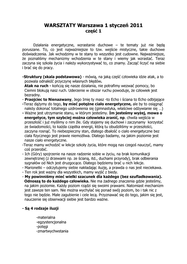 WARSZTATY Warszawa 1 styczeń 2011 część 1 Działania energetyczne, wzrastanie duchowe – te tematy już nie będą poruszane. To, co jest najważniejsze to tzw. wejście mistyczne, takie duchowe doświadczenia. Jak wchodzimy w te stany to wszystko jest cudowne. Najważniejsze, że poznaliśmy mechanizmy wchodzenia w te stany i wiemy jak wzrastać. Teraz zaczyna się szkoła życia i należy wykorzystywać to, co znamy. Zacząć liczyć na siebie i brać się do pracy. -Struktury (skala podstawowa) - mówią, na jaką część człowieka idzie atak, a to pozwala odnaleźć przyczynę własnych błędów. Atak na ruch - kończą się nasze działania, nie potrafimy wezwać pomocy, bo Ciemni blokują nasz ruch. Uderzenie w obszar ruchu powoduje, że człowiek jest bezradny. - Praojciec to Nienazwany, Jego Imię ty masz -to Echo i ściana to Echo odbijające -Teraz dążymy do tego, by mieć potężne ciało energetyczne, ale by to osiągnąć należy dokonać totalnego uzdrowienia się (gimnastyka, właściwe odżywianie się …) - Ważne jest utrzymanie stanu, w którym jesteśmy. Im jesteśmy wyżej, mowa o energetyce, tym szybciej można człowieka zranić, np. chwila wejścia w przeszłość i już myślimy o nim źle. Gdy stajemy się duchowi i zaczynamy korzystać ze świadomości, to każda cząstka energii, którą tu obudziliśmy w przeszłości, zaczyna rosnąć. To niebezpieczny stan, dlatego dbałość o ciało energetyczne bez ciała fizycznego jest prawie niemożliwa. Dlatego badamy, na jakim poziomie jest nasze ciało energetyczne. -Teraz mamy wchodzić w lekcje szkoły życia, które mogą nas czegoś nauczyć, mamy coś przerobić. - Ich (Góry) spojrzenie na nasze radzenie sobie w życiu, na brak komunikacji zewnętrznej (z drzewami np. ze ścianą, itd., duchami przyrody), brak odbierania sygnałów od Nich jest druzgocące. Dlatego będziemy brać u nich lekcje. - Marionetki – odczytujemy siebie nakładając iluzję, a prawda o nas jest nieciekawa. - Ten rok jest ważny dla wszystkich, mamy wyjść z biedy. - My powinniśmy mieć wielki szacunek dla każdego (bez szufladkowania). Odnoszą to do każdego człowieka. Nie ma żadnego znaczenia gdzie jesteśmy, na jakim poziomie. Każdy poziom rządzi się swoimi prawami. Natomiast mechanizm jest zawsze ten sam. Nie można wychylać się ponad swój poziom, bo i tak nic z tego nie będzie. Małe zagubienie i cele lecą. Przyznawać się do tego, jakim się jest, nauczenie się obserwacji siebie jest bardzo ważne. - Są 4 rodzaje iluzji -materialna -egzystencjonalna -potęgi -zmartwychwstania Świat materialny jest projekcją Ducha i stanowi podstawę doświadczenia tylko w czasie istnienia ciała fizycznego (jesteśmy w grze komputerowej, nie ma tu dobra i zła, jest przyczyna i skutek energetyczną). Egzystencja jest grą, której zasady są zmienne i wyznaczone: Mocą Energetyczną dla Ciała Fizycznego, Mocą Duchową dla Ciała Energetycznego (Duszy), Mocą Boską dla Ciała Duchowego i Mocą Rzeczywistości dla Boga, co oznacza, ze każdy ma wpływ na parametry egzystencji. Bóg jest zależny od nas. To, co tworzy wyznacza horyzont Jego istnienia, nic przeciwko nam nie może zrobić, ale może nam pokazać mechanizm naprawy. - Potęga nie istnieje, bowiem rytm na Górze wyznaczają ruchy na dole i odwrotnie. - Z martwych nic nie powstaje, bo nic nie jest martwe, tylko przeistaczające się. Gdy wkroczysz do Nurtu zmian, będziesz mógł wykorzystać Ruch do ukierunkowania zmian (dlatego ta struktura Ruchu jest dla nas ważna, jest ważniejsza od ruchu fizycznego – w górę i w dół,ale jak jadę na wprost to ważna jest komunikacja, czyli ciało fizyczne). Jedyną zmienną jest chwila oraz pamięć tego, co było. Ale gdy utoniesz w tym co było Stracisz szansę na postrzeganie tego co się zmienia. Na dodatek każde z Twoich ciał śni, marzy i działa w innym obszarze. Bacz, więc, by żadne z nich (tych ciał) nie tonęło w iluzji zmian i będąc zakotwiczonym w duchowym, energetycznym (egzystencjonalnym) bądź materialnym ( choroba) marazmie. Dostrzeż Ruch, a staniesz się wielkim, zmiennym (musimy zacząć dostrzegać Ruch), czasami dostrzegamy czując zagrożenie. Postrzeż też, że wystarczy wówczas niewielka moc, ociupinka mocy, ledwie jej echo, by zmiany podążyły wskazaną przez Ciebie drogą. Dlatego Moc i Miłość jest ciszą, a Ten, który wszystko wypełnia jest dla niewidzących Ruchu – Nieistniejącym, choć On Sam jest najbardziej widoczny. Ten najbardziej widoczny to Bóg. Nie widzisz Ruchu, nie odbierasz tego sygnału - to nie masz pojęcia, że Boga nie ma, a duchowo czujesz, że Bóg gdzieś jest.. Gdy widzisz z daleka zdjęcie, możesz założyć, że jest to realna rzeczywistość. Dopiero zbliżywszy się do zdjęcia odczujesz swoją omyłkę. Wielu z Was żyje takimi omyłkami, wiedząc coś, co jest martwe, co jest za przeszłością albo było tworzone jedynie jako nie zaistniała w Ruchu koncepcja. Czasem zaś widzicie Ruch spowodowany przez innych sądząc, że jest to efekt Waszych starań, nie wiecie przy tym, że każdy ma swoją wibrację, że jest kodem myśli, emocji i emanacji, a więc kształtujących bieg cząstek, ścieżek wywołanych nie Waszym staraniem, które budząc w Was określone skojarzenia i stany stają się cząstką Waszych wyborów, choćbyście o tym nie wiedzieli ( koncepcja wdrukowywania uczuć itd.) Im gęstsze są owe emanacje, tym silniej pętlą i uzależniają ludzi, tworząc w nich iluzję poprawności dążeń. Skrypt warsztatów autorskich Z.J. POPKO lata 2008-2011 © www.popko.pl 1 Sprawdź poziom wibracji własnej duszy, potem myśli i emocji (skala poziomów duchowych) oraz wewnętrznych zdjęć, a rozpoznasz, w jakim procesie żyjesz snem innych, a w jakim się spełniasz. Dopóki iluzji nie odrzucisz, dopóty wolnym od cudzego Ruchu, od cudzych dążeń nie będziesz. Śniący innymi doskonale znają te zależności i umiejętnie