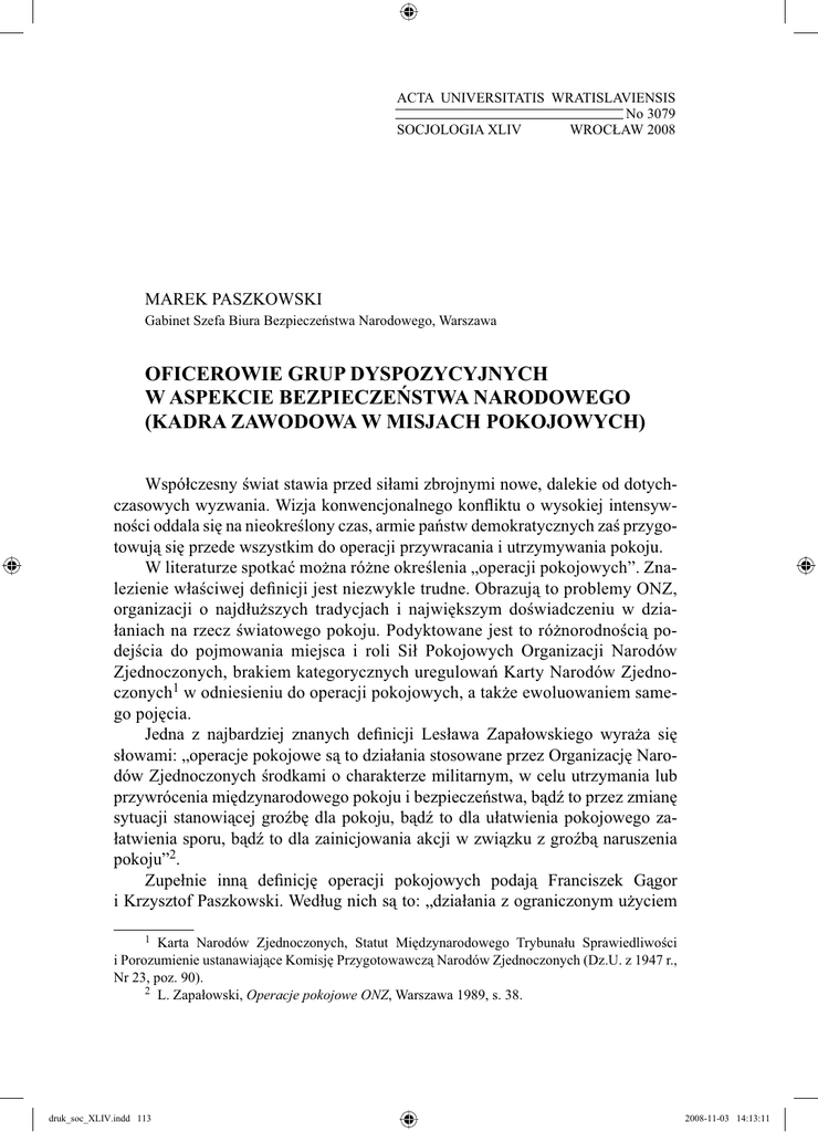 ACTA UNIVERSITATIS WRATISLAVIENSIS No 3079 SOCJOLOGIA XLIV WROCŁAW 2008 MAREK PASZKOWSKI Gabinet Szefa Biura Bezpieczeństwa Narodowego, Warszawa OFICEROWIE GRUP DYSPOZYCYJNYCH W ASPEKCIE BEZPIECZEŃSTWA NARODOWEGO (KADRA ZAWODOWA W MISJACH POKOJOWYCH) Współczesny świat stawia przed siłami zbrojnymi nowe, dalekie od dotychczasowych wyzwania. Wizja konwencjonalnego konfliktu o wysokiej intensywności oddala się na nieokreślony czas, armie państw demokratycznych zaś przygotowują się przede wszystkim do operacji przywracania i utrzymywania pokoju. W literaturze spotkać można różne określenia „operacji pokojowych”. Znalezienie właściwej definicji jest niezwykle trudne. Obrazują to problemy ONZ, organizacji o najdłuższych tradycjach i największym doświadczeniu w działaniach na rzecz światowego pokoju. Podyktowane jest to różnorodnością podejścia do pojmowania miejsca i roli Sił Pokojowych Organizacji Narodów Zjednoczonych, brakiem kategorycznych uregulowań Karty Narodów Zjednoczonych1 w odniesieniu do operacji pokojowych, a także ewoluowaniem samego pojęcia. Jedna z najbardziej znanych definicji Lesława Zapałowskiego wyraża się słowami: „operacje pokojowe są to działania stosowane przez Organizację Narodów Zjednoczonych środkami o charakterze militarnym, w celu utrzymania lub przywrócenia międzynarodowego pokoju i bezpieczeństwa, bądź to przez zmianę sytuacji stanowiącej groźbę dla pokoju, bądź to dla ułatwienia pokojowego załatwienia sporu, bądź to dla zainicjowania akcji w związku z groźbą naruszenia pokoju”2. Zupełnie inną definicję operacji pokojowych podają Franciszek Gągor i Krzysztof Paszkowski. Według nich są to: „działania z ograniczonym użyciem 1 Karta Narodów Zjednoczonych, Statut Międzynarodowego Trybunału Sprawiedliwości i Porozumienie ustanawiające Komisję Przygotowawczą Narodów Zjednoczonych (Dz.U. z 1947 r., Nr 23, poz. 90). 2 L. Zapałowski, Operacje pokojowe ONZ, Warszawa 1989, s. 38. druk_soc_XLIV.indd 113 2008-11-03 14:13:11 114 MAREK PASZKOWSKI sił zbrojnych podejmowane przez społeczność międzynarodową w celu utrzymania lub przywrócenia pokoju w rejonie konfliktu”3. Polska ma w tej dziedzinie bardzo bogate doświadczenie. Minęło pół wieku od momentu, gdy nasi żołnierze po raz pierwszy wyjechali na Półwysep Indochiński w 1953 r. jako obserwatorzy wojskowi. Dotychczasowy bilans udziału w operacjach poza granicami państwa to ponad 64 000 żołnierzy i pracowników wojska uczestniczących w 66 misjach pokojowych i operacjach wojskowych prowadzonych na terytoriach 39 państw. Podstaw prawnych zaangażowania Wojska Polskiego poza granicami państwa szukać należy przede wszystkim w ustawie zasadniczej4, zgodnie z art. 9 mówiącym, że Polska przestrzega wiążącego ją prawa międzynarodowego. Art. 87 Konstytucji RP stwierdza, że źródłem prawa oprócz samej Konstytucji są ustawy, ratyfikowane umowy międzynarodowe oraz rozporządzenia. Do użycia sił zbrojnych poza granicami kraju odnosi się bezpośrednio art. 117 Konstytucji RP, w myśl którego zasady użycia Sił Zbrojnych RP poza granicami Rzeczypospolitej Polskiej określa ratyfikowana umowa międzynarodowa lub ustawa. Ponadto podstawę prawną użycia sił zbrojnych poza granicami państwa stanowi ustawa o zasadach użycia lub pobytu SZ RP poza granicami państwa5. O użyciu jednostek wojskowych poza granicami państwa oraz o przedłużeniu lub skróceniu ich pobytu postanawia Prezydent Rzeczypospolitej Polskiej na wniosek Rady Ministrów. Obecnie Siły Zbrojne RP (SZ RP) i policja uczestniczą w 17 misjach poza granicami państwa, w których służbę pełni ponad 2200 żołnierzy i pracowników wojska oraz 135 policjantów. SZ RP utworzyły 6 kontyngentów: dwa do operacji prowadzonych przez ONZ (Syria, Liban), jeden do operacji Unii Europejskiej (Bośnia i Hercegowina), dwa do operacji prowadzanej przez NATO (Kosowo, Afganistan) oraz kontyngent wojskowy do operacji sił wielonarodowych w Iraku. Dodatkowo należy tu wspomnieć polskich obserwatorów wojskowych, którzy pełnią służbę w misjach pokojowych w ramach OBWE (Gruzja) i ONZ (Etiopia i Erytrea, Gruzja, Kongo, Kosowo, Sahara Zachodnia, Liberia, Afganistan, Wybrzeże Kości Słoniowej oraz Sudan). 3 F. Gągor, K. Paszkowski, Międzynarodowe operacje pokojowe w doktrynie obronnej RP, Wydawnictwo Adam Marszałek Toruń 1999, s. 52. 4 Konstytucja Rzeczypospolitej Polskiej z dnia 2 kwietnia 1997 roku uchwalona przez Zgromadzenie Narodowe w dniu 2 kwietnia 1997 roku (Dz.U. z 1997 r., Nr 78, poz. 483). 5 Ustawa z dnia 17 grudnia 1998 roku o zasadach użycia lub pobytu Sił Zbrojnych Rzeczypospolitej Polskiej poza granicami państwa (Dz.U. Nr 162, poz. 1117 z późn. zm.). druk_soc_XLIV.indd 114 2008-11-03 14:13:11 Oficerowie grup dyspozycyjnych a bezpieczeństwo narodowe 115 AKTUALNE MISJE Polski Kontyngent Wojskowy w Siłach Rozdzielająco-Obserwacyjnych ONZ na Wzgórzach Golan – (UNDOF)6 w Syrii PKW działa w składzie sił nadzorujących utrzymanie zawieszenia broni miedzy Izraelem a Syryjską Republiką Arabską. Podstawą prawną funkcjonowania PKW jest: Rezolucja Rady Bezpieczeństwa Nr 350 z 31 maja 1974 r. o ustanowieniu sił rozdzielająco-obserwacyjnych UNDOF; Rezolucja Nr 1685 z 13 czerwca 2006 r. przedłużająca mandat o kolejne 6 miesięcy do dnia 31.12.2006 r.; Postanowienie Prezydenta RP z dnia 18 grudnia 2006 r. PKW UNDOF stacjonuje na Wzgórzach Golan od 1974 r. Obecnie w jego skład wchodzą: batalion operacyjny i personel w Kwaterze Głównej misji, razem 392 żołnierzy. Polski Kontyngent Wojskowy w Tymczasowych Siłach Zbrojnych ONZ – (UNIFIL)7 w Libanie Zapoczątkowane 12 lipca 2006 r. ostatnie działanie zbrojne między libańskim Hezbollahem a Izraelem zostały przerwane 14 sierpnia 2006 r., kiedy to obie strony konfliktu zaakceptowały Rezolucję Rada Bezpieczeństwa ONZ nr 1701, wzywającą do obustronnego zawieszeni