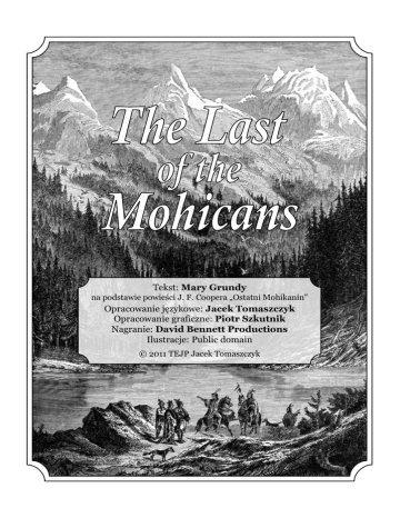 Tekst: Mary Grundy na podstawie powieści J. F. Coopera „Ostatni Mohikanin” Opracowanie językowe: Jacek Tomaszczyk Opracowanie graficzne: Piotr Szkutnik Nagranie: David Bennett Productions Ilustracje: Public domain © 2011 TEJP Jacek Tomaszczyk The Last of the Mohicans – www.isel.pl I T is the year 1757. North America is gripped by war. The French and the British are fighting for control of the land and its people. Both sides have Native American allies to act as guides and warriors in the hostile land. The European settlers live in terror, feeling they will lose, no matter who wins the war. No one wants to leave their fortress settlements, afraid of being killed by Indians or French and British soldiers. Two British forts, Fort Henry and Fort Edward, sit about 25 kilometres apart and defend the south from French and Indian invasion. Colonel Munro, commander of Fort Henry, needs more troops to fight against an upcoming French attack. 1500 men have been ordered to march from Fort Edward to Fort Henry. Munro’s daughters, Alice and Cora must travel to meet him at Fort Henry. He decides they will be safe if they accompany the soldiers. Duncan Heyward is to escort the young women. Magua, a Huron Indian has offered to guide them on a different route, which Magua insists will be quicker. The story begins at Fort Edward with Heyward, Alice and Cora discussing this plan. Magua is on foot while the others ride horses. Magua does not speak much and appears frightening to the women, especially to Alice. ‘Are you certain we can trust this man?’ Alice asks Heyward. ‘I know Magua, and I trust him. You must trust me, Alice.’ Heyward tells her. ‘He will take us on a route that others do not know. The troops are taking a well-known path. Magua’s way is safer.’ ‘He does not look trustworthy to me,’ Alice says. ‘Alice, we cannot judge a man by the colour of his skin.’ Cora has been listening, but interrupts. Heyward admires this statement and begins to take 2 gripped by war ogarnięty wojną ally (l.mn. allies) sprzymierzeniec, sojusznik guide zwiadowca, przewodnik; prowadzić warrior wojownik hostile wrogi settler osadnik no matter who bez względu na to, kto fortress settlements fortyfikacje soldier żołnierz fort fort sit about 25 kilometres apart być oddalonym od siebie o ok. 25 km colonel porucznik troop oddział upcoming zbliżający się, nadchodzący order rozkazać march maszerować safe bezpieczny accompany towarzyszyć escort eskortować route szlak insist uparcie twierdzić, upierać się on foot pieszo appear wydawać się trustworthy godny zaufania judge osądzać interrupt przerywać admire podziwiać statement wypowiedź The Last of the Mohicans – www.isel.pl notice of her beauty. Indeed, both Cora and her sister are beautiful, though opposite in nearly every way. Cora’s black hair, dark eyes and honey-coloured skin are equal in beauty to Alice’s blonde hair, blue eyes and pale complexion. ‘I suppose it will be better than travelling with 1500 noisy soldiers,’ Alice decides and follows Magua onto the path he has shown them. T HE group does not travel far before they stop dead. They can hear someone on horseback crashing about in the woods. Have they been followed by warriors? Has Magua betrayed them? Approaching from behind them is not an enemy warrior, but a very tall, strange looking man on a very young horse. ‘What are you doing here?’ Heyward demands of the stranger. ‘I am travelling to Fort Henry also, and I decided to follow you. I am sure your path will take me to my destination sooner,’ the stranger says. ‘Why should I let you join us? You should turn back and travel with the troops,’ Heyward says. ‘I have no gun, so I am not a threat to you or your group.’ ‘What is your business with the army if you do not carry a gun?’ ‘I am a singer. I sing from the Bible and spread the word of God.’ Heyward decides the man is right; he is not a threat. Alice is thrilled to have the stranger join them because she also loves to 3 take notice of zwracać uwagę na equal in beauty równie piękny pale complexion blada cera stop dead zatrzymać się nagle w miejscu on horseback konno crash about przemieszczać się z trzaskiem follow śledzić betray zdradzić approach zbliżać się enemy wróg demand zapytać stanowczo; domagać się destination cel podróży let pozwolić turn back zawrócić gun broń threat zagrożenie spread rozpowszechniać thrilled podekscytowany