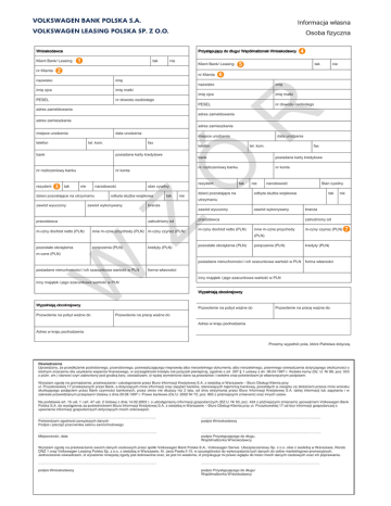VOLKSWAGEN BANK POLSKA S.A. Informacja własna Osoba fizyczna VOLKSWAGEN LEASING POLSKA SP. Z O.O. Wnioskodawca Przystępujący do długu/ Współmałżonek Wnioskodawcy Klient Bank/ Leasing nr Klienta 1 tak nie Klient Bank/ Leasing 2 nr Klienta nazwisko imię imię ojca imię matki PESEL nr dowodu osobistego 5 tak nie 6 nazwisko imię imię ojca imię matki PESEL nr dowodu osobistego R adres zameldowania 4 adres zameldowania adres zamieszkania adres zamieszkania miejsce urodzenia data urodzenia telefon tel. kom. miejsce urodzenia fax telefon posiadane karty kredytowe nr rozliczeniowy banku nr konta 3 tak nie rezydent stan cywilny odbyta służba wojskowa zawód wykonywany tak nie branża pracodawca tak nr konta nie dzieci pozostające na narodowość odbyta służba wojskowa zawód wykonywany pracodawca m-czny dochód netto (PLN) inne m-czne przychody (PLN) m-czny czynsz (PLN) pozostałe obciążenia poręczenia (PLN) m-czny dochód netto (PLN) tak nie branża zatrudniony od inne m-czne przychody m-czny czynsz (PLN) 7 (PLN) pozostałe obciążenia (PLN) kredyty (PLN) Stan cywilny utrzymaniu zawód wyuczony zatrudniony od fax posiadane karty kredytowe Z zawód wyuczony bank nr rozliczeniowy banku narodowość dzieci pozostające na utrzymaniu tel. kom. Ó bank rezydent data urodzenia poręczenia (PLN) kredyty (PLN) W m-czne (PLN) posiadane nieruchomości i ich szacunkowa wartość w PLN posiadane nieruchomości i ich szacunkowa wartość w PLN inny majątek i jego szacunkowa wartość w PLN inny majątek i jego szacunkowa wartość w PLN Wypełniają obcokrajowcy Wypełniają obcokrajowcy Pozwolenie na pobyt ważne do forma własności forma własności Pozwolenie na pobyt ważne do Pozwolenie na pracę ważne do Pozwolenie na pracę ważne do Adres w kraju pochodzenia Adres w kraju pochodzenia Prosimy wypełnić pola, które Państwa dotyczą. Oświadczenia Uprzedzony, Ŝe przedłoŜenie podrobionego, przerobionego, poświadczającego nieprawdę albo nierzetelnego dokumentu albo nierzetelnego, pisemnego oświadczenia dotyczącego okoliczności o istotnym znaczeniu dla uzyskania wsparcia finansowego, w szczególności kredytu lub poŜyczki pienięŜnej, zgodnie z art. 297 § 1 ustawy z dn. 06.04.1997 r. Kodeks karny (Dz. U. Nr 88, poz. 553 z późn. zm.) stanowi czyn zabroniony pod groźbą kary, oświadczam, iŜ wyŜej wymienione dane są prawdziwe i rzetelne oraz potwierdzam je własnoręcznym podpisem. WyraŜam zgodę na gromadzenie, przetwarzanie i udostępnianie przez Biuro Informacji Kredytowej S.A. z siedzibą w Warszawie – Biuro Obsługi Klienta przy ul. Pruszkowskiej 17 przekazanych przez Bank, a dotyczących mnie informacji oraz zapytań banków, stanowiących tajemnicę bankową, powstałych w związku ze złoŜeniem przeze mnie wniosku skutkującego podjęciem przez Bank czynności bankowych, przez okres nie dłuŜszy niŜ 2 lata, od dnia otrzymania przez Biuro Informacji Kredytowej S.A. takiej informacji lub zapytania i w zakresie przewidzianym przepisami Ustawy z dnia 29.08.1997 r. Prawo bankowe (Dz.U. 2002 Nr 72, poz. 665 z późniejszymi zmianami) oraz innych ustaw. Na podstawie art. 15 ust. 1 i art. 47 ust. 2 Ustawy z dnia 14.02.2003 r. o udostępnianiu informacji gospodarczych (DZ.U. Nr 50, poz. 424 z późniejszymi zmianami) upowaŜniam Volkswagen Bank Polska S.A. do wystąpienia za pośrednictwem Biura Informacji Kredytowej S.A. z siedzibą w Warszawie – Biuro Obsługi Klienta przy ul. Pruszkowskiej 17 od biur informacji gospodarczej o ujawnienie informacji gospodarczych dotyczących moich zobowiązań. ..................................................................................................................... Potwierdzam zgodność powyŜszych danych Podpis i pieczęć pracownika salonu samochodowego ....................................................................................................................... podpis Wnioskodawcy ...................................................................................................................... Miejscowość, data ....................................................................................................................... podpis Przystępującego do długu, WspółmałŜonka Wnioskodawcy WyraŜam zgodę na przetwarzanie swoich danych osobowych przez spółki Volkswagen Bank Polska S.A., Volkswagen Serwis Ubezpieczeniowy Sp. z o.o. obie z siedzibą w Warszawie, Rondo ONZ 1 oraz Volkswagen Leasing Polska Sp. z o.o. z siedzibą w Warszawie, Al. Jana Pawła II 15, w szczególności do wykorzystania tych danych do celów marketingowo-promocyjnych. Jednocześnie oświadczam, iŜ wyraŜenie niniejszej zgody jest dobrowolne oraz, Ŝe jest mi wiadome, iŜ przysługuje mi prawo wglądu do treści moich danych osobowych oraz ich poprawiania. ...................................................................................................................... podpis Wnioskodawcy ...................................................................................................................... podpis Przystępującego do długu/ WspółmałŜonka Wnioskodawcy Informacja własna Osoba Fizyczna – instrukcja wypełniania 1 Zaznacz „tak”, jeśli byłeś już wcześniej Klientem Volkswagen Bank Polska S.A. lub Volkswagen Leasing Sp. z o.o. 2 Jeżeli powyżej wybrałeś „tak” podaj swój numer Klienta, czyli pierwsze 7 cyfr Twojej umowy Kredytu/Leasingu 3 Zaznacz czy mieszkasz na terenie Polski 4 Tę sekcję musi wypełnić Twój Współmałżonek objęty ustrojem wspólnoty majątkowej lub osoba przystępująca do długu 5 Jeżeli Twój Współmałżonek/osoba przystępująca do długu była już wcześniej Klientem Volkswagen Bank Polska S.A. lub Volkswagen Leasing Sp. z o.o., powinna zaznaczyć „tak” 6 Podaj swój numer Klienta, czyli pierwsze 7 cyfr Twojej umowy Kredytu/Leasingu w przypadku wybrania opcji „tak” w wierszu wyżej 7 Podaj swój miesięczny koszt związany z zamiesz