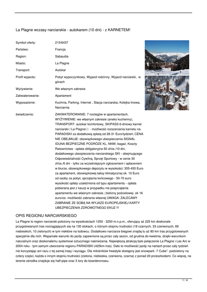 La Plagne wczasy narciarskie - autokarem (10 dni) - z KARNETEM! Symbol oferty: 215/6437 Państwo: Francja Region: Sabaudia Miasto: La Plagne Transport: Autokar Profil wyjazdu: Pobyt wypoczynkowy, Wyjazd rodzinny, Wyjazd narciarski, w Wyżywienie: We własnym zakresie Zakwaterowanie: Apartament Wyposażenie: Kuchnia, Parking, Internet , Stacja narciarska, Kolejka linowa, świadczenia: ZAKWATEROWANIE: 7 noclegów w apartamentach, górach Narciarnia WYŻYWIENIE: we własnym zakresie (aneks kuchenny), TRANSPORT: autokar komfortowy, SKIPASS 6-dniowy karnet narciarski La Plagne - możliwość rozszerzenia karnetu na PARADISKI za dodatkową opłatą od 28-31 Euro/tydzień; CENA NIE OBEJMUJE: obowiązkowego ubezpieczenia SIGNAL IDUNA BEZPIECZNE PODRÓZE KL, NNW, bagaż, Koszty Ratownictwa - opłata obligatoryjna 50 zł/os./10 dni, dodatkowego ubezpieczenia narciarskiego SKI - obejmującego Odpowiedzialność Cywilną, Sprzęt Sportowy - w cenie 30 zł/os./6 dni - tylko za wcześniejszym zgłoszeniem i opłaceniem w biurze, obowiązkowego depozytu w wysokości: 305-450 Euro za apartament, obowiązkowej taksy klimatycznej ok. 10 Euro od osoby za pobyt, sprzątania końcowego - 50-70 euro wysokość opłaty uzależniona od typu apartamentu - opłata pobierana jest z kaucji w przypadku nie posprzątania apartamentu we własnym zakresie.; bielizny pościelowej- ok 16 euro/os- możliwość zabrania własnej UWAGA: ZALECAMY ZABRANIE ZE SOBĄ NA WYJAZD EUROPEJSKIEJ KARTY UBEZPIECZENIA ZDROWOTNEGO EKUZ !!! OPIS REGIONU NARCIARSKIEGO La Plagne to region narciarski położony na wysokościach 1250 - 3250 m.n.p.m., oferujący aż 225 km doskonale przygotowanych tras rozciągających się na 130 stokach, o różnym stopniu trudności (18 czarnych, 33 czerwonych, 69 niebieskich, 10 zielonych) w tym niektóre na lodowcu. Dodatkowo narciarze biegowi znajdą tu aż 80 km tras przygotowanych specjalnie dla nich. Wspaniałe warunki do jazdy zapewnione są przez cały sezon, od grudnia do kwietnia, dzięki warunkom naturalnym oraz doskonałemu systemowi sztucznego naśnieżania. Największą atrakcją było połączenie La Plagne i Les Arc w 2004 roku - tym samym utworzenie regionu PARADISKI (425km tras). Dało to możliwość jazdy na nartach przez cały tydzień nie korzystając ani razu z tej samej trasy i wyciągu. Dla miłośników freestyle dostępny jest snowpark -7 Cube”- podzielony na cztery części, każda o innym stopniu trudności (zielona, niebieska, czerwona, czarna) z ponad 20 przeszkodami. Co więcej, na terenie ośrodka znajduje się half-pipe oraz 3 tory do boardercrossu. 1/4 LA PLAGNE La Plagne to jeden z największych i najpopularniejszych ośrodków narciarskich nie tylko we Francji, ale również i w Europie, położony na wysokości 1250m -3250 m w regionie Rodan-Alpy. Powstał w latach 70- tych XX wieku i składa się z dwóch pięter. Pierwsze piętro (zwane górnym) ciągnie się pomiędzy sześcioma stacjami narciarskimi, a lodowcem. Każda ze stacji wchodzących w skład górnego piętra zawiera w nazwie słowo Plagne i została stworzona z myślą o narciarzach. Pozostałe cztery ośrodki tworzą dolne piętro co w sumie daje nam dziesięć ośrodków o bardzo dużym zróżnicowaniu architektonicznym i usługowym. Ośrodki wchodzące w obszar La Plagne to: Aime la Plagne (2100 m n.p.m.), Belle Plagne (2050 m n.p.m., będąca najnowszą stacją), Champagny en Vanoise (1250 m n.p.m., leży na południowych stokach Grande Plagne, w Parku Narodowym La Vanoise), Les Coches (1450 m n.p.m., sabaudzkie miasteczko), La Plagne Bellecôte (1930 m n.p.m., dzięki gondoli możliwy jest dostęp do lodowca - 3000 m), Plagne Centre (1970 m n.p.m., będąca pierwszą stacją i zarazem -stolicą” regionu, stacja z kolejką Funiplagne wjeżdzającą na szczyt Grande Rochette), Plagne Montalbert (1350 m n.p.m., leży na początku terenów narciarskich), Plagne Village oraz Plagne Soleil (2050 m n.p.m., położone są na skrzyżowaniu najważniejszych tras zjazdowych), Plagne 1800 (1800 m n.p.m.). CENA OBEJMUJE: ZAKWATEROWANIE: 7 noclegów w apartamentach; WYŻYWIENIE: we własnym zakresie, apartamenty wyposażone są we wszelkie niezbędne sprzęty do przygotowywania i spożywania posiłków; TRANSPORT: autokar komfortowy (klimatyzacja, WC, DVD, barek); SKIPASS: 6-dniowy karnet narciarski “La Plagne’’ - możliwość rozszerzenia karnetu na PARADISKI (La Plagne łącznie z Les Arcs/Peisey Vallandry) za dodatkową opłatą ok. 28-31 Euro/tydzień, - do zgłoszenia w momencie dokonywania rezerwacji; CENA NIE OBEJMUJE: ? obowiązkowego ubezpieczenia SIGNAL IDUNA BEZPIECZNE PODRÓŻE (KL, NNW, bagaż, Koszty Ratownictwa)- opłata obligatoryjna 50zł/os/10dni; ? dodatkowego, zalecanego ubezpieczenia narciarskiego SKI - obejmującego Odpowiedzialność Cywilną, Sprzęt Sportowy w cenie 30zł/os/6 dni- tylko za wcześniejszym zgłoszeniem i opłaceniem w biurze; ? obowiązkowego depozytu w wysokości: 305-450 Euro za apartament w zależności od rezydencji oraz typu apartamentu - opłatę należy uiścić w dniu przyjazdu gotówką lub kartą kredytową natomiast zwracana jest w dniu wyjazdu po stwierdzeniu braku jakichkolwiek usterek bądź zniszczeń; ? obowiązkowej taksy klimatycznej ok. 10 Euro od osoby za pobyt; ? sprzątania końcowego 50-70 Euro- wysokość opłaty uzależniona od typu apartamentu - opłata pobierana jest z kaucji w przypadku nie posprzątania apartamentu we własnym zakresie; ? bielizny pościelowej - dopłata ok. 16 euro/os; ZAKWATEROWANIE Rezydencje położone są w różnych częściach regionu La Plagne - w większości są to stacje La Plagne Centre, Plagne 1800 oraz Belle Plagne, u samych stóp tras zjazdowych i w odległościach ok. 200-350 m od wyciągów i sklepów. STUDIO 2-osobowe pokój dzienno-sypialny z podwójną kanapą lub dwoma łóżkami pojedynczymi - aneks kuchenny, łazienka. STUDIO 3-osobowe pokój dzienno-sypialny z podwójną kanapą lub łóżkiem poj