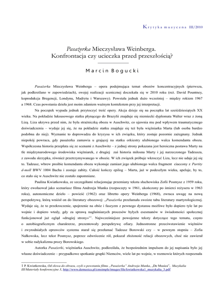 Krytyka m u z y c z n a III/2010 Pasażerka Mieczysława Weinberga. Konfrontacja czy ucieczka przed przeszłością? Marcin Bogucki Pasażerka Mieczysława Weinberga – opera podejmująca temat obozów koncentracyjnych (pierwsza, jak podkreślano w zapowiedziach), swojej realizacji scenicznej doczekała się w 2010 roku (reż. David Pountney, koprodukcja Bregencji, Londynu, Madrytu i Warszawy). Powstała jednak dużo wcześniej – między rokiem 1967 a 1968. Czas powstania dzieła jest moim zdaniem ważnym kontekstem przy jej interpretacji. Na początek wypada jednak przytoczyć treść opery. Akcja dzieje się na początku lat sześćdziesiątych XX wieku. Na pokładzie luksusowego statku płynącego do Brazylii znajduje się niemiecki dyplomata Walter wraz z żoną Lizą. Liza ukrywa przed nim, że była strażniczką obozu w Auschwitz, co ujawnia mu pod wpływem traumatycznego doświadczenia – wydaje jej się, że na pokładzie statku znajduje się też była więźniarka Marta (lub osoba bardzo podobna do niej). Wyznanie to doprowadza do kryzysu w ich związku, który zostaje pozornie zażegnany. Jednak niepokój powraca, gdy pasażerka zamawia u grającej na statku orkiestry ulubionego walca komendanta obozu. Współczesna historia przeplata się ze scenami z Auschwitz – z jednej strony pokazana jest heroiczna postawa Marty na tle międzynarodowego środowiska więźniarek, z drugiej zaś historia miłosna Marty i jej narzeczonego Tadeusza, z zawodu skrzypka, również przetrzymywanego w obozie. W ich związek próbuje wkroczyć Liza, lecz nie udaje jej się to. Tadeusz, wbrew prośbie komendanta obozu wykonuje zamiast jego ulubionego walca fragment ciaccony z Partity d-moll BWV 1004 Bacha i zostaje zabity. Całość kończy epilog – Marta, już w podeszłym wieku, apeluje, by to, co stało się w Auschwitz nie zostało zapomniane. Paulina Kwiatkowska, ze szczegółami relacjonując przemiany tekstu słuchowiska Zofii Posmysz z 1959 roku, który ewoluował jako scenariusz filmu Andrzeja Munka (rozpoczęty w 1961, ukończony po śmierci reżysera w 1963 roku), autonomiczne dzieło – powieść (1962) oraz libretto opery Weinberga (1968), zwraca uwagę na nową perspektywę, którą wniósł on do literatury obozowej: „Pasażerka przełamała swoiste tabu literatury martyrologicznej. Wydaje się, że to przekroczenie, spojrzenie na obóz i faszyzm z pewnego dystansu możliwe było dopiero tyle lat po wojnie i dopiero wtedy, gdy za sprawą nagłaśnianych procesów byłych esesmanów w świadomości społecznej funkcjonował już ogląd «drugiej strony»”1. Najwcześniejsze powojenne teksty dotyczące tego tematu, często o autobiograficznym charakterze, prezentowały perspektywę ofiary. Jednostronne przeciwstawienie więźniów i zwyrodniałych oprawców systemu starał się przełamać Tadeusz Borowski czy – w pewnym stopniu – Zofia Nałkowska, lecz tekst Posmysz, poprzez odwrócenie ról, pokazał złożoność relacji obozowych, choć nie zawierał w sobie radykalizmu prozy Borowskiego. Autorka Pasażerki, więźniarka Auschwitz, podkreślała, że bezpośrednim impulsem do jej napisania było jej własne doświadczenie – przypadkowe spotkanie grupki Niemców, wiele lat po wojnie, w rozmowie których rozpoznała 1 P. Kwiatkowska, Od słowa do obrazu, czyli o powstaniu filmu „Pasażerka” Andrzeja Munka, „De Musica”, Muzykalia III/Materiały konferencyjne 3, http://www.demusica.pl/cmsimple/images/file/kwiatkowska1_muzykalia_3.pdf Krytyka m u z y c z n a III/2010 pewien kobiecy głos, niemal identyczny z zapamiętanym głosem swojej obozowej nadzorczyni 2. Mimo że nieobca jej była problematyka nazistowskich zbrodni – interesowała się procesami byłych esesmanów i relacjonowała je – sama nie myślała o opowiedzeniu własnych doświadczeń. Dopiero perspektywa czasowa pozwoliła Posmysz na przefiltrowanie materiału autobiograficznego – wspomnień swoich i współwięźniarek. Kwiatkowska w swojej analizie nie waha się używać wartościujących kategorii, oceniając pierwszą wersję tekstu Posmysz: „Tekst słuchowiska radiowego nadanego w roku 1959 pod dłuższym tytułem Pasażerka z kabiny 45 jest niewątpliwie utworem mającym raczej publicystyczną niż artystyczną. [...] Autorka nie wygłaszała szczególnie ostrych czy radykalnych sądów, tworząc tekst przystępny i stosunkowo łatwy w odbiorze i interpretacji mimo ciężaru prezentowanej tematyki”3. W przypadku Munka przeciwnie, autorka zwraca uwagę na nowatorskie elementy jego opracowania: eliminacji słowa i skupieniu się na środkach czysto wizualnych, budowaniu dramaturgii polegającej na kontrapunktowaniu słów obrazami (np. kontrast beznamiętnego sposobu opowiadania i brutalności pokazywanej rzeczywistości) oraz na chęci połączenia „dokumentalnego”, bliskiego rzeczywistości spojrzenia (film kręcono w dawnym obozie w Oświęcimiu) z wrażeniem odrealnionej, czysto filmowej wizji. Ważnym zabiegiem konstrukcyjnym stało się zapośredniczenie obrazu – sceny obozowe u Munka mają wyraźnie charakter projekcji Lizy. Jej stany emocjonalne wpływają na charakter rzeczywistości – raz opowiadanej w sposób wyważony („oficjalna” wersja dla Waltera), innym razem sprawiającej wrażenie chaotycznej, poszarpanej (fala wspomnień zalewająca ją samą). W porównaniu z wcześniejszymi realizacjami tekstu, w filmie dramat wewnętrzny oraz problem mechanizmu pamięci stał się ważniejszy niż niż konflikt małżeński (Walter staje się raczej, w założeniach reżysera, milczącym słuchaczem), zaś okrucieństwo obozu stało się jedynie dyskretnym, nieostrym tłem dla nieoczywistych relacji Marty i Lizy. Po nakręceniu części obozowej Munk był niezadowolony z materiałów przedstawiającym warstwę współczesną – dostrzegł wtedy nieproporcjonalność części (na rzecz wymykającej się z ram scenopisu rzeczywistości Auschwitz) oraz ich nieadekwat