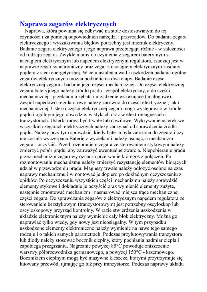 Naprawa zegarów elektrycznych Naprawa, która powinna się odbywać na stole dostosowanym do tej czynności i za pomocą odpowiednich narzędzi i przyrządów. Do badania zegara elektrycznego i wyszukiwania błędów potrzebny jest miernik elektryczny. Badanie zegara elektrycznego i jego naprawa przebiegają różnie - w zależności od rodzaju zegara. Zwykle mamy do czynienia z zegarem bateryjnym z naciągiem elektrycznym lub napędem elektrycznym regulatora, rzadziej jest w naprawie zegar synchroniczny oraz zegar z naciągiem elektrycznym zasilany prądem z sieci energetycznej. W celu ustalenia wad i uszkodzeń badania ogólne zegarów elektrycznych można podzielić na dwa etapy. Badanie części elektrycznej zegara i badanie jego części mechanicznej. Do części elektrycznej zegara bateryjnego należy źródło prądu i zespół elektryczny, a do części mechanicznej - przekładnia zębata i urządzenie wskazujące (analogowe). Zespół napędowo-regulatorowy należy zarówno do części elektrycznej, jak i mechanicznej. Usterki części elektrycznej zegara mogą występować w źródle prądu i ogólnym jego obwodzie, w stykach oraz w elektromagnesach i tranzystorach. Usterki mogą być trwałe lub chwilowe. Wykrywanie usterek we wszystkich zegarach elektrycznych należy zaczynać od sprawdzenia źródła prądu. Należy przy tym sprawdzić, kiedy bateria była założona do zegara i czy nie została wyczerpana.Baterię z wyciekami należy usunąć, a mechanizm zegara - oczyścić. Przed rozebraniem zegara ze sterowaniem stykowym należy zmierzyć pobór prądu, aby zauważyć ewentualne zwarcia. Niepobieranie prądu przez mechanizm zegarowy oznacza przerwanie któregoś z połączeń. Po rozmontowaniu mechanizmu należy zmierzyć rezystancję elementów biorących udział w przewodzeniu prądu. Magnesy trwałe należy odłożyć osobno na czas naprawy mechanizmu i wmontować je dopiero po dokładnym oczyszczeniu z opiłków. Po oczyszczeniu wszystkich części mechanizmu należy sprawdzić elementy stykowe i dokładnie je oczyścić oraz wymienić elementy zużyte, następnie zmontować mechanizm i nasmarować miejsca trące mechanicznej części zegara. Do sprawdzania zegarów z elektrycznym napędem regulatora ze sterowaniem bezstykowym (tranzystorowym) jest potrzebny oscyloskop lub oscyloskopowy przyrząd kontrolny. W razie stwierdzenia uszkodzenia w układzie elektronicznym należy wymienić cały blok elektryczny. Można go naprawiać tylko wtedy, gdy nowy jest nieosiągalny. W tym przypadku uszkodzone elementy elektroniczne należy wymienić na nawe tego samego rodzaju i o takich samych parametrach. Podczas przylutowywania tranzystora lub diody należy stosować bocznik cieplny, który pochłania nadmiar ciepła i zapobiega przegrzaniu. Nagrzanie powyżej 85°C powoduje zniszczenie warstwy półprzewodnika germanowego, a powyżej 150°C - krzemowego. Bocznikiem cieplnym mogą być masywne kleszcze, którymi przytrzymuje się lutowany przewód, ujmując go tuż przy tranzystorze. Podczas naprawy układu elektronicznego należy posługiwać się schematem połączeń lub schematem przebiegów prądowych. Z cewkami należy obchodzić się bardzo ostrożnie, aby nie uszkodzić ich cienkich przewodów lub ich izolacji. Po złożeniu mechanizmu należy włączyć napięcie zasilające zegar i sprawdzić jego działanie na sprawdzarce chodu zegara z podłączonym oscyloskopem i mikroamperomierzem. Przebieg impulsów powinien odpowiadać podanemu przez producenta. Przed naprawą każdego zegara elektrycznego należy przestudiować wskazówki producenta. źródło: Bartnik i Podwapiński "Ilustrowany słownik zegarmistrzowski"