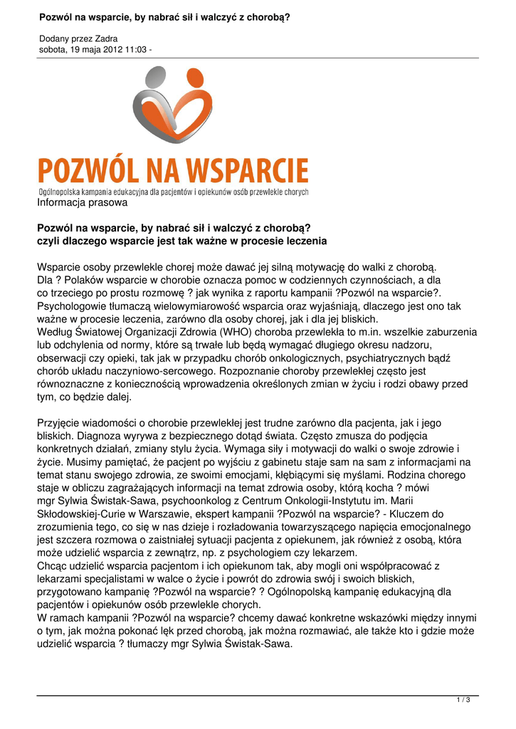 Pozwól na wsparcie, by nabrać sił i walczyć z chorobą? Dodany przez Zadra sobota, 19 maja 2012 11:03 - Informacja prasowa Pozwól na wsparcie, by nabrać sił i walczyć z chorobą? czyli dlaczego wsparcie jest tak ważne w procesie leczenia Wsparcie osoby przewlekle chorej może dawać jej silną motywację do walki z chorobą. Dla ? Polaków wsparcie w chorobie oznacza pomoc w codziennych czynnościach, a dla co trzeciego po prostu rozmowę ? jak wynika z raportu kampanii ?Pozwól na wsparcie?. Psychologowie tłumaczą wielowymiarowość wsparcia oraz wyjaśniają, dlaczego jest ono tak ważne w procesie leczenia, zarówno dla osoby chorej, jak i dla jej bliskich. Według Światowej Organizacji Zdrowia (WHO) choroba przewlekła to m.in. wszelkie zaburzenia lub odchylenia od normy, które są trwałe lub będą wymagać długiego okresu nadzoru, obserwacji czy opieki, tak jak w przypadku chorób onkologicznych, psychiatrycznych bądź chorób układu naczyniowo-sercowego. Rozpoznanie choroby przewlekłej często jest równoznaczne z koniecznością wprowadzenia określonych zmian w życiu i rodzi obawy przed tym, co będzie dalej. Przyjęcie wiadomości o chorobie przewlekłej jest trudne zarówno dla pacjenta, jak i jego bliskich. Diagnoza wyrywa z bezpiecznego dotąd świata. Często zmusza do podjęcia konkretnych działań, zmiany stylu życia. Wymaga siły i motywacji do walki o swoje zdrowie i życie. Musimy pamiętać, że pacjent po wyjściu z gabinetu staje sam na sam z informacjami na temat stanu swojego zdrowia, ze swoimi emocjami, kłębiącymi się myślami. Rodzina chorego staje w obliczu zagrażających informacji na temat zdrowia osoby, którą kocha ? mówi mgr Sylwia Świstak-Sawa, psychoonkolog z Centrum Onkologii-Instytutu im. Marii Skłodowskiej-Curie w Warszawie, ekspert kampanii ?Pozwól na wsparcie? - Kluczem do zrozumienia tego, co się w nas dzieje i rozładowania towarzyszącego napięcia emocjonalnego jest szczera rozmowa o zaistniałej sytuacji pacjenta z opiekunem, jak również z osobą, która może udzielić wsparcia z zewnątrz, np. z psychologiem czy lekarzem. Chcąc udzielić wsparcia pacjentom i ich opiekunom tak, aby mogli oni współpracować z lekarzami specjalistami w walce o życie i powrót do zdrowia swój i swoich bliskich, przygotowano kampanię ?Pozwól na wsparcie? ? Ogólnopolską kampanię edukacyjną dla pacjentów i opiekunów osób przewlekle chorych. W ramach kampanii ?Pozwól na wsparcie? chcemy dawać konkretne wskazówki między innymi o tym, jak można pokonać lęk przed chorobą, jak można rozmawiać, ale także kto i gdzie może udzielić wsparcia ? tłumaczy mgr Sylwia Świstak-Sawa. 1/3 Pozwól na wsparcie, by nabrać sił i walczyć z chorobą? Dodany przez Zadra sobota, 19 maja 2012 11:03 - Dlaczego warto rozmawiać o chorobie? Emocją, która zazwyczaj pojawia się jako pierwsza na wiadomość o chorobie jest lęk. Nie jest on niczym złym, niemniej istotne jest, żeby nie towarzyszył nam zbyt długi czas. Dlatego ważne jest, aby nie być z tą obciążającą informacją samemu. Warto zastanowić się, z kim chcielibyśmy podzielić się tym, co dla nas trudne. Rozmowa z rodziną i z osobami z najbliższego otoczenia pozwoli na rozładowanie nagromadzonego napięcia. Często głośne wypowiedzenie tego, co usłyszało się od lekarza, usłyszenie własnego zdania na ten temat pomaga w rozładowaniu negatywnych emocji. Co może dać nam rozmowa o chorobie? - Uspokojenie. Wypowiadanie na głos myśli, uczuć i obaw uwalania i oczyszcza umysł, dopuszcza pojawienie się korzystnych scenariuszy przebiegu choroby. - Zmniejszenie poziomu lęku. Choroba traktowana jako tajemnica wydaje się jeszcze bardziej groźna. - Wzajemne zrozumienie. Szczera rozmowa z bliskimi pozwala trafniej formułować oczekiwania wobec nich, a tym samym prowadzi do lepszego zrozumienia wzajemnych potrzeb. - Budowanie źródła wsparcia. Im więcej osób wie o chorobie, tym większe źródło wsparcia można zbudować. Pacjent zyskuje więcej osób do pomocy. Bliscy chorego poprzez poszerzanie własnego systemu wsparcia i umiejętność dzielenia się opieką nad chorym, dbają o swoją kondycję psychofizyczną, a tym samym o to, aby jak najdłużej w bezpieczny sposób móc pomagać choremu. - Poszerzanie wiedzy o chorym. Szczera i jasna komunikacja na temat choroby, jej przebiegu, leczenia i konsekwencji umożliwia bliskim i znajomym chorego stworzyć odpowiedni system wsparcia. Bliscy chorego widzą i czują gdy coś jest nie w porządku. Dopóki nie dowiedzą się, co się stało, będą się martwić i mogą zacząć budować zagrażające scenariusze. - Właściwe zrozumienie wsparcia ze strony innych osób. Rozmowa pozwala uświadomić sobie, że wsparcie innych osób to nie poświęcenie, ale ich własna wola i chęć towarzyszenia choremu w trudnych chwilach. Wtedy łatwiej jest też korzystać z ich pomocy. Wsparcie ? kiedy jest potrzebne? Warto pamiętać, że wsparcie jest istotne nie tylko w procesie leczenia, ale także w modyfikowaniu czynników ryzyka chorób np. chorób układu krążenia. Ważne jest uświadomienie pacjentowi i jego bliskim, że np. nadciśnienie tętnicze, zaburzenia poziomu lipidów we krwi, palenie papierosów, nadwaga i otyłość czy mała aktywność fizyczna mogą prowadzić do poważnych powikłań. Należy podkreślić, że bardzo ważnym elementem procesu leczenia jest zmiana stylu życia ? podkreśla mgr Monika Stepnowska, psycholog pracujący z chorymi kardiologicznymi, ekspert kampanii ?Pozwól na wsparcie? - Zmiany, często radykalne, w codziennym funkcjonowaniu mogą być trudne dla pacjenta i jego rodziny. Dlatego tak bardzo potrzebna jest rozmowa z lekarzem, z rodziną, z psychologiem. To właśnie rozmowa pozwala zmniejszyć pojawiający się lęk, a także pomaga określić potrzeby osoby chorej. Więcej informacji na temat wsparcia dla pacjentów i opiekunów osób przewlekle chorych moż