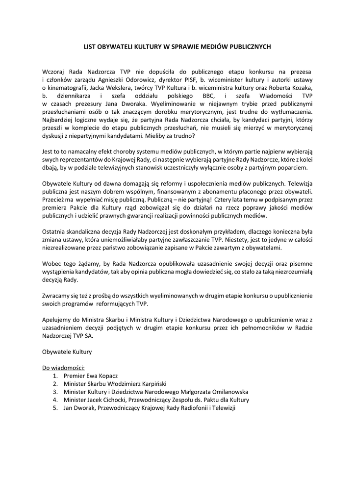 LIST OBYWATELI KULTURY W SPRAWIE MEDIÓW PUBLICZNYCH Wczoraj Rada Nadzorcza TVP nie dopuściła do publicznego etapu konkursu na prezesa i członków zarządu Agnieszki Odorowicz, dyrektor PISF, b. wiceminister kultury i autorki ustawy o kinematografii, Jacka Wekslera, twórcy TVP Kultura i b. wiceministra kultury oraz Roberta Kozaka, b. dziennikarza i szefa oddziału polskiego BBC, i szefa Wiadomości TVP w czasach prezesury Jana Dworaka. Wyeliminowanie w niejawnym trybie przed publicznymi przesłuchaniami osób o tak znaczącym dorobku merytorycznym, jest trudne do wytłumaczenia. Najbardziej logiczne wydaje się, że partyjna Rada Nadzorcza chciała, by kandydaci partyjni, którzy przeszli w komplecie do etapu publicznych przesłuchań, nie musieli się mierzyć w merytorycznej dyskusji z niepartyjnymi kandydatami. Mieliby za trudno? Jest to to namacalny efekt choroby systemu mediów publicznych, w którym partie najpierw wybierają swych reprezentantów do Krajowej Rady, ci następnie wybierają partyjne Rady Nadzorcze, które z kolei dbają, by w podziale telewizyjnych stanowisk uczestniczyły wyłącznie osoby z partyjnym poparciem. Obywatele Kultury od dawna domagają się reformy i uspołecznienia mediów publicznych. Telewizja publiczna jest naszym dobrem wspólnym, finansowanym z abonamentu płaconego przez obywateli. Przecież ma wypełniać misję publiczną. Publiczną – nie partyjną! Cztery lata temu w podpisanym przez premiera Pakcie dla Kultury rząd zobowiązał się do działań na rzecz poprawy jakości mediów publicznych i udzielić prawnych gwarancji realizacji powinności publicznych mediów. Ostatnia skandaliczna decyzja Rady Nadzorczej jest doskonałym przykładem, dlaczego konieczna była zmiana ustawy, która uniemożliwiałaby partyjne zawłaszczanie TVP. Niestety, jest to jedyne w całości niezrealizowane przez państwo zobowiązanie zapisane w Pakcie zawartym z obywatelami. Wobec tego żądamy, by Rada Nadzorcza opublikowała uzasadnienie swojej decyzji oraz pisemne wystąpienia kandydatów, tak aby opinia publiczna mogła dowiedzieć się, co stało za taką niezrozumiałą decyzją Rady. Zwracamy się też z prośbą do wszystkich wyeliminowanych w drugim etapie konkursu o upublicznienie swoich programów reformujących TVP. Apelujemy do Ministra Skarbu i Ministra Kultury i Dziedzictwa Narodowego o upublicznienie wraz z uzasadnieniem decyzji podjętych w drugim etapie konkursu przez ich pełnomocników w Radzie Nadzorczej TVP SA. Obywatele Kultury Do wiadomości: 1. Premier Ewa Kopacz 2. Minister Skarbu Włodzimierz Karpiński 3. Minister Kultury i Dziedzictwa Narodowego Małgorzata Omilanowska 4. Minister Jacek Cichocki, Przewodniczący Zespołu ds. Paktu dla Kultury 5. Jan Dworak, Przewodniczący Krajowej Rady Radiofonii i Telewizji Obywatele Kultury: 1. Agnieszka Holland, reżyserka, sygnatariuszka Paktu dla Kultury, Gildia Reżyserów Polskich 2. Beata Chmiel, menedżerka kultury, współprzewodnicząca Zespołu ds. Paktu dla Kultury przy KPRM, sygnatariuszka Paktu dla Kultury 3. Hanna Wróblewska, kuratorka, współprzewodnicząca Komitetu ds. Paktu dla Kultury przy MKiDN, sygnatariuszka Paktu dla Kultury 4. Joanna Mytkowska, kuratorka, Muzeum Sztuki Nowoczesnej Warszawa, sygnatariuszka Paktu dla Kultury 5. Magdalena Sroka, wiceprezydent Krakowa ds. kultury i promocji, sygnatariuszka Paktu dla Kultury 6. Beata Stasińska, wydawca, sygnatariuszka Paktu dla Kultury 7. Edwin Bendyk, dziennikarz, sygnatariusz Paktu dla Kultury 8. Jacek Bromski, reżyser, prezes Stowarzyszenia Filmowców Polskich, sygnatariusz Paktu dla Kultury 9. Krzysztof Knittel, kompozytor, Polska Rada Muzyki, sygnatariusz Paktu dla Kultury 10. Paweł Łysak, reżyser teatralny, sygnatariusz Paktu dla Kultury 11. Tomasz Makowski, bibliotekarz, dyrektor Biblioteki Narodowej, sygnatariusz Paktu dla Kultury 12. Maciej Nowak, krytyk teatralny, sygnatariusz Paktu dla Kultury 13. Paweł Potoroczyn, menedżer kultury, dyrektor IAM, sygnatariusz Paktu dla Kultury 14. Maciej Strzembosz, producent filmowy, sygnatariusz Paktu dla Kultury 15. Krzysztof Sadowski, kompozytor i muzyk, prezes PSJ, sygnatariusz Paktu dla Kultury 16. Jarosław Suchan, kurator. Muzeum Sztuki, Łódź, sygnatariusz Paktu dla Kultury 17. Agata Szczęśniak, socjolożka, sygnatariuszka Paktu dla Kultury 18. Jarosław Lipszyc, Nowoczesna Polska, sygnatariusz Paktu dla Kultury 19. Iwo Zaniewski, malarz i reżyser, sygnatariusz Paktu dla Kultury 20. Jacek Żakowski, dziennikarz, sygnatariusz Paktu dla Kultury 21. Tadeusz Kowalski, profesor UW, dyrektor Filmoteki Narodowej, członek Rady Nadzorczej TVP SA 22. Andrzej Wajda, reżyser filmowy 23. Krystyna Zachwatowicz, aktorka 24. Małgorzata Szumowska, reżyserka i scenarzystka, Gildia Reżyserów Polskich 25. Paweł Pawlikowski, reżyser, Gildia Reżyserów Polskich 26. Jerzy Skolimowski, reżyser, scenarzysta, producent filmowy 27. Marcel Łoziński, reżyser filmów dokumentalnych 28. Łukasz Palkowski, reżyser filmowy 29. Bartek Konopka, reżyser filmowy, Gildia Reżyserów Polskich 30. Wojciech Szczurek, prezydent Gdyni 31. Stanisław Pieniak, reżyser, nauczyciel akademicki, członek Rady Etyki Mediów 32. Jan Ołdakowski, muzealnik, dyrektor Muzeum Powstania Warszawskiego 33. Barbara Fatyga, socjolog, profesor Uniwersytetu Warszawskiego 34. Grażyna Torbicka, dziennikarka 35. Michał Broniatowski, redaktor naczelny miesięcznika “Forbes” 36. Tadeusz Lubelski, historyk filmu, profesor Uniwersytetu Jagiellońskiego 37. Wojciech Marczewski, reżyser filmowy 38. Ewa Ewart, dziennikarka, reżyserka filmów dokumentalnych 39. Waldemar Dąbrowski, dyrektor Teatru Wielkiego – Opery Narodowej 40. Janusz Majewski, reżyser, rektor Warszawskiej Szkoły Filmowej 41. Marcin Koszałka, operator i reżyser filmowy 42. Maciej Englert, reżyser teatralny 43. Andrzej Bart, pisarz i scenarzysta 44. Mariusz Wilczyński, reżyser filmów animowanych 45. Arthur Reinhart, operator 46