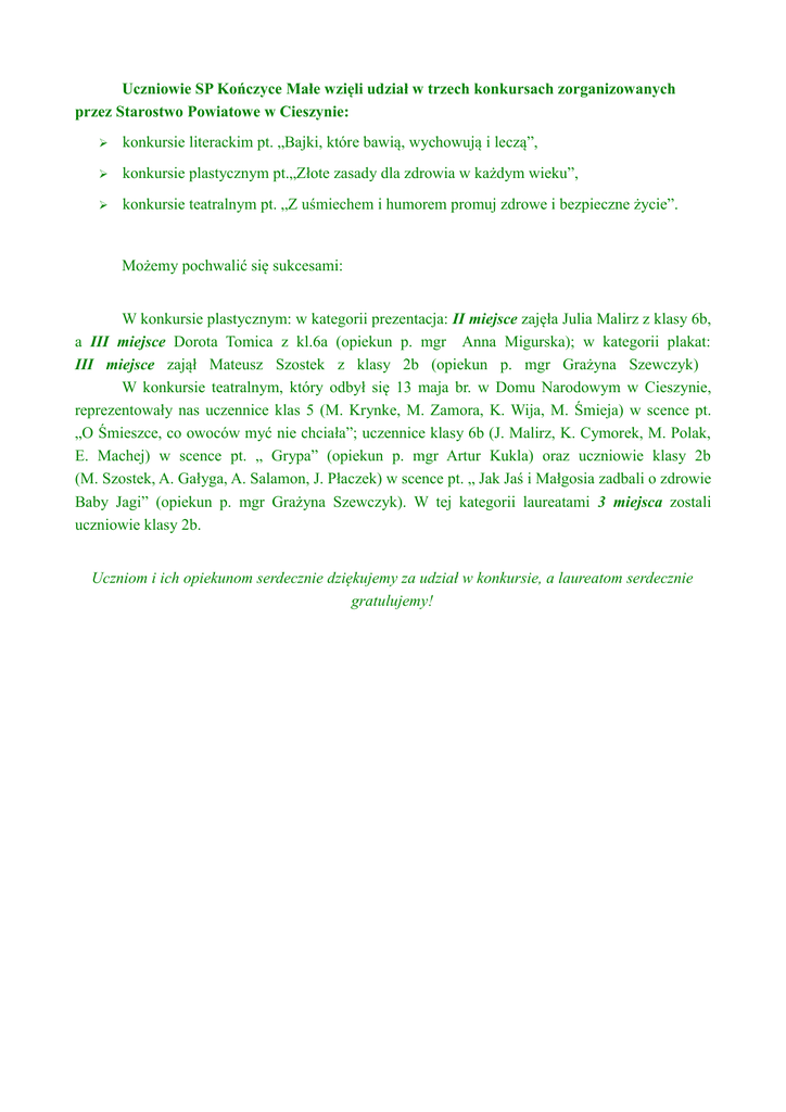 Uczniowie SP Kończyce Małe wzięli udział w trzech konkursach zorganizowanych przez Starostwo Powiatowe w Cieszynie: ➢ konkursie literackim pt. „Bajki, które bawią, wychowują i leczą”, ➢ konkursie plastycznym pt.„Złote zasady dla zdrowia w każdym wieku”, ➢ konkursie teatralnym pt. „Z uśmiechem i humorem promuj zdrowe i bezpieczne życie”. Możemy pochwalić się sukcesami: W konkursie plastycznym: w kategorii prezentacja: II miejsce zajęła Julia Malirz z klasy 6b, a III miejsce Dorota Tomica z kl.6a (opiekun p. mgr Anna Migurska); w kategorii plakat: III miejsce zajął Mateusz Szostek z klasy 2b (opiekun p. mgr Grażyna Szewczyk) W konkursie teatralnym, który odbył się 13 maja br. w Domu Narodowym w Cieszynie, reprezentowały nas uczennice klas 5 (M. Krynke, M. Zamora, K. Wija, M. Śmieja) w scence pt. „O Śmieszce, co owoców myć nie chciała”; uczennice klasy 6b (J. Malirz, K. Cymorek, M. Polak, E. Machej) w scence pt. „ Grypa” (opiekun p. mgr Artur Kukla) oraz uczniowie klasy 2b (M. Szostek, A. Gałyga, A. Salamon, J. Płaczek) w scence pt. „ Jak Jaś i Małgosia zadbali o zdrowie Baby Jagi” (opiekun p. mgr Grażyna Szewczyk). W tej kategorii laureatami 3 miejsca zostali uczniowie klasy 2b. Uczniom i ich opiekunom serdecznie dziękujemy za udział w konkursie, a laureatom serdecznie gratulujemy!
