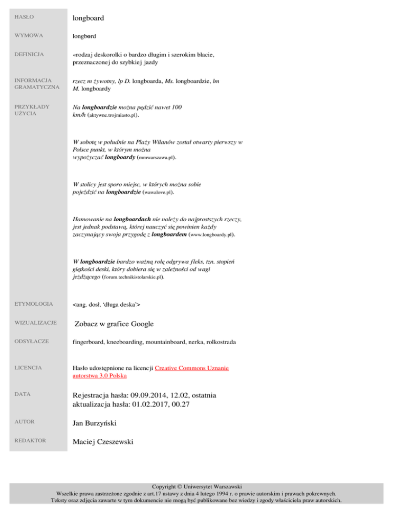 HASŁO longboard WYMOWA longbord DEFINICJA «rodzaj deskorolki o bardzo długim i szerokim blacie, przeznaczonej do szybkiej jazdy» INFORMACJA GRAMATYCZNA rzecz m żywotny, lp D. longboarda, Ms. longboardzie, lm M. longboardy PRZYKŁADY UŻYCIA Na longboardzie można pędzić nawet 100 km/h (aktywne.trojmiasto.pl). W sobotę w południe na Plaży Wilanów został otwarty pierwszy w Polsce punkt, w którym można wypożyczać longboardy (mmwarszawa.pl). W stolicy jest sporo miejsc, w których można sobie pojeździć na longboardzie (wawalove.pl). Hamowanie na longboardach nie należy do najprostszych rzeczy, jest jednak podstawą, której nauczyć się powinien każdy zaczynający swoja przygodę z longboardem (www.longboardy.pl). W longboardzie bardzo ważną rolę odgrywa fleks, tzn. stopień giętkości deski, który dobiera się w zależności od wagi jeżdżącego (forum.technikistolarskie.pl). ETYMOLOGIA WIZUALIZACJE <ang. dosł. ‘długa deska’> Zobacz w grafice Google ODSYŁACZE fingerboard, kneeboarding, mountainboard, nerka, rolkostrada LICENCJA Hasło udostępnione na licencji Creative Commons Uznanie autorstwa 3.0 Polska DATA Rejestracja hasła: 09.09.2014, 12.02, ostatnia aktualizacja hasła: 01.02.2017, 00.27 AUTOR Jan Burzyński REDAKTOR Maciej Czeszewski Copyright © Uniwersytet Warszawski Wszelkie prawa zastrzeżone zgodnie z art.17 ustawy z dnia 4 lutego 1994 r. o prawie autorskim i prawach pokrewnych. Teksty oraz zdjęcia zawarte w tym dokumencie nie mogą być publikowane bez wiedzy i zgody właściciela praw autorskich. Powered by TCPDF (www.tcpdf.org)