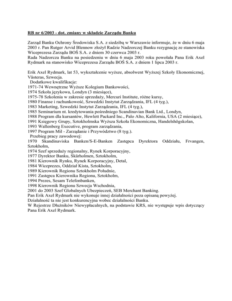 RB nr 6/2003 - dot. zmiany w składzie Zarządu Banku Zarząd Banku Ochrony Środowiska S.A. z siedzibą w Warszawie informuje, że w dniu 6 maja 2003 r. Pan Rutger Arvid Blennow złożył Radzie Nadzorczej Banku rezygnację ze stanowiska Wiceprezesa Zarządu BOŚ S.A. z dniem 30 czerwca 2003 r. Rada Nadzorcza Banku na posiedzeniu w dniu 6 maja 2003 roku powołała Pana Erik Axel Rydmark na stanowisko Wiceprezesa Zarządu BOŚ S.A. z dniem 1 lipca 2003 r. Erik Axel Rydmark, lat 53, wykształcenie wyższe, absolwent Wyższej Szkoły Ekonomicznej, Västeras, Szwecja. Dodatkowe kwalifikacje: 1971-74 Wewnętrzne Wyższe Kolegium Bankowości, 1974 Szkoła językowa, Londyn (3 miesiące), 1975-78 Szkolenia w zakresie sprzedaży, Mercuri Institute, różne kursy, 1980 Finanse i rachunkowość, Szwedzki Instytut Zarządzania, IFL (4 tyg.), 1983 Marketing, Szwedzki Instytut Zarządzania, IFL (4 tyg.), 1985 Seminarium nt. kredytowania pośredniego Scandinavian Bank Ltd., Londyn, 1988 Program dla kursantów, Hewlett Packard Inc., Palo Alto, Kalifornia, USA (2 miesiące), 1991 Księgowy Grupy, Sztokholmska Wyższa Szkoła Ekonomiczna, Handelshögskolan, 1993 Wallenberg Executive, program zarządzania, 1997 Program Mil - Zarządanie i Przywództwo (8 tyg.). Przebieg pracy zawodowej: 1970 Skandinaviska Banken/S-E-Banken Zastępca Dyrektora Oddziału, Frvangen, Sztokholm, 1974 Szef sprzedaży regionalny, Rynek Korporacyjny, 1977 Dyrektor Banku, Skärholmen, Sztokholm, 1981 Kierownik Rynku, Rynek Korporacyjny, Detal, 1984 Wiceprezes, Oddział Kista, Sztokholm, 1989 Kierownik Regionu Sztokholm Południe, 1991 Zastępca Kierownika Regionu, Sztokholm, 1994 Prezes, Sesam Telefonbanken, 1998 Kierownik Regionu Szwecja Wschodnia, 2001 do 2003 Szef Globalnych Ubezpieczeń, SEB Merchant Banking. Pan Erik Axel Rydmark nie wykonuje innej działalności poza opisaną powyżej. Działalność ta nie jest konkurencyjna wobec działalności Banku. W Rejestrze Dłużników Niewypłacalnych, na podstawie KRS, nie występuje wpis dotyczący Pana Erik Axel Rydmark.