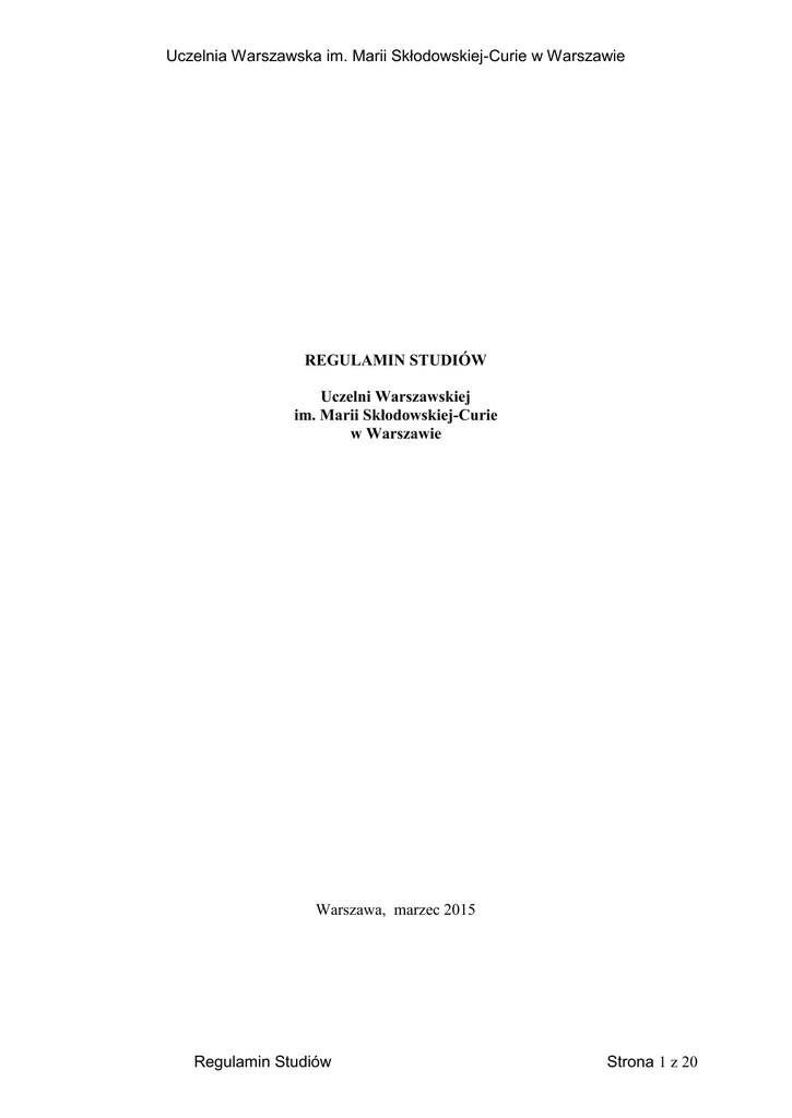 Uczelnia Warszawska im. Marii Skłodowskiej-Curie w Warszawie REGULAMIN STUDIÓW Uczelni Warszawskiej im. Marii Skłodowskiej-Curie w Warszawie Warszawa, marzec 2015 Regulamin Studiów Strona 1 z 20 Uczelnia Warszawska im. Marii Skłodowskiej-Curie w Warszawie 1. Postanowienia ogólne str. 3 2. Przyjęcie na studia str. 5 3. Prawa i obowiązki studenta str. 6 4. Organizacja studiów, plany studiów i programy nauczania str. 7 5. System punktów zaliczeniowych str. 11 6. Zajęcia, zaliczenia, egzaminy str. 12 7. Urlopy str. 15 8. Praca dyplomowa i egzamin dyplomowy str. 16 9. Zakończenie studiów str. 18 10. Skreślenie z listy studentów str. 18 11. Osoby niepełnosprawne str. 19 12. Przepisy końcowe str. 19 Regulamin Studiów Strona 2 z 20 Uczelnia Warszawska im. Marii Skłodowskiej-Curie w Warszawie 1. POSTANOWIENIA OGÓLNE §1 1. Uczelnia Warszawska im. Marii Skłodowskiej-Curie w Warszawie jest niepubliczną szkołą wyższą. 2. Regulamin studiów Uczelni Warszawskiej im. Marii Skłodowskiej-Curie w Warszawie, zwanej dalej „Uczelnią” określa organizację i tok studiów oraz związane z nim prawa i obowiązki studenta Uczelni. 3. Regulamin studiów stosuje się do wszystkich kierunków studiów, profili kształcenia, poziomów i form studiów wyższych prowadzonych przez Uczelnię. §2 Użyte w Regulaminie studiów określenia oznaczają: 1) nauczyciel akademicki - osoba posiadająca odpowiednie kwalifikacje, uczestnicząca w procesie dydaktycznym, bez względu na charakter stosunku prawnego łączącego ją z Uczelnią, 2) prowadzący zajęcia - nauczyciel akademicki prowadzący zajęcia z przedmiotu przewidzianego w planie studiów, 3) promotor - opiekun naukowy będący nauczycielem akademickim, pod kierunkiem którego student przygotowuje pracę dyplomową, 4) Rektor - Rektor Uczelni Warszawskiej im. Marii Skłodowskiej-Curie w Warszawie, 5) Senat - Senat Uczelni Warszawskiej im. Marii Skłodowskiej-Curie w Warszawie, 6) Uczelnia - Uczelnia Warszawska im. Marii Skłodowskiej-Curie w Warszawie, 7) Regulamin - Regulamin studiów Uczelni Warszawskiej im. Marii Skłodowskiej-Curie w Warszawie, 8) plan studiów - dokument określający kierunek studiów, profil kształcenia, poziom i formę studiów, przedmioty, ich sekwencję i wymiar czasowy, formę zaliczania oraz przypisaną im liczbą punktów ECTS, których zaliczenie warunkuje uzyskanie kwalifikacji danego stopnia; plan studiów określa łączny czas trwania studiów i wyodrębnia etapy studiów; plan studiów wymienia także inne wymagania, które muszą być spełnione, by uzyskać kwalifikacje danego stopnia, 9) praca dyplomowa - praca licencjacka, praca magisterska, projekt inżynierski, 10) program kształcenia - opis określonych przez Uczelnię spójnych efektów kształcenia, zgodny z Krajowymi Ramami Kwalifikacji dla Szkolnictwa Wyższego, w tym zasób wiedzy, umiejętności i kompetencji, a także szczegółowe cele kształcenia w zakresie każdego przedmiotu oraz opis procesu kształcenia, prowadzącego do osiągnięcia tych efektów, wraz z przypisanymi do poszczególnych modułów tego procesu punktami ECTS, 11) efekty kształcenia - zasób wiedzy, umiejętności i kompetencji społecznych uzyskiwanych w procesie kształcenia w systemie studiów, 12) profil kształcenia – profil praktyczny lub profil ogólnoakademicki, 13) profil praktyczny - profil programu kształcenia obejmującego moduły zajęć służące zdobywaniu przez studenta umiejętności praktycznych i kompetencji społecznych, realizowany przy założeniu, że ponad połowa programu studiów określonego w punktach ECTS obejmuje zajęcia praktyczne kształtujące te umiejętności i kompetencje, w tym umiejętności uzyskiwane na zajęciach warsztatowych, które są prowadzone przez osoby posiadające doświadczenie zawodowe zdobyte poza Uczelnią, 14) profil ogólnoakademicki - profil programu kształcenia obejmującego moduły zajęć powiązane z prowadzonymi w uczelni badaniami naukowymi, realizowany przy założeniu, że ponad połowa programu studiów określonego w punktach ECTS obejmuje zajęcia służące zdobywaniu przez studenta pogłębionej wiedzy, Regulamin Studiów Strona 3 z 20 Uczelnia Warszawska im. Marii Skłodowskiej-Curie w Warszawie 15) punkty ECTS - punkty zdefiniowane w europejskim systemie akumulacji i transferu punktów zaliczeniowych jako miara średniego nakładu pracy osoby uczącej się, niezbędnego do uzyskania zakładanych efektów kształcenia, 16) moduł kształcenia – przedmiot lub grupa przedmiotów jak również praktyki zawodowe i przygotowanie pracy dyplomowej mające przyporządkowaną liczbę punktów ECTS, 17) przedmiot – zespół zajęć oznaczonych wspólną nazwą, przewidzianych w tym samym roku studiów i podlegających łącznej ocenie z przyporządkowana liczbą punktów ECTS, 18) poziom studiów – studia pierwszego lub drugiego stopnia oraz jednolite studia magisterskie, 19) studia pierwszego stopnia - forma kształcenia, na którą są przyjmowani kandydaci posiadający świadectwo dojrzałości, kończącą się uzyskaniem kwalifikacji pierwszego stopnia, 20) studia drugiego stopnia - forma kształcenia, na którą są przyjmowani kandydaci posiadający co najmniej kwalifikacje pierwszego stopnia, kończącą się uzyskaniem kwalifikacji drugiego stopnia, 21) jednolite studia magisterskie - formę kształcenia, na którą są przyjmowani kandydaci posiadający świadectwo dojrzałości, kończącą się uzyskaniem kwalifikacji drugiego stopnia, 22) kwalifikacje - efekty kształcenia, poświadczone dyplomem wydanym przez uczelnię potwierdzającym uzyskanie zakładanych efektów kształcenia, 23) kwalifikacje pierwszego stopnia - efekt kształcenia na studiach pierwszego stopnia, zakończonych uzyskaniem tytułu zawodowego licencjata, inżyniera lub równorzędnego określonego kierunku studiów i profilu kształcenia, potwierdzony odpowiednim dyplomem, 24) kwalifikacje drugiego sto