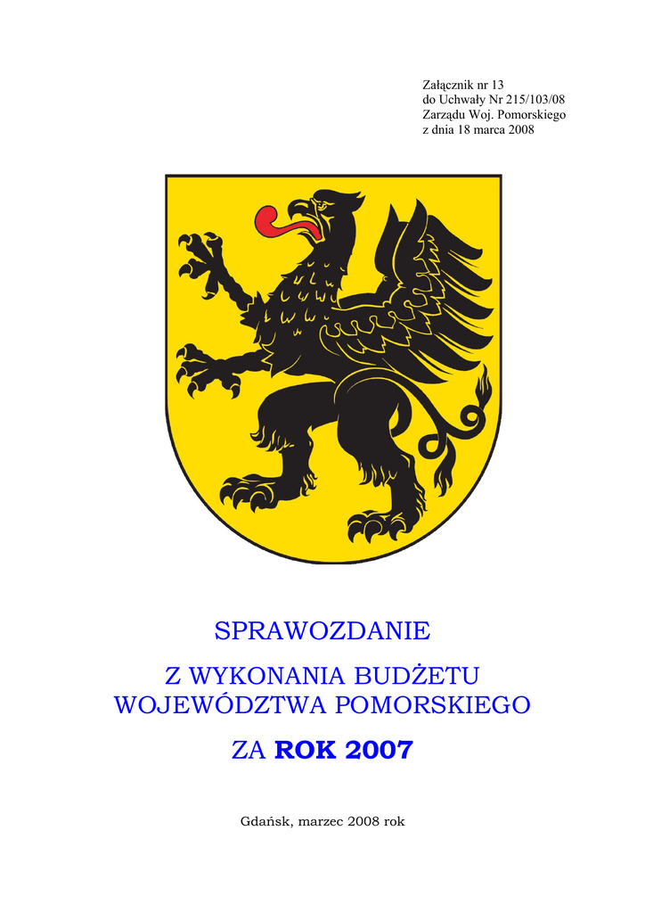 Załącznik nr 13 do Uchwały Nr 215/103/08 Zarządu Woj. Pomorskiego z dnia 18 marca 2008 SPRAWOZDANIE Z WYKONANIA BUDŻETU WOJEWÓDZTWA POMORSKIEGO ZA ROK 2007 Gdańsk, marzec 2008 rok WYKONANIE I STRUKTURA BUDŻETU WOJEWÓDZTWA POMORSKIEGO W 2007 ROKU DOCHODY WYDATKI Podatek dochodowy od osób prawnych Rolnictwo i łowiectwo 63 559 732 zł – 10,6 % 270 865 100 zł – 43,0 % Przetwórstwo przemysłowe Podatek dochodowy od osób fizycznych 21 522 601 zł – 3,6 % 51 129 738 zł – 8,1% Transport i łączność 225 328 400 zł – 37,7 % Dochody z majątku województwa 27 572 851 zł – 4,4 % Administracja publiczna Pozostałe dochody własne Oświata i wychowanie 44 304 298 zł – 7,4 % 9 142 905 zł – 1,4 % 27 375 610 zł – 4,6 % Subwencje Ochrona zdrowia 109 182 360 zł – 17,3 % 79 882 076 zł – 13,4 % Dotacje celowe i rozwojowe z budżetu państwa Pozostałe zadania w zakresie polityki społecznej 87 969 171 zł – 13,9 % 28 889 703 zł – 4,8 % Pozostałe dotacje 18 875 438 zł – 3,0 % Edukacyjna opieka wychowawcza Pozostałe dochody ze źródeł zagranicznych i z UE Kultura i ochrona dziedzictwa narodowego 18 525 941 zł – 3,4 % 65 680 439 zł – 11,0 % 56 068 853 zł – 8,9 % Pozostałe wydatki 22 706 734 zł – 3,8 % RAZEM: 630 806 416 zł RAZEM: 597 775 534 zł PRZYCHODY ROZCHODY 97 433 266 zł 58 196 716 zł 2 SPIS WYKRESÓW 1. Wykonanie dochodów i wydatków budżetu Województwa w 2007 roku .....................4 2. Plan i wykonanie dochodów wg źródeł w 2007 roku (w tys. zł).................................... 5 3. Struktura dotacji celowych i rozwojowych otrzymanych w 2007 roku..........................6 4. Udział dochodów uzyskanych ze źródeł zagranicznych w dochodach wykonanych ogółem w 2007 roku...................................................................................................... 7 5. Realizacja dochodów w 2007 roku w porównaniu z rokiem 2006 (w tys. zł)................ 8 6. Struktura wykonania dochodów Województwa Pomorskiego w latach 2006 – 2007... 9 7. Planowane i wykonane wydatki w 2007 roku w układzie działowym (w tys. zł)........ 10 8. Struktura wydatków Województwa w 2007 roku w podziale na wydatki bieżące i majątkowe .................................................................................................................. 11 9. Struktura wydatków bieżących w 2007 roku................................................................ 12 10. Struktura wydatków majątkowych w 2007 roku.......................................................... 13 11. Wykonanie dotacji z budżetu Województwa w 2007 roku...........................................14 12. Realizacja wydatków Województwa w 2007 roku w porównaniu z rokiem 2006 (w tys. zł).......................................................................................................................15 3 Wykonanie dochodów i wydatków budżetu Województwa w 2007 roku dochody 99,1 % wydatki 90,4 % 0 100 000 200 000 300 000 400 000 500 000 600 000 dochody wydatki plan 636 742 tys.zł 661 003 tys.zł wykonanie 630 806 tys.zł 597 776 tys.zł 4 700 000 Plan i wykonanie dochodów wg źródeł w 2007 roku (w tys. zł) 235 592 250 000 270 865 300 000 plan 200 000 106 845 138 030 56 069 67 248 9 143 8 993 27 573 50 000 30 697 47 000 51 130 100 000 109 182 109 182 150 000 wykonanie 0 podatek od os ób podatek od os ób prawnych fizycznych dochody z m ajątku województwa s ubwencje dotacje celowe i ś rodki z fundus zy pozos tałe rozwojowe UE dochody włas ne 5 Struktura dotacji celowych i rozwojowych otrzymanych w 2007 roku Dotacje celowe na podstawie porozumień z organami administracji rządowej 3,2 % Dotacje z funduszy celowych 2,6 % Dotacje i pomoc finansowa z budżetów innych j.s.t. 15,1 % Dotacje celowe z budżetu państwa na zadania własne 22,8 % Dotacje rozwojowe z budżetu państwa 1,3 % Dotacje celowe z budżetu państwa z zakresu administracji rządowej 55,0 % 6 Udział dochodów uzyskanych ze źródeł zagranicznych w dochodach wykonanych ogółem w 2007 roku Dochody krajowe 91,1 % Dochody ze źródeł zagranicznych 8,9 % 7 Realizacja dochodów w 2007 roku w porównaniu z rokiem 2006 (w tys. zł) 636 742 650 000 600 000 537 317 548 145 550 000 500 000 450 000 2006 rok 2007 rok Plan Wykonanie 8 630 806 Struktura wykonania dochodów Województwa Pomorskiego w latach 2006 – 2007 2006 rok 2007 rok 11,6% 8,9% 16,9% 16,6% 52,2% 17,3% 19,6% Dochody własne Subwencja Dotacje celowe i rozwojowe Dochody ze źródeł zagranicznych i z UE 9 56,9% Planowane i wykonane wydatki w 2007 roku w układzie działowym (w tys. zł) 225 328 250 000 239 607 300 000 200 000 22 707 35 761 18 526 19 217 21 523 25 304 27 376 27 873 50 000 28 890 38 222 44 304 48 401 63 560 67 385 65 680 66 130 100 000 79 882 93 103 150 000 0 transport i łączność ochrona zdrowia kultura i ochrona dziedzictwa narodowego rolnictwo i łowiectwo administracja publiczna plan pozostałe zadania w zakresie polity ki społecznej w ykonanie 10 oświata i wy chowanie przetwórstwo przemy słowe edukacy jna pozostałe działy opieka wy chowawcza Struktura wydatków Województwa w 2007 roku w podziale na wydatki bieżące i majątkowe 62,8% 37,2% Wydatki bieżące Wydatki majątkowe 11 Struktura wydatków bieżących w 2007 roku 19,6% 29,5% 50,3% 0,6% wynagrodzenia wraz z pochodnymi dotacje i pomoc finansowa wydatki na obsługę długu pozostałe wydatki 12 Struktura wydatków majątkowych w 2007 roku 4,1% 27,3% 4,2% 64,4% zakup akcji i udziałów wydatki inwestycyjne zakupy inwestycyjne dotacje celowe 13 Wykonanie dotacji z budżetu Województwa w 2007 roku 8,5% 2,0% 40,0% 49,5% Dotacje dla jednostek niezaliczanych do sektora finansów publicznych - 123 530 tys. zł Dotacje dla jednostek organizacyjnych województwa - 99 760 tys. zł Dotacje i pomoc finansowa dla j.s.t - 21 282 tys. zł Pozostałe dotacje - 5 095 tys. zł 14 Realizacja wydatków Województwa w 2007 roku w porówna