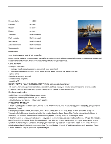 Symbol oferty: 114/2881 Państwo: no conv : Region: no conv : Miasto: no conv : Transport: Brak informacji Profil wyjazdu: Brak informacji Wyżywienie: Brak informacji Zakwaterowanie: Brak informacji Wyposażenie: Brak informacji świadczenia: WALENTYNKI W MIEŚCIE MIŁOŚCI Miasto poetów, malarzy, pokazów mody, zabytków architektonicznych, pięknych parków i ogrodów, romantycznych skwerów i nadsekwańskich bulwarów. Przez wielu nazywane jest kulturalną stolicą świata. Cena zawiera - transport autokarem - 1 nocleg w hotelu klasy turystycznej, pokoje 2, 3 os. z łazienkami - 1 śniadanie kontynentalne (płatki, dżem, masło, rogalik, kawa, herbata, sok pomarańczowy) - opiekę pilota - butelka -szampana” na pokój - zwiedzanie wg programu - podatek VAT DODATKOWO PŁATNE OBLIGATORYJNIE (doliczone do umowy)) - 65 euro/os. komunikacja miejska (metro), przewodnik, parkingi, wjazdy do miasta, taksa klimatyczna, lokalne podatki - 3 euro/os. zestawy tour quide, przy grupie powyżej 40 os., (płatne u pilota w autokarze) Dopłatyn opcjonalne - pokój 1 os. - dopłata 130 zł (płatne przy umowie) - wstępy do zwiedzanych obiektów (ok. 47 euro/os.) - obiadokolacje w self-service - 12 euro/os./1 posiłek PROGRAM IMPREZY 1 dzień wyjazd (godz. 12.00 z Katowic, Gliwic, ok. 15.00 z Wrocławia, inne miasta na zapytanie i z dopłatą), przejazd przez Niemcy do Francji. 2 dzień przyjazd do PARYŻA, zwiedzanie, m.in.: Wieża Eiffl’a (bilet ok. 17 euro, dzieci do 11 r. życia 14,5 euro), Łuk Triumfalny, Pola Elizejskie, dzielnica artystów Montmartre: Bazylika Sacre Coeur, Plac Pigalle, kabaret Moulin Rouge (z zewnątrz). Dla chętnych obiadokolacja w self-service (dopłata 12 euro), przejazd na nocleg do hotelu. 3 dzień śniadanie w hotelu, wykwaterowanie i przyjazd do centrum miasta, dalsze zwiedzanie Paryża - Wyspa Cite: Katedra Notre Dame, Ratusz miejski, Pałac Sprawiedliwości, Luwr (bilet ok. 15 euro, młodzież do 25 r. życia wstęp gratis), spacer ogrodami Tuilleries na plac Concorde. Dla chętnych wieczorem rejs statkiem po Sekwanie (koszt ok. 14 euro). W trakcie zwiedzania możliwość zjedzenia obiadokolacji we Flunchu (dopłata 12 euro). W godzinach wieczornych wyjazd do Polski. 4 dzień Powrót do kraju w godzinach popołudniowych. 1/2 UWAGI 1. Program jest ramowy - kolejność zwiedzania może ulec zmianie. 2. Pilot nie oprowadza po muzeach i obiektach sakralnych. Obiekty, podane w programie, zwiedzane są z zewnątrz, możliwość wejścia do środka (ew. opłata za wstęp dodatkowo płatna), we własnym zakresie. 3. Na wyjazd wymagany jest dowód osobisty lub paszport (ważne min. 3 miesiące od daty powrotu z wycieczki). 4. Możliwość ubezpieczenia od rezygnacji z imprezy oraz chorób przewlekłych (szczegóły w biurze). 5. Wyjazd przy min. 10 osobach chętnych i za dopłatą z: Warszawy i Łodzi 110 zł, Krakowa 60 zł. TERMINY: CENNIK: Długość pobytu: dni Grupa cenowa: Waluta: PLN Aktualne ceny z systemu S.A.R.T. (-) - cena usługi, podatku kalkulowana przy osobie lub gratis (*) - kwota wliczona w cenę standardową 2/2