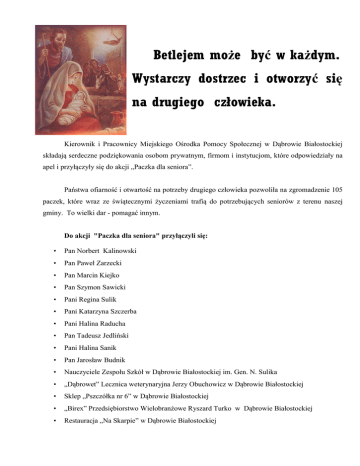 Betlejem może być w każdym. Wystarczy dostrzec i otworzyć się na drugiego człowieka. Kierownik i Pracownicy Miejskiego Ośrodka Pomocy Społecznej w Dąbrowie Białostockiej składają serdeczne podziękowania osobom prywatnym, firmom i instytucjom, które odpowiedziały na apel i przyłączyły się do akcji „Paczka dla seniora”. Państwa ofiarność i otwartość na potrzeby drugiego człowieka pozwoliła na zgromadzenie 105 paczek, które wraz ze świątecznymi życzeniami trafią do potrzebujących seniorów z terenu naszej gminy. To wielki dar - pomagać innym. Do akcji "Paczka dla seniora" przyłączyli się: • Pan Norbert Kalinowski • Pan Paweł Zarzecki • Pan Marcin Kiejko • Pan Szymon Sawicki • Pani Regina Sulik • Pani Katarzyna Szczerba • Pani Halina Raducha • Pan Tadeusz Jedliński • Pani Halina Sanik • Pan Jarosław Budnik • Nauczyciele Zespołu Szkół w Dąbrowie Białostockiej im. Gen. N. Sulika • „Dąbrowet” Lecznica weterynaryjna Jerzy Obuchowicz w Dąbrowie Białostockiej • Sklep „Pszczółka nr 6” w Dąbrowie Białostockiej • „Birex” Przedsiębiorstwo Wielobranżowe Ryszard Turko w Dąbrowie Białostockiej • Restauracja „Na Skarpie” w Dąbrowie Białostockiej • Pracownicy Banku Spółdzielczego w Sokółce, Oddział w Dąbrowie Białostockiej • Krzysztof Wilczyński ZHU Artykuły Sanitarne w Dąbrowie Białostockiej • Usługi - Transport Ciężarowy. Handel Artykułami Przemysłowymi – Stanisław i Bożena Walenciej z Dąbrowy Białostockiej • Właściciele i Pracownicy firmy „Handel Art. Spożywcze Józef Białostockiej • Sklep Wielobranżowy Adam Gromko w Dąbrowie Białostockiej • Sklep „Eldom AGD TV” Mariusz Kimborowicz w Dąbrowie Białostockiej • Przedsiębiorstwo Handlowe „Mlekpasz” Katarzyna Krzywosz • Pracownicy Publicznej Szkoły Podstawowej w Reszkowcach • Pracownicy Banku PKO B.P. SA Oddz. 1 w Dąbrowie Białostockiej • Uczniowie, Rodzice, Pracownicy Szkoły Podstawowej w Zwierzyńcu Wielkim • Sklep „Jeziorko” Andrzej Jezierkowski w Dąbrowie Białostockiej • Stacja Paliw Sp. Jawna Krysztopik w Dąbrowie Białostockiej • Przedsiębiorstwo Handlowo - Usługowe „Bud-Rol” Leszek Budnik w Dąbrowie Białostockiej • Kwiaciarnia „Fantazja” Andrzej Marcińczyk w Dąbrowie Białostockiej • Ob-telecom, Restauracja „Symptatia” Grzegorz Borach w Dąbrowie Białostockiej • Smak Mięso Wędliny Jerzy Szczęsny w Dąbrowie Białostockiej • Kwiaciarnia „Stokrotka” Bożena Krahel w Dąbrowie Białostockiej • Właściciel i Pracownicy Sklepu „Adamba” w Dąbrowie Białostockiej • Sklep „Debiut” Ewa Dzietczyk w Dąbrowie Białostockiej • Przedsiębiorstwo Handlowe „Mag” Magdalena Lewkowicz w Dąbrowie Białostockiej • Pracownicy Banku Pekao SA w Dąbrowie Białostockiej • Uczniowie Gimnazjum im. Armii Krajowej Zespołu Szkół Samorządowych Białostockiej • Pracownicy Powiatowego Urzędu Pracy w Sokółce Filia w Dąbrowie Białostockiej • Właściciele apteki „Twoja Apteka” U. Pieńkosz w Dąbrowie Białostockiej • Biebrzańskie Przedsiębiorstwo Nasienno - Handlowe „Kłos” Stanisław Reducha w Dąbrowie Białostockiej • Apteka „Bliska” w Dąbrowie Białostockiej • Pracownicy Miejski Ośrodek Pomocy Społecznej w Dąbrowie Białostockiej Mocarski” w Dąbrowie w Dąbrowie Dziękujemy !