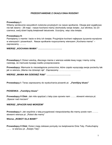 PRZEDSTAWIENIE Z OKAZJI DNIA RODZINY Prowadzący I: Witamy serdecznie wszystkich rodziców przybyłych na nasze spotkanie. Okazja jest wyjątkowa: nie tak dawno - 26 maja - nasze kochane mamy obchodziły swoje święto. Już wkrótce, bo 23 czerwca, swój dzień będą świętowali tatusiowie. Uczcijmy, więc oba święta. Prowadzący II: Pamiętamy o mamie i tacie w dniu ich święta. Przyjmijcie kochani najlepsze życzenia wyrażone w wierszach i piosenkach. Nasze spotkanie rozpoczniemy wierszem „Kochana mama” – zapraszamy ……... WIERSZ „KOCHANA MAMA” ………………………….. Prowadzący I: Dzieci wiedzą, dlaczego mama z wiersza wstała lewą nogą i mamy cichą nadzieję, że mamusie bywają rzadko przepracowane. Prowadzący: Mamusie to niezastąpione pomocnice, które często wyręczają swoje pociechy tak jak w wierszu „Mama ma dziesięć rąk”. Zapraszamy ……………………….. WIERSZ „MAMA MA DZIESIĘĆ RĄK” ………………………….. Prowadzący I: Teraz zapraszamy do wysłuchania piosenki pt. „Familijny blues” PIOSENKA „Familijny blues” Prowadzący II Olek: Jak mile spędzać z tatą czas opowie nam ……. słowami wiersza pt. „Spacer nad morzem” WIERSZ „SPACER NAD MORZEM” Prowadzący I: Jak wspólnie z tatą przygotować niespodziankę dla mamy powie nam …….. słowami wiersza pt. „Robot dla mamy” Wiersz „ROBOT DLA MAMY” Prowadzący II Olek: Dzieci mają ciekawe pomysły na świętowanie Dnia Taty. Posłuchajmy …… w wierszu pt. „Święto Taty”. 1 Wiersz „ŚWIĘTO TATY” Prowadzący I: A teraz zapraszamy na krótkie przedstawienie pt. „Rodzina nadzwyczajna” PRZEDSTAWIENIE „RODZINA NADZWYCZAJNA” (Po zakończonym przedstawieniu aktorzy ustawiają się na scenie w szeregu. Prowadzący dołączają do nich) Prowadzący I: Wystąpili: Mama – ………… Prowadzący II: Koźlątka – ………………… …………………….. …………………………… Prowadzący I Bartek: Wilk – ………………………. Narrator – ………………………. (Aktorzy wraz z Prowadzącymi schodzą ze sceny) Prowadzący II Olek: Teraz chcemy Państwa zaprosić do obejrzenia wywiadu przeprowadzonego z uczniami klas 3b i 3e pt. „Kilka słów o rodzicach”. FIMIK „KLIKA SŁÓW O RODZICACH” Prowadzący I Bartek: Wszystko co dobre, szybko się kończy. Niestety nasze spotkanie powoli dobiega końca. Prowadzący II Olek: Chcemy pożegnać się z Państwem filmikiem, który przedstawia nasze codzienne zajęcia w świetlicy w rytmie przeboju „Happy”. FILMIK „NASZA ŚWIETLICA – ŚWIATA STOLICA” Prowadzący I Bartek: Najwyższy czas obdarować naszych gości nie tylko wierszami i piosenkami, lecz także i upominkami. Prowadzący II Olek: Dziękujemy serdecznie za uwagę i jeszcze raz życzmy wszystkiego najlepszego wszystkim mamusiom i tatusiom! ( Wręczanie prezentów) KONIEC 2 Scena ilustrująca wnętrze domu. Izba ze stołem i krzesłami. Na ławeczce pod ścianą leży miotełka, ścierka do kurzu i wazon z kwiatami. Obok na stoliku talerzyki. Narrator: W maleńkiej chatce, w lesie nad zdrojem Mieszkała mama i koźląt troje. Żyli szczęśliwie do dnia pewnego, Miesiąca maja dwudziestego szóstego. Posłuchajcie drodzy widzowie No i popatrzcie, co teatrzyk opowie. Mama: Chodźcie dzieci na śniadanie. Zaraz słońce piękne wstanie. Koźlątko 1: Już pędzimy droga mamo! Koźlątko 2: Smacznie pachnie. Koźlątko 3: Znów to samo? ( z grymasem) Mama: Nie marudzić. Co za zbytki? Umyć ząbki i kopytka. Za stół usiąść, nic nie gadać Tylko zjadać, wszystko zjadać. ( Uśmiecha się, stawia na stole talerze). Koźlątka mrugają do siebie porozumiewawczo i poszturchują się. Koźlątko 1: Droga mamo, bardzo proszę, kup mi płatki i kalosze. Koźlątko 2: A ja chciałem nowe kredki. Koźlątko 3: Ja, cukierki i paletki. Razem: Dawno mamy obiecane, Za te szóstki dostawane! ( śmiech) Mama: ( po chwili zastanowienia) Dobrze drogie moje kózki. Po zakupy pójdę z wózkiem, Aż na targ, za leśną dróżką Skoczę szybko „jedną nóżką”. Pamiętajcie tylko mili Byście wilka nie wpuścili!. 3 Mama żegna się, przezornie grozi palcem i wychodzi zamykając drzwi. Koźlątka: Teraz domek posprzątamy, Będzie prezent na Dzień Mamy! Przynoszą akcesoria i zaczynają pracę z zapałem. Nagle ktoś puka. Koźlątka: Kto tam? Wilk: (udając) To ja mama, jestem tuż. Otwierajcie, ale już! Koźlątko 1: Nasza mama ma miły głos. Nigdy nie krzyczy, gdy woła nas. Koźlątko 2: Ma też swój kluczyk i zawsze śpiewa, Aż się kołyszą szyszki na drzewach! Koźlątko 3: I wiemy jeszcze, że jesteś wilk I chcesz nas pożreć w kilka chwil. Wilk: Ja jestem biedne, małe wilczysko, Mi jest potrzebne towarzystwo! Czy mogę zagrać na komputerze? Pojeżdżę z wami na rowerze, Ułożę puzzle, zrobię dżem, A potem... Koźlątka: ... was zjem! ( kiwają głowami politowaniem) Chwilę chodzą po izbie i myślą. Potem stają w kole i „namawiają się”. Wylewają klej pod drzwiami i ... Koźlątko 1: Zapraszamy, gościu drogi W nasze skromne, kozie progi. Otwierają drzwi i chowają się za nie. Wilk wbiega z impetem, a za chwilę nie może zrobić już kroku. Koźlątka po woli wychodzą. Koźlątko 2: Mamy cię marny spryciarzu. Teraz zrobisz, co ci karzę. Koźlątko 3: Pozamiatasz nam mieszkanie, 4 Na dzisiejsze świętowanie. Koźlątka wybiegają na środek izby, cieszą się i podskakują. Koźlątka: Trala, la, trala, la, mądra koza nie jest zła!~ Nagle harmider przerywa mama Mama: Co ja słyszę, co ja widzę! Już się za was bardzo wstydzę! Koźlątka: Ale mamo nasza droga! Zobacz, złapaliśmy wroga! Mama: Źle się stało i niegrzecznie, A w dodatku niebezpiecznie! Nie słuchały dzieci mamy No i kłopot teraz mamy. Koziołki opuszczają wstydliwie główki Wilk: Proszę pani jest mi wstyd. Obiecuję zniknąć w mig. Znowu będę sam, jak palec, Bo ja ma