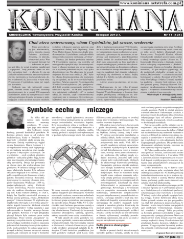 www.koniniana.netstrefa.com.pl MIESIĘCZNIK Towarzystwa Przyjaciół Konina listopad 2013 r. Nr 11 (131) Choć nieco zestresowany, witam Czytelników, jak zawsze, serdecznie Stres spowodowany jest wiadomością, którą, niestety, muszę Państwu przekazać. Jesteśmy, co prawda, tolerowani przez Was już ponad dziesięć lat – i sukcesem na pewno jest fakt, że wciąż jesteśmy oczekiwani i czytywani. Tutaj pozwolę sobie na niezbyt dowcipny żart – w obawie, by się nie zmieniło zainteresowanie naszym wydawnictwem, zaczniemy je trochę dawkować, dobra wiadomość że, jeszcze nie w tym roku. Przepraszam Czytelników, teraz już zupełnie poważnie. Dotknęła nas, jak większość czasopism, choroba zwana kryzysem. Jesteśmy ukontentowani, że w ponad 130 numerach Koninianów, udało się nam poruszyć i omówić najważniejsze kwestie związane z piękniejącym z dnia na dzień naszym miastem. Jesteśmy wdzięczni naszym autorom oraz niewątpliwie dobrej woli Wydawcy, Pana Pluta-Plutowskiego. Serdeczne dzięki przede wszystkim Czytelnikom za ciepły odbiór miesięcznika i jeszcze cieplejszą „krytykę”. Niestety, już bardzo poważnie musimy PT Czytelników zapytać, czy woleliby od nowego roku spotykać się z dwumiesięcznikiem w obecnej postaci, czy też co miesiąc, ale w wydaniu jednokartkowym, czyli tylko dwustronicowym. Nie ukrywam, że wygodniejszym dla nas oraz redakcji „PK” byłaby edycja dwumiesięcznika, ale postaramy się uwzględnić, na ile to oczywiście będzie możliwe, Państwa sugestie. Na moją prośbę Włodek Kowalczykiewicz (mł.) przeprowadził dość szerokie rozpoznanie wśród Czytelników i wyszło... że 98 proc. respondentów najchętniej widziałoby „K” w postaci takiej jak obecnie, czyli czterostronicowy wydawany raz w miesiącu. Oczywiście połechtało to nasze samopoczucie oraz utwier- dziło w kontynuowaniu misji(!?!?) Niestety, nie wszystko zależy od naszych chęci (tutaj ze wzruszeniem muszę podziękować spontanicznie zgłoszonym się sponsorom, to naprawdę jest piękne(sic!), prawdopodobnie jednak trudne do zrealizowania. Również dość ostro zarysowała się linia podziału w zespole redakcyjnym, jednakże zdecydowana większość optuje za dwumiesięcznikiem, nie trzeba będzie drastycznie skracać opisywanych zagadnień (już obecnie redaktorzy wykłócają się dosłownie o każdą linijkę tekstu). I to byłoby na tyle odnośnie czekających nas zmian. A teraz, jeszcze po staremu – ad res meritum. Podejrzewam, że już tylko Zygmunt Kowalczykiewicz (st.) pamięta oraz pisze o Kopalni Węgla Brunatnego w Koninie. Jego artykuł poświęcamy zbliżającym się uroczystościom barbórkowym. Damian Kruczkowski sprawozdaje zbiórkę organizowaną Symbole cechu górniczego Za kilka dni panować nam zacznie miesiąc nazwany grudniem. W czwartym jego dniu obchodzić będziemy święto Barbary, patronki konińskich górników. W Koninie górnicy znani są od wieków. Od średniowiecza, kiedy w Brzeźnie wykopywali i obrabiali skałę zwaną piaskowcem. Dzisiaj wydobywają węgiel zwany brunatnym. Dawni kopacze i i ci współcześni tworzą cech legitymujący się tradycją zawodową oraz zasadami prawa i obyczajów cechowych. Do wyróżników – czyli symboli górników polskich – zaliczamy godło, flagę, hymn oraz inne insygnia utwierdzające hierarchię zawodową. Dzieje ich powstania są równie stare jak wielowiekowe jest górnictwo. W interesie każdego ówczesnego właściciela kopalni była ochrona obszarów bogatych w w surowce. Z kopalń czerpali korzyści finansowe władcy państw, hierarchia świecka i kościelna. Zobrazować to możemy zbiorem przepisów Kazimierza Wielkiego (1334 r.), podporządkujących saliny Wieliczki władzy królewskiej. Pieczęć monarsza stała się znakiem chroniącym prawa kopaczy soli. Kilka wieków później, w 1528 r., książę Jan Opolski zatwierdził pierwszą w Polsce ustawę górniczą, zwaną „Ordunkiem gornym” Ustawa złożona z 72 artykułów porządkowała obowiązki i przywileje pracowników kopalń kruszców. Ordunek określał zależność górników wobec suzerena i jego pełnomocnika w kopalni, zwanego hetmanem gornym. Również i w tym przypadku pieczęć księcia była znakiem praw cechu górniczego. Przez termin „insygnium” rozumiemy wszystkie trwale wykonane przedmioty, będące symbolem władzy i znaczenia jednostek lub formalnych związków społecznych. Cech górników to jedna z grup zawodowych w której, hetman, zwany też starostą gornym, jak i niższym od niego w hierarchii zawodowej – żupnik (górmistrz), otrzymywali przywileje posługiwania się symbolem swego zwierzchnika, właściciela kopalni. Były to przedmioty różne w wielkości i formie graficznej. Od ozdobnego łańcucha z herbem, przez pieczęcie, statuetki, szable, szpady, po laski z rękojeściami wykonanymi w postaci stylizowanego kilofa lub oskardu. W miarę rozwoju górnictwa europejskiego, oprócz insygniów już istniejących, tworzono nowe znaki cechowe, wzorowane na herbach ziemskich, miejskich lub rodowych. Powstała również grupa wyróżników nawiązujących do narzędzi pracy. Między XIII a XV w. szlacheckie znaki herbowe poszerzone zostały o inne, związane z wykonywaną funkcją świecką lub duchowną. Fundowały je korporacje kościelne (biskupstwa, kapituły, opactwa, zakony rycerskie) oraz cechy rzemieślnicze. W taki sposób do cechu górników weszły nowe wyróżniki, wzorowane na herbach właścicieli kopalń. Tak było między innymi w Rudawach i Górach Kruszcowych, gdzie wiele ośrodków górniczych należało do biskupów. Z kolei świeckim przykładem, jest herb górników rudnych spod Łysej Góry (Kielecczyzna), przedstawiający w owalnej tarczy kilof wykonany z jeleniego rogu. Narzędzie to zwano kopasem. O kształcie tarczy herbowej, barwie pola i godła decydowały zasady heraldyczne. Obowiązywały następujące kolory: czerwony, błękitny,