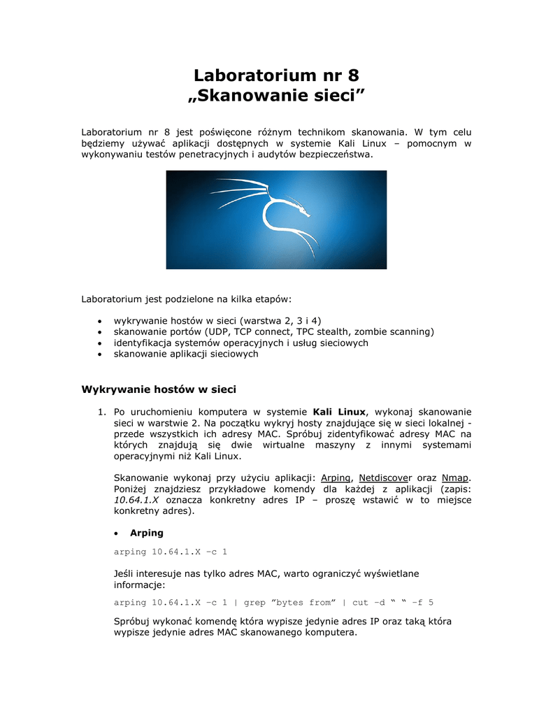 Laboratorium nr 8 „Skanowanie sieci” Laboratorium nr 8 jest poświęcone różnym technikom skanowania. W tym celu będziemy używać aplikacji dostępnych w systemie Kali Linux – pomocnym w wykonywaniu testów penetracyjnych i audytów bezpieczeństwa. Laboratorium jest podzielone na kilka etapów: wykrywanie hostów w sieci (warstwa 2, 3 i 4) skanowanie portów (UDP, TCP connect, TPC stealth, zombie scanning) identyfikacja systemów operacyjnych i usług sieciowych skanowanie aplikacji sieciowych Wykrywanie hostów w sieci 1. Po uruchomieniu komputera w systemie Kali Linux, wykonaj skanowanie sieci w warstwie 2. Na początku wykryj hosty znajdujące się w sieci lokalnej przede wszystkich ich adresy MAC. Spróbuj zidentyfikować adresy MAC na których znajdują się dwie wirtualne maszyny z innymi systemami operacyjnymi niż Kali Linux. Skanowanie wykonaj przy użyciu aplikacji: Arping, Netdiscover oraz Nmap. Poniżej znajdziesz przykładowe komendy dla każdej z aplikacji (zapis: 10.64.1.X oznacza konkretny adres IP – proszę wstawić w to miejsce konkretny adres). Arping arping 10.64.1.X –c 1 Jeśli interesuje nas tylko adres MAC, warto ograniczyć wyświetlane informacje: arping 10.64.1.X –c 1 | grep ”bytes from” | cut –d “ “ –f 5 Spróbuj wykonać komendę która wypisze jedynie adres IP oraz taką która wypisze jedynie adres MAC skanowanego komputera. Netdiscover Aktywne skanowanie sieci (wysyłanie żądań do wszystkich hostów w sieci): netdiscover 10.64.1.0/24 Pasywne wykrywanie hostów w sieci (skanowanie nie wzbudza podejrzeń chociaż zajmuje znacznie więcej czasu): netdiscover –p Nmap Uruchom polecenie nmap z opcją: -sn nmap 10.64.1.X -sn Skanowanie całej sieci: nmap 10.64.1.0-255 -sn Zauważ że Nmap skanuje sieć w warstwie 2 jedynie wtedy gdy jest to możliwe. W przeciwnym wypadku, automatycznie przechodzi do skanowania w warstwie 3. Żeby to sprawdzić – przeskanuj jakiś komputer spoza sieci lokalnej. Jakie informacje o hostach jesteśmy w stanie zebrać podczas skanowania w warstwie drugiej? Jakich protokołów możemy w tym celu użyć? Czy w warstwie drugiej możemy skanować hosty spoza sieci lokalnej (odpowiedź uzasadnij)? 2. Wykonaj skanowanie sieci lokalnej w warstwie 3 przy użyciu aplikacji: fping i hping3. Zapoznaj się z informacjami jakie zwracają odpytywane hosty (osiągalny oraz nieosiągalny). fping fping 10.64.1.X –c 5 (wysyłanie konkretnej liczby pakietów) fping –g 10.64.1.85 10.64.1.170 (skanowanie zakresu sieci) fping –g 10.64.1.0/24 (skanowanie podsieci) hping3 hping3 10.64.1.X --icmp hping3 10.64.1.X --icmp –c 1 W celu automatyzacji procesu skanowania w warstwie 3 warto napisać prosty skrypt, który wykryje aktywne hosty. Przykład znajduje się poniżej. Przeanalizuj jego działanie, a następnie uruchom i zweryfikuj jego działanie (podczas skanowania podglądnij zawartość tymczasowego pliku tmp.txt). Po wykonaniu skryptu, wynik skanowania znajdziesz w pliku wyniki.txt #!/bin/bash if [ "$#" -ne 1 ]; then echo "Uzyj prawidlowej skladni: ./nazwa_skryptu.sh [/24 network address]" echo "Przyklad: ./nazwa_skryptu.sh 10.64.1.0" exit fi prefix=$(echo $1 | cut -d '.' -f 1-3) for addr in $(seq 1 254); do hping3 $prefix.$addr --icmp -c 1 >> tmp.txt; done grep len tmp.txt | cut -d " " -f 2 | cut -d "=" -f 2 >> wyniki.txt rm tmp.txt Jakie informacje o hostach jesteśmy w stanie zebrać podczas skanowania w warstwie trzeciej? Jakich protokołów możemy w tym celu użyć? 3. Wykonaj skanowanie sieci lokalnej w warstwie 4 przy użyciu aplikacji: nmap i hping3. Zapoznaj się z informacjami jakie zwracają odpytywane hosty. Nmap Skanowanie UDP oraz TCP można wykonać stosując opcje: -PU oraz –PA, po których należy podać numer portu: nmap nmap nmap nmap 10.64.1.X –PU53 –sn 10.64.1.0-255 –PU53 -sn 10.64.1.X –PA80 –sn 10.64.1.0-255 –PA80 –sn (wysłanie pakietu UDP) (wysłanie pakietu TCP z ustawioną flagą ACK) hping3 hping3 –-udp 10.64.1.X hping3 –-udp 10.64.1.X –c 1 W celu zautomatyzowania całego procesu, użyj zmodyfikowanego skryptu bash użytego podczas skanowania w warstwie 3. Jakie informacje o hostach jesteśmy w stanie zebrać podczas skanowania w warstwie czwartej? Jakich protokołów możemy w tym celu użyć? Skanowanie portów 4. Wykonaj skanowanie portów UDP serwerów uruchomionych na wirtualnych maszynach (użyj aplikacji Nmap i pakietu Metasploit). Zapisz zebrane informacje. Nmap nmap nmap nmap nmap –sU –sU –sU –sU 10.64.1.X 10.64.1.X –p 53 10.64.1.X –p 1-200 10.64.1.0-255 –p 53 Skanowanie UDP przy użyciu programu Metasploit Metasploit dysponuje wieloma modułami pomocniczymi, które można wykorzystać do skanowania sieci. Przykładem jest moduł udp_sweep. Aby go użyć, należy uruchomić konsolę Metasploit: msfconsole Następnie wybrać odpowiedni moduł: use auxiliary/scanner/discovery/udp_sweep Sprawdzić ustawienia za pomocą komendy: show options W przypadku tego modułu wystarczy ustawić jedynie zmienną RHOSTS: set RHOSTS 10.64.1.X show options Uruchamiamy skaner za pomocą komendy: run Inne skanery znajdziesz w: auxiliary/scanner/discovery/arp_sweep auxiliary/scanner/portscan/tcp auxiliary/scanner/portscan/syn Które porty na skanowanych maszynach są otwarte? Jakie aplikacje mogą ich używać? 5. Wykonaj skanowanie portów TCP używając metody TPC Connect. Skorzystaj z aplikacji: Nmap, Dmitry i Netcat Nmap Skanowanie portów przy użyciu opcji: -sT nmap –sT nmap –sT nmap –sT nmap –sT portów) nmap –sT 10.64.1.X –p 80 10.64.1.X –p 80,443,1234 10.64.1.X –p 1-65535 10.64.1.X (cały zakres portów TCP) (lista 1000 najpopularniejszych 10.64.1.0-255 –p 80 Dmitry Sprawdź dostępne opcje programu Dmitry: dmitry Wykonaj skanowanie TCP Connect z opcją -p: dmitry –p 10.64.1.X Netcat Uruchom program Netcat (komenda: nc) z parametrem –h aby sprawdzić składnię i dostępne opcje. Następnie wykonaj skanowanie portów TCP: nc –nv