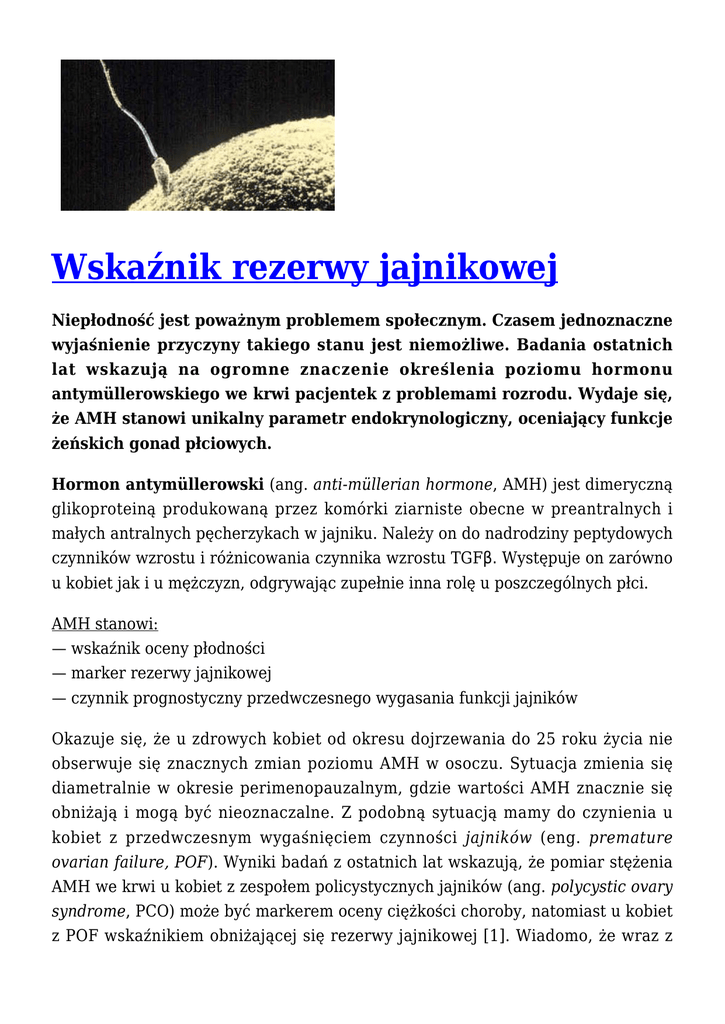 Wskaźnik rezerwy jajnikowej Niepłodność jest poważnym problemem społecznym. Czasem jednoznaczne wyjaśnienie przyczyny takiego stanu jest niemożliwe. Badania ostatnich lat wskazują na ogromne znaczenie określenia poziomu hormonu antymüllerowskiego we krwi pacjentek z problemami rozrodu. Wydaje się, że AMH stanowi unikalny parametr endokrynologiczny, oceniający funkcje żeńskich gonad płciowych. Hormon antymüllerowski (ang. anti-müllerian hormone, AMH) jest dimeryczną glikoproteiną produkowaną przez komórki ziarniste obecne w preantralnych i małych antralnych pęcherzykach w jajniku. Należy on do nadrodziny peptydowych czynników wzrostu i różnicowania czynnika wzrostu TGFβ. Występuje on zarówno u kobiet jak i u mężczyzn, odgrywając zupełnie inna rolę u poszczególnych płci. AMH stanowi: — wskaźnik oceny płodności — marker rezerwy jajnikowej — czynnik prognostyczny przedwczesnego wygasania funkcji jajników Okazuje się, że u zdrowych kobiet od okresu dojrzewania do 25 roku życia nie obserwuje się znacznych zmian poziomu AMH w osoczu. Sytuacja zmienia się diametralnie w okresie perimenopauzalnym, gdzie wartości AMH znacznie się obniżają i mogą być nieoznaczalne. Z podobną sytuacją mamy do czynienia u kobiet z przedwczesnym wygaśnięciem czynności jajników (eng. premature ovarian failure, POF). Wyniki badań z ostatnich lat wskazują, że pomiar stężenia AMH we krwi u kobiet z zespołem policystycznych jajników (ang. polycystic ovary syndrome, PCO) może być markerem oceny ciężkości choroby, natomiast u kobiet z POF wskaźnikiem obniżającej się rezerwy jajnikowej [1]. Wiadomo, że wraz z wiekiem spada ilość wytwarzanych pęcherzyków jajnikowych. U kobiet posiadających wiele małych pęcherzyków, a także z zespołem PCO, stężenie AMH jest wysokie. U kobiet z niewielką ilością pęcherzyków oraz kobiet po menopauzie występuje niski poziom hormonu antymülerrowskiego. Oznaczenie stężenia AMH może służyć aktualnej ocenie potencjału macierzyńskiego, pozwalając określić zdolność pacjentki do uzyskania własnych komórek jajowych oraz oszacować czas, w jakim kobieta będzie w stanie zajść w ciążę. Przypuszcza się, że szanse powodzenia zapłodnienia in vitro rosną wraz ze wzrostem poziomu AMH, a tym samym stężenie AMH koreluje z odsetkiem prawidłowo zapłodnionych komórek. Znajomość poziomu rezerwy jajnikowej, dzięki oznaczeniu AMH, pozwala na zaplanowanie leczenia w razie problemów z zajściem w ciążę. Niski poziom rezerwy jajnikowej może wiązać się z koniecznością pobrania i zamrożenia komórek jajowych zanim rezerwa ulegnie wyczerpaniu [2,5]. Dodatkowym atutem AMH jest możliwość wykorzystania oznaczenia w przewidywaniu momentu wejścia w okres menopauzy. Wraz ze wzrostem pęcherzyka poziom AMH stopniowo się obniża. Mimo to stężenie AMH w osoczu jest dość stabilne, co pozwala na wykonanie badania w dowolnym dniu cyklu. AMH odzwierciedla stały FSH-niezależny wzrost pierwotnych pęcherzyków jajnikowych [2]. Ze względu na stosunkowo krótki okres wykorzystania oznaczenia i braku rutynowego badania poziomu AMH w przeszłości, wyznaczenie zakresów referencyjnych może nastręczać pewne trudności. Wysokie poziomy AMH we krwi (powyżej 4,0 ng/ml) zwykle wiążą się z PCOS. Poziom prawidłowy wynosi zazwyczaj ponad 1,5 ng/ml aczkolwiek wartości w granicach 1,0 do 1,5 ng/ml mogą być traktowane jako wartość prawidłowa niska. O bardzo niskim poziomie mówi się gdy wartości AMH są poniżej 0,5 ng/ml [3]. Wartości prawidłowe mogą różnić się pomiędzy poszczególnymi laboratoriami. Należy także wspomnieć, że AMH u mężczyzn wytwarzany jest przez jądra w okresie życia płodowego i przed okresem dojrzewania płciowego. W życiu płodowym AMH powoduje zanik przewodów Müllera, natomiast w okresie przedpokwitaniowym wpływa na rozwój i czynność jąder. Stężenie AMH pozwala na dobrą ocenę czynności tkanki jądrowej przed okresem dojrzewania. Wykonanie oznaczenia AMH może ułatwić decyzję terapeutyczne u dzieci z wnętrostwem i zaburzonym rozwojem narządów płciowych. Pomiar poziomu AMH może okazać się przydatny w badaniach niepłodności mężczyzn, niemniej jednak nie powinien być traktowany jako jedyny marker efektywności spermatogenezy [4,5]. AMH stanowi unikalny parametr endokrynologiczny, oceniający funkcje żeńskich gonad płciowych Źródło: Wikimedia Commons, licencja CC0 Do tej pory powszechnie stosowany w ocenie rezerwy jajnikowej był poziom folikulotropiny, wykonywany w pierwszych dniach cyklu pacjentki. Obecnie okazuje się, że rewolucyjnym osiągnięciem w zakresie kontroli płodności i planowania potomstwa jest możliwość określenia poziomu AMH. Tempo życia nowoczesnych kobiet często prowadzi do odwlekania decyzji o podjęciu macierzyństwa. AMH może stać się nie tylko sposobem na terapię zaburzeń płodności, ale także istotnym wskaźnikiem wpływającym na zmianę życiowych priorytetów kobiety. mgr Agnieszka Helis, diagnosta laboratoryjny Piśmiennictwo: 1. Skałba P., Cygal A. Stężenie hormonu antymüllerowskiego w surowicy u kobiet z zespołem policystycznych jajników i w zespole przedwczesnego wygasania czynności jajników.Przegląd Menopauzalny, 2011; 3: 232-236. 2. . Waszak K., Łukaszuk K. AMH – anti-Müllerian hormone – nowoczesna ocena rezerwy jajnikowej. Invicta. 3. Sherbahn R. Anti-Mullerian Hormone Testing of Ovarian Reserve. Advanced Fertility Center of Chicago. 4. La Marca A., Sighinolfi G., Radi D. et al. Anti-Mullerian hormone (AMH) as a predictive marker in assisted reproductive technology (ART). Hum Reprod Update, 2010; 16, 2: 113-130. 5. Alshiek JA., Lessing JB., Amit A. et al. Anti mullerian hormone (AMH)–is it a new reliable marker of the ovarian reserve? Its role in predicting the ovarian response in assisted reproductive technology (ART). Harefuah, 2012; 151, 7: 416-420,