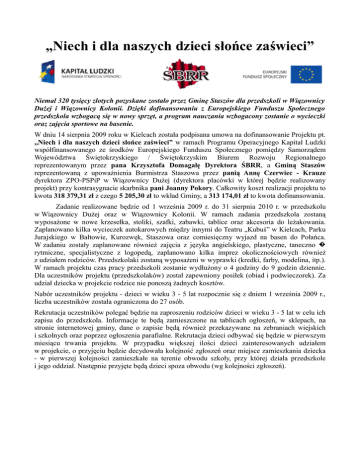 „Niech i dla naszych dzieci słońce zaświeci” Niemal 320 tysięcy złotych pozyskane zostało przez Gminę Staszów dla przedszkoli w Wiązownicy Dużej i Wiązownicy Kolonii. Dzięki dofinansowaniu z Europejskiego Funduszu Społecznego przedszkola wzbogacą się w nowy sprzęt, a program nauczania wzbogacony zostanie o wycieczki oraz zajęcia sportowe na basenie. W dniu 14 sierpnia 2009 roku w Kielcach została podpisana umowa na dofinansowanie Projektu pt. „Niech i dla naszych dzieci słońce zaświeci” w ramach Programu Operacyjnego Kapitał Ludzki współfinansowanego ze środków Europejskiego Funduszu Społecznego pomiędzy Samorządem Województwa Świętokrzyskiego / Świętokrzyskim Biurem Rozwoju Regionalnego reprezentowanym przez pana Krzysztofa Domagałę Dyrektora ŚBRR, a Gminą Staszów reprezentowaną z upoważnienia Burmistrza Staszowa przez panią Annę Czerwiec - Krauze dyrektora ZPO-PSPiP w Wiązownicy Dużej (dyrektora placówki w której będzie realizowany projekt) przy kontrasygnacie skarbnika pani Joanny Pokory. Całkowity koszt realizacji projektu to kwota 318 379,31 zł z czego 5 205,30 zł to wkład Gminy, a 313 174,01 zł to kwota dofinansowania. Zadanie realizowane będzie od 1 września 2009 r. do 31 sierpnia 2010 r. w przedszkolu w Wiązownicy Dużej oraz w Wiązownicy Kolonii. W ramach zadania przedszkola zostaną wyposażone w nowe krzesełka, stoliki, szafki, zabawki, tablice oraz akcesoria do leżakowania. Zaplanowano kilka wycieczek autokarowych między innymi do Teatru „Kubuś” w Kielcach, Parku Jurajskiego w Bałtowie, Kurozwęk, Staszowa oraz comiesięczny wyjazd na basen do Połańca. W zadaniu zostały zaplanowane również zajęcia z języka angielskiego, plastyczne, taneczno � rytmiczne, specjalistyczne z logopedą, zaplanowano kilka imprez okolicznościowych również z udziałem rodziców. Przedszkolaki zostaną wyposażeni w wyprawki (kredki, farby, modelina, itp.). W ramach projektu czas pracy przedszkoli zostanie wydłużony o 4 godziny do 9 godzin dziennie. Dla uczestników projektu (przedszkolaków) został zapewniony posiłek (obiad i podwieczorek). Za udział dziecka w projekcie rodzice nie ponoszą żadnych kosztów. Nabór uczestników projektu - dzieci w wieku 3 - 5 lat rozpocznie się z dniem 1 września 2009 r., liczba uczestników została ograniczona do 27 osób. Rekrutacja uczestników polegać będzie na zaproszeniu rodziców dzieci w wieku 3 - 5 lat w celu ich zapisu do przedszkola. Informacje te będą zamieszczone na tablicach ogłoszeń, w sklepach, na stronie internetowej gminy, dane o zapisie będą również przekazywane na zebraniach wiejskich i szkolnych oraz poprzez ogłoszenia parafialne. Rekrutacja dzieci odbywać się będzie w pierwszym miesiącu trwania projektu. W przypadku większej ilości dzieci zainteresowanych udziałem w projekcie, o przyjęciu będzie decydowała kolejność zgłoszeń oraz miejsce zamieszkania dziecka - w pierwszej kolejności zamieszkałe na terenie obwodu szkoły, przy której działa przedszkole i jego oddział. Następnie przyjęte będą dzieci spoza obwodu (wg kolejności zgłoszeń).