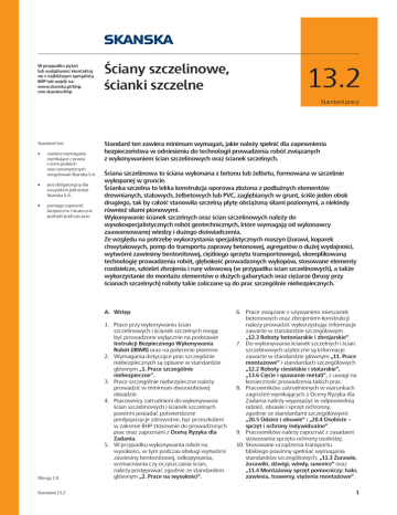 W przypadku pytań lub wątpliwości skontaktuj się z najbliższym specjalistą BHP lub wejdź na: www.skanska.pl/bhp, one.skanska/bhp Ściany szczelinowe, ścianki szczelne 13.2 Standard pracy Standard ten: • zawiera wymagania wynikające z prawa i norm polskich oraz wewnętrznych uregulowań Skanska S.A. • jest obligatoryjny dla wszystkich jednostek Skanska S.A. • pomaga zapewnić bezpieczne i skuteczne praktyki podczas prac. Standard ten zawiera minimum wymagań, jakie należy spełnić dla zapewnienia bezpieczeństwa w odniesieniu do technologii prowadzenia robót związanych z wykonywaniem ścian szczelinowych oraz ścianek szczelnych. Ściana szczelinowa to ściana wykonana z betonu lub żelbetu, formowana w szczelinie wykopanej w gruncie. Ścianka szczelna to lekka konstrukcja oporowa złożona z podłużnych elementów drewnianych, stalowych, żelbetowych lub PVC, zagłębianych w grunt, ściśle jeden obok drugiego, tak by całość stanowiła szczelną płytę obciążoną siłami poziomymi, a niekiedy również siłami pionowymi. Wykonywanie ścianek szczelnych oraz ścian szczelinowych należy do wysokospecjalistycznych robót geotechnicznych, które wymagają od wykonawcy zaawansowanej wiedzy i dużego doświadczenia. Ze względu na potrzebę wykorzystania specjalistycznych maszyn (żurawi, koparek chwytakowych, pomp do transportu zaprawy betonowej, agregatów o dużej wydajności, wytwórni zawiesiny bentonitowej, ciężkiego sprzętu transportowego), skomplikowaną technologię prowadzenia robót, głębokość prowadzonych wykopów, stosowane elementy rozdzielcze, szkielet zbrojenia i rurę wlewową (w przypadku ścian szczelinowych), a także wykorzystanie do montażu elementów o dużych gabarytach oraz ciężarze (brusy przy ścianach szczelnych) roboty takie zaliczane są do prac szczególnie niebezpiecznych. A. Wstęp Wersja 1.0 Standard 13.2 1. Prace przy wykonywaniu ścian szczelinowych i ścianek szczelnych mogą być prowadzone wyłącznie na podstawie Instrukcji Bezpiecznego Wykonywania Robót (IBWR) oraz na polecenie pisemne. 2. Wymagania dotyczące prac szczególnie niebezpiecznych są opisane w standardzie głównym „1. Prace szczególnie niebezpieczne”. 3. Prace szczególnie niebezpieczne należy prowadzić w minimum dwuosobowej obsadzie. 4. Pracownicy zatrudnieni do wykonywania ścian szczelinowych i ścianek szczelnych powinni posiadać potwierdzone predyspozycje zdrowotne, być przeszkoleni w zakresie BHP stosownie do prowadzonych prac oraz zapoznani z Oceną Ryzyka dla Zadania. 5. W przypadku wykonywania robót na wysokości, w tym podczas obsługi wytwórni zawiesiny bentonitowej, odkopywania, wzmacniania czy oczyszczania ścian, należy postępować zgodnie ze standardem głównym „2. Prace na wysokości”. 6. Prace związane z używaniem mieszanek betonowych oraz zbrojeniem konstrukcji należy prowadzić wykorzystując informacje zawarte w standardzie szczegółowym „12.3 Roboty betoniarskie i zbrojarskie”. 7. Do wykonywania ścianek szczelnych i ścian szczelinowych użyteczne są informacje zawarte w standardzie głównym „11. Prace montażowe” i standardach szczegółowych „12.2 Roboty ciesielskie i stolarskie”, „13.6 Cięcie i spawanie metali”, z uwagi na konieczność prowadzenia takich prac. 8. Pracowników zatrudnionych w warunkach zagrożeń wynikających z Oceny Ryzyka dla Zadania należy wyposażyć w odpowiednią odzież, obuwie i sprzęt ochronny, zgodnie ze standardami szczegółowymi: „20.5 Odzież i obuwie” i „20.4 Osobiste – sprzęt i ochrony indywidualne”. 9. Pracowników należy zapoznać z zasadami stosowania sprzętu ochrony osobistej. 10. Stosowane urządzenia transportu bliskiego powinny spełniać wymagania standardów szczegółowych: „11.3 Żurawie, żurawiki, dźwigi, windy, suwnice” oraz „11.4 Montażowy sprzęt pomocniczy: haki, zawiesia, trawersy, stężenia montażowe”. 1 Rys. 1 Bezpieczne odległości pracy żurawia od napowietrznych linii energetycznych Rys. 2 Bezpieczne odległości pracy koparki od napowietrznych linii energetycznych Rys. 3 Myjnia dla pojazdów budowy 2 11. Roboty w bezpośrednim sąsiedztwie linii energetycznych należy prowadzić zgodnie z wytycznymi zawartymi w standardzie szczegółowym „4.4 Praca w sąsiedztwie linii elektroenergetycznych” (Rys. 1, 2). 12. Wykonywanie prac nad wodą, na wodzie i z wody należy prowadzić uwzględniając informacje zawarte w standardzie szczegółowym „13.5 Roboty na wodzie, w wodzie oraz w kesonach”. 13. Obszar prowadzenia prac przy budowaniu ścian szczelnych czy ścianek szczelinowych należy wygrodzić, oznakować i zabezpieczyć przed dostępem osób postronnych w sposób opisany w Instrukcji Bezpiecznego Wykonywania Robót (IBWR), zgodnie ze standardem szczegółowym „9.2 Dostęp i zabezpieczanie budów”. 14. W przypadku, gdy wykonywanie ścianek szczelnych na budowie powoduje zagrożenie dla otoczenia przez zakłócenia komunikacji pieszej czy pojazdów, niezbędne jest prowadzenie prac zgodnie ze standardem głównym „5. Prace pod ruchem”. 15. Na stanowiskach pracy przy budowaniu ścian szczelinowych czy ścianek szczelnych nie należy przechowywać więcej materiałów, surowców i odpadów, niż wynika to z potrzeby utrzymania ciągłości pracy w czasie jednej zmiany roboczej, przy czym urobek i inne odpady powinny być sukcesywnie usuwane. 16. Przed wyjazdem z terenu budowy należy umieścić myjnie dla pojazdów opuszczających jej teren, ponieważ charakter prowadzonych robót w wysokim stopniu uprawdopodabnia, że sprzęt ten będzie z zewnątrz pokryty materiałem z podłoża, urobku czy używanych materiałów (szczególnie koła, podwozie i skrzynia ładunkowa) (Rys. 3). betonowanych (np. w kształcie litery T lub L), wykonywany w celu przenoszenia obciążeń pionowych i/lub poziomych. 6. Barety ze względu na łatwiejsze i szybsze wykonanie stosowane są często zamiast pali wielko