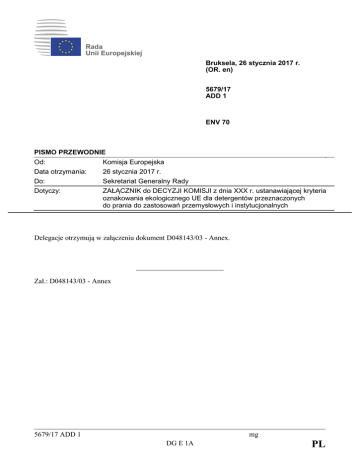 Rada Unii Europejskiej Bruksela, 26 stycznia 2017 r. (OR. en) 5679/17 ADD 1 ENV 70 PISMO PRZEWODNIE Od: Data otrzymania: Do: Komisja Europejska 26 stycznia 2017 r. Dotyczy: ZAŁĄCZNIK do DECYZJI KOMISJI z dnia XXX r. ustanawiającej kryteria oznakowania ekologicznego UE dla detergentów przeznaczonych do prania do zastosowań przemysłowych i instytucjonalnych Sekretariat Generalny Rady Delegacje otrzymują w załączeniu dokument D048143/03 - Annex. Zał.: D048143/03 - Annex 5679/17 ADD 1 mg DG E 1A PL D048143/03 PL ZAŁĄCZNIK KRYTERIA OZNAKOWANIA EKOLOGICZNEGO UE RAMY Kryteria przyznawania oznakowania ekologicznego UE detergentom przeznaczonym do prania do zastosowań przemysłowych i instytucjonalnych KRYTERIA 1. Toksyczność w stosunku do organizmów wodnych 2. Biodegradowalność 3. Zrównoważony środowiskowo wybór dostawców oleju palmowego, oleju z ziaren palmowych i pochodnych tych olejów 4. Substancje objęte wyłączeniami i ograniczeniami 5. Opakowanie 6. Zdatność do użycia 7. Automatyczne systemy dozowania 8. Informacje dla użytkowników 9. Informacje widniejące na oznakowaniu ekologicznym UE OCENA I WERYFIKACJA a) Wymogi W ramach każdego kryterium wskazano szczegółowe wymogi w zakresie oceny i weryfikacji. W przypadku gdy w celu wykazania zgodności z kryteriami wnioskodawca jest zobowiązany do dostarczenia właściwym organom deklaracji, dokumentacji, analiz, sprawozdań z badań 1 D048143/03 lub innych dowodów, mogą one pochodzić w stosownych przypadkach od wnioskodawcy lub od jego dostawcy (dostawców). Właściwe organy uznają na zasadzie preferencyjnej zaświadczenia wydane przez organy akredytowane zgodnie z właściwą normą zharmonizowaną dla laboratoriów badawczych i kalibracyjnych oraz weryfikację przez organy akredytowane zgodnie z właściwą normą zharmonizowaną dla organów certyfikujących produkty, procesy i usługi. Akredytację przyznaje się zgodnie z rozporządzeniem Parlamentu Europejskiego i Rady (WE) nr 765/2008 1. W stosownych przypadkach można stosować metody badania inne od wskazanych dla każdego z kryteriów, jeżeli właściwy organ oceniający wniosek uzna je za metody równoważne. W stosownych przypadkach właściwe organy mogą wymagać odpowiedniej dokumentacji, a także mogą przeprowadzać niezależne badania weryfikacyjne lub inspekcje na miejscu. Warunkiem wstępnym jest spełnienie przez produkt wszystkich odpowiednich wymogów prawnych państwa (państw), w którym (w których) produkt ma zostać wprowadzony do obrotu. Wnioskodawca oświadcza, że produkt jest zgodny z tym wymogiem. Wykaz w bazie danych składników detergentów („wykaz DID”), który jest dostępny na stronie internetowej dotyczącej oznakowania ekologicznego UE, zawiera najpowszechniej stosowane substancje obecne w składzie detergentów i kosmetyków. Wykaz ten musi stanowić źródło danych do obliczeń krytycznej objętości rozcieńczenia (CDV) oraz do oceny biodegradowalności substancji obecnych w składzie produktu. W odniesieniu do substancji, które nie figurują w wykazie DID, podaje się wytyczne dotyczące sposobu obliczania lub ekstrapolowania odpowiednich danych. Właściwemu organowi należy przekazać wykaz wszystkich substancji obecnych w składzie produktu, obejmujący nazwę handlową (jeżeli istnieje), nazwę chemiczną, nr CAS, nr DID, ilość, funkcję i formę substancji obecnych w składzie produktu (w tym folię rozpuszczalną w wodzie, jeśli jest stosowana). Konserwanty, substancje zapachowe i barwniki należy podać niezależnie od ich stężenia. Pozostałe substancje obecne w składzie produktu należy podać, jeżeli ich stężenie wynosi co najmniej 0,010 % w/w. 1 Rozporządzenie Parlamentu Europejskiego i Rady (WE) nr 765/2008 z dnia 9 lipca 2008 r. ustanawiające wymagania w zakresie akredytacji i nadzoru rynku odnoszące się do warunków wprowadzania produktów do obrotu i uchylające rozporządzenie (EWG) nr 339/93 (Dz.U. L 218 z 13.8.2008, s. 30). 2 D048143/03 W wykazie należy wyraźnie zaznaczyć wszystkie substancje obecne w składzie produktu w postaci nanomateriałów, podając w nawiasie wyraz „nano”. W odniesieniu do każdej substancji obecnej w składzie produktu przedstawia się karty charakterystyki (SDS) zgodnie z rozporządzeniem (WE) nr 1907/2006 Parlamentu Europejskiego i Rady 2. Jeżeli dana substancja nie posiada SDS, ponieważ stanowi część mieszaniny, wnioskodawca przedstawia SDS dla mieszaniny. b) Progi pomiarowe Wszystkie substancje obecne w składzie produktu muszą być zgodne z kryteriami ekologicznymi określonymi w tabeli 1. Tabela 1 Wartości progowe substancji obecnych w składzie produktu w podziale na kryteria dla detergentów przeznaczonych do prania do zastosowań przemysłowych i instytucjonalnych (% w/w) Surfaktanty Konserwanty Barwniki Substancje zapachowe Inne (np. enzymy) ≥ 0,010 Bez ograniczeń* Bez ograniczeń* Bez ograniczeń* ≥ 0,010 Surfaktanty ≥ 0,010 nd. nd. nd. nd. Substancje organiczne ≥ 0,010 Bez ograniczeń* Bez ograniczeń* Bez ograniczeń* ≥ 0,010 Zrównoważony środowiskowo wybór dostawców oleju palmowego ≥ 0,010 nd. nd. nd. ≥ 0,010 Określone substancje objęte wyłączenia mi i ograniczenia mi Bez ograniczeń* Bez ograniczeń* Bez ograniczeń* Bez ograniczeń* Bez ograniczeń* Substancje niebezpiecz ne ≥0,010 ≥0,010 ≥0,010 ≥0,010 ≥0,010 Nazwa kryterium Toksyczność w stosunku do organizmów wodnych Biodegradowaln ość Substancje objęte wyłączeniami lub ograniczeniami 2 Rozporządzenie (WE) nr 1907/2006 Parlamentu Europejskiego i Rady z dnia 18 grudnia 2006 r. w sprawie rejestracji, oceny, udzielania zezwoleń i stosowanych ograniczeń w zakresie chemikaliów (REACH) (Dz.U. L 396 z 30.12.2006, s. 1). 3 D048143/03 SVHC Bez ograniczeń* Bez ograniczeń* Bez ograniczeń* Bez ograniczeń* Bez ograniczeń* Substancje zapachowe nd. nd. nd. Bez ograniczeń* nd. Konserwant y nd. Bez ograniczeń* nd. nd. nd. Barwniki 