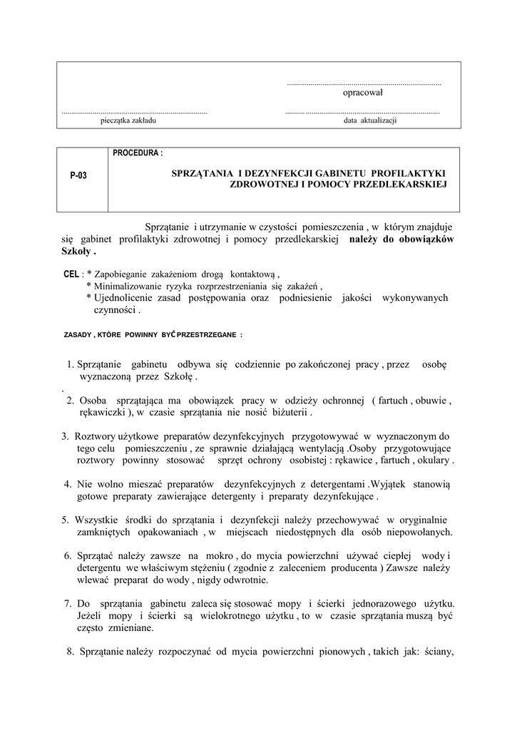 ............................................................................... opracował ........................................................................... pieczątka zakładu .......... ..................................................................... data aktualizacji PROCEDURA : P-03 SPRZĄTANIA I DEZYNFEKCJI GABINETU PROFILAKTYKI ZDROWOTNEJ I POMOCY PRZEDLEKARSKIEJ Sprzątanie i utrzymanie w czystości pomieszczenia , w którym znajduje się gabinet profilaktyki zdrowotnej i pomocy przedlekarskiej należy do obowiązków Szkoły . CEL : * Zapobieganie zakażeniom drogą kontaktową , * Minimalizowanie ryzyka rozprzestrzeniania się zakażeń , * Ujednolicenie zasad postępowania oraz czynności . podniesienie jakości wykonywanych ZASADY , KTÓRE POWINNY BYĆ PRZESTRZEGANE : 1. Sprzątanie gabinetu odbywa się codziennie po zakończonej pracy , przez wyznaczoną przez Szkołę . osobę . 2. Osoba sprzątająca ma obowiązek pracy w odzieży ochronnej ( fartuch , obuwie , rękawiczki ), w czasie sprzątania nie nosić biżuterii . 3. Roztwory użytkowe preparatów dezynfekcyjnych przygotowywać w wyznaczonym do tego celu pomieszczeniu , ze sprawnie działającą wentylacją .Osoby przygotowujące roztwory powinny stosować sprzęt ochrony osobistej : rękawice , fartuch , okulary . 4. Nie wolno mieszać preparatów dezynfekcyjnych z detergentami .Wyjątek stanowią gotowe preparaty zawierające detergenty i preparaty dezynfekujące . 5. Wszystkie środki do sprzątania i dezynfekcji należy przechowywać w oryginalnie zamkniętych opakowaniach , w miejscach niedostępnych dla osób niepowołanych. 6. Sprzątać należy zawsze na mokro , do mycia powierzchni używać ciepłej wody i detergentu we właściwym stężeniu ( zgodnie z zaleceniem producenta ) Zawsze należy wlewać preparat do wody , nigdy odwrotnie. 7. Do sprzątania gabinetu zaleca się stosować mopy i ścierki jednorazowego użytku. Jeżeli mopy i ścierki są wielokrotnego użytku , to w czasie sprzątania muszą być często zmieniane. 8. Sprzątanie należy rozpoczynać od mycia powierzchni pionowych , takich jak: ściany, parapety , kontakty , kaloryfery , a następnie poziomych - podłogi. przechodzić do mycia powierzchni 9. Podczas wymiany worków z odpadami należy chwytać worek pod mankietem , unikając dotykania wnętrza worka . wywiniętym 10. Worki z odpadami komunalnymi należy szczelnie zamknąć i włożyć do większego worka Żadnych odpadów nie należy przesypywać . DO OBOWIĄZKU OSOBY SPRZĄTAJĄCEJ NALEŻY UTRZYMANIE W CZYSTOŚCI : Rodzaj przedmiotu Jak często Sposób postępowania Rodzaj środka oświetlenie boczne lampy sufitowe parapety 1× w tygodniu 1× na kwartał codziennie mycie mycie detergent detergent kafelki wokół umywalek codziennie mycie ,dezynfekcja umywalki i baterie codziennie w razie potrzeby 1× w tygodniu codziennie 1× w miesiącu 1× na kwartał 1× w miesiącu 1× w tygodniu codziennie codziennie 1× w miesiącu mycie ,dezynfekcja mycie detergent środek dezynfekcyjny detergent środek dezynfekcyjny detergent mycie detergent odkurzanie wycieranie na mokro mycie mycie mycie detergent detergent detergent detergent drzwi i framugi klamki okna , żaluzje części wewnętrz. okna części zewnętrzne ściany grzejniki lustra kontakty kratki wywietrzników pojemniki na śmieci podłogi aparat telefoniczny codziennie codziennie w razie potrzeby codziennie po pracy dezynfekcja mycie mycie , dezynfekcja mycie ,dezynfekcja środek dezynfekcyjny detergent detergent środek dezynfekcyjny detergent środek dezynfekcyjny ZASADY POPRAWNEGO SPRZATANIA : 1.Założyć ubranie ochronne i rękawiczki , 2.Przygotować środki myjąco-dezynfekujące , 3.Zabrać worek z odpadami komunalnymi z pomieszczenia i umieścić go w dużym worku, 4.Wilgotną nakładką na mop usunąć pajęczyny , kurz ze ścian sufitów , parapetów i krzeseł – wilgotną ściereczką , 5.Umyć , okna , lustra , 6.Umyć umywalki ,baterie ,glazurę ,pojemniki na mydło , kontakty , drzwi ,framugi , 7.Umyć cokoły i listwy , podłogi , 8.Podłogę myjemy mopem , ruchem zygzakowo-półkolistym , po umyciu powierzchnię zdezynfekować z zastosowaniem odpowiedniego preparatu – pozostawić do wyschnięcia . Dezynfekcji możemy dokonywać na mokro lub wilgotno. 8.W przypadku zabrudzenia powierzchni krwią należy przeprowadzić dezynfekcję wg obowiązujących zasad , 9.Powierzchnie dezynfekowane zostawić do wyschnięcia , nie wycierać , 10.Umyć kosz na odpady , założyć nowy worek , 11.Mopy , ścierki raz użyte muszą być odłożone do nieprzemakalnego foliowego worka , a następnie przekazane do prania , 12.Sprzęt sprzątający po użyciu należy zdezynfekować , umyć i wysuszyć , 13.Sprzęt przechowywać w czystym pomieszczeniu , 14.Zdjąć ubranie ochronne i rękawice. Ręce umyć i zdezynfekować . Uwaga : w przypadku rzeczy , które powinny być dezynfekować najlepiej jest zastosować preparat myjąco - dezynfekujący . Preparaty do mycia i dezynfekcji powierzchni – należy dołączyć informację o stosowanych preparatach do mycia i dezynfekcji twardych i zmywalnych powierzchni wraz z instrukcja przygotowywania roztworów dołączy ć do procedury . AKCEPTUJĄ : ........................................................ pieczątka i podpis Dyrektora Szkoły ........................................................ pieczątka i podpis Kierownika Zakład Przyjęłam do wiadomości i przestrzegania : ..................................................... Nazwisko i Imię Pracownika ........................................................ Data i podpis Pracownika PLAN HIGIENY GABINETU PROFILAKTYK ZDROWOTNEJ I POMOCY PRZEDLEKARSKIEJ Obszar mycia , dezynfekcji od 1 - 10 Co wykonano /rodzaj czynności / Rodzaj zastosow. preparatu/sprzętu Data wykonania Podpis osoby wykonującej Legenda : 1.oświetlenie , lampy 2. parapety 3. kafelki wokół umywalek 4. umywalki i baterie 6. okna ,żaluzje 5. drzw