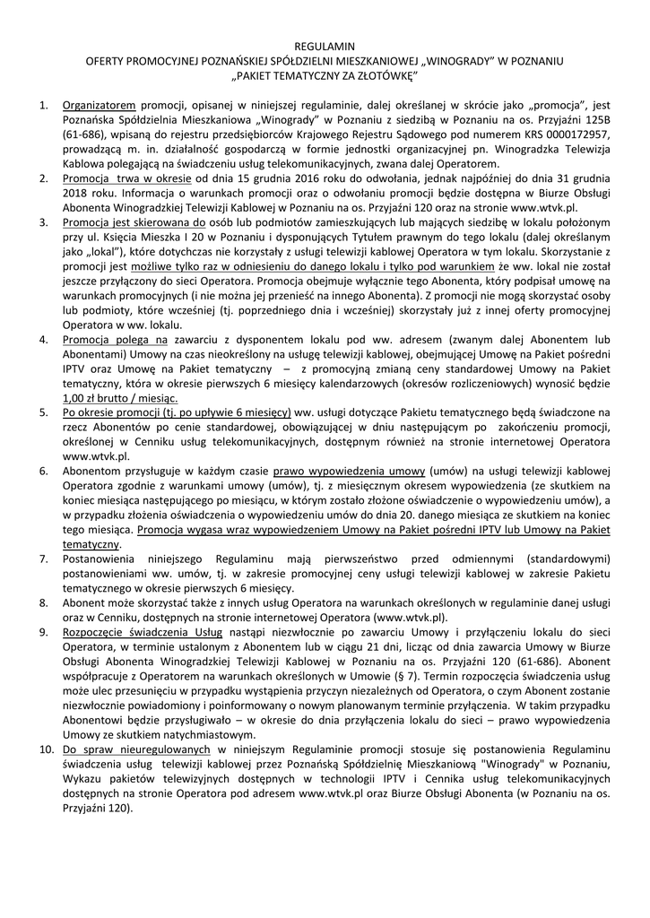 REGULAMIN OFERTY PROMOCYJNEJ POZNAŃSKIEJ SPÓŁDZIELNI MIESZKANIOWEJ „WINOGRADY” W POZNANIU „PAKIET TEMATYCZNY ZA ZŁOTÓWKĘ” 1. Organizatorem promocji, opisanej w niniejszej regulaminie, dalej określanej w skrócie jako „promocja”, jest Poznańska Spółdzielnia Mieszkaniowa „Winogrady” w Poznaniu z siedzibą w Poznaniu na os. Przyjaźni 125B (61-686), wpisaną do rejestru przedsiębiorców Krajowego Rejestru Sądowego pod numerem KRS 0000172957, prowadzącą m. in. działalność gospodarczą w formie jednostki organizacyjnej pn. Winogradzka Telewizja Kablowa polegającą na świadczeniu usług telekomunikacyjnych, zwana dalej Operatorem. 2. Promocja trwa w okresie od dnia 15 grudnia 2016 roku do odwołania, jednak najpóźniej do dnia 31 grudnia 2018 roku. Informacja o warunkach promocji oraz o odwołaniu promocji będzie dostępna w Biurze Obsługi Abonenta Winogradzkiej Telewizji Kablowej w Poznaniu na os. Przyjaźni 120 oraz na stronie www.wtvk.pl. 3. Promocja jest skierowana do osób lub podmiotów zamieszkujących lub mających siedzibę w lokalu położonym przy ul. Księcia Mieszka I 20 w Poznaniu i dysponujących Tytułem prawnym do tego lokalu (dalej określanym jako „lokal”), które dotychczas nie korzystały z usługi telewizji kablowej Operatora w tym lokalu. Skorzystanie z promocji jest możliwe tylko raz w odniesieniu do danego lokalu i tylko pod warunkiem że ww. lokal nie został jeszcze przyłączony do sieci Operatora. Promocja obejmuje wyłącznie tego Abonenta, który podpisał umowę na warunkach promocyjnych (i nie można jej przenieść na innego Abonenta). Z promocji nie mogą skorzystać osoby lub podmioty, które wcześniej (tj. poprzedniego dnia i wcześniej) skorzystały już z innej oferty promocyjnej Operatora w ww. lokalu. 4. Promocja polega na zawarciu z dysponentem lokalu pod ww. adresem (zwanym dalej Abonentem lub Abonentami) Umowy na czas nieokreślony na usługę telewizji kablowej, obejmującej Umowę na Pakiet pośredni IPTV oraz Umowę na Pakiet tematyczny – z promocyjną zmianą ceny standardowej Umowy na Pakiet tematyczny, która w okresie pierwszych 6 miesięcy kalendarzowych (okresów rozliczeniowych) wynosić będzie 1,00 zł brutto / miesiąc. 5. Po okresie promocji (tj. po upływie 6 miesięcy) ww. usługi dotyczące Pakietu tematycznego będą świadczone na rzecz Abonentów po cenie standardowej, obowiązującej w dniu następującym po zakończeniu promocji, określonej w Cenniku usług telekomunikacyjnych, dostępnym również na stronie internetowej Operatora www.wtvk.pl. 6. Abonentom przysługuje w każdym czasie prawo wypowiedzenia umowy (umów) na usługi telewizji kablowej Operatora zgodnie z warunkami umowy (umów), tj. z miesięcznym okresem wypowiedzenia (ze skutkiem na koniec miesiąca następującego po miesiącu, w którym zostało złożone oświadczenie o wypowiedzeniu umów), a w przypadku złożenia oświadczenia o wypowiedzeniu umów do dnia 20. danego miesiąca ze skutkiem na koniec tego miesiąca. Promocja wygasa wraz wypowiedzeniem Umowy na Pakiet pośredni IPTV lub Umowy na Pakiet tematyczny. 7. Postanowienia niniejszego Regulaminu mają pierwszeństwo przed odmiennymi (standardowymi) postanowieniami ww. umów, tj. w zakresie promocyjnej ceny usługi telewizji kablowej w zakresie Pakietu tematycznego w okresie pierwszych 6 miesięcy. 8. Abonent może skorzystać także z innych usług Operatora na warunkach określonych w regulaminie danej usługi oraz w Cenniku, dostępnych na stronie internetowej Operatora (www.wtvk.pl). 9. Rozpoczęcie świadczenia Usług nastąpi niezwłocznie po zawarciu Umowy i przyłączeniu lokalu do sieci Operatora, w terminie ustalonym z Abonentem lub w ciągu 21 dni, licząc od dnia zawarcia Umowy w Biurze Obsługi Abonenta Winogradzkiej Telewizji Kablowej w Poznaniu na os. Przyjaźni 120 (61-686). Abonent współpracuje z Operatorem na warunkach określonych w Umowie (§ 7). Termin rozpoczęcia świadczenia usług może ulec przesunięciu w przypadku wystąpienia przyczyn niezależnych od Operatora, o czym Abonent zostanie niezwłocznie powiadomiony i poinformowany o nowym planowanym terminie przyłączenia. W takim przypadku Abonentowi będzie przysługiwało – w okresie do dnia przyłączenia lokalu do sieci – prawo wypowiedzenia Umowy ze skutkiem natychmiastowym. 10. Do spraw nieuregulowanych w niniejszym Regulaminie promocji stosuje się postanowienia Regulaminu świadczenia usług telewizji kablowej przez Poznańską Spółdzielnię Mieszkaniową "Winogrady" w Poznaniu, Wykazu pakietów telewizyjnych dostępnych w technologii IPTV i Cennika usług telekomunikacyjnych dostępnych na stronie Operatora pod adresem www.wtvk.pl oraz Biurze Obsługi Abonenta (w Poznaniu na os. Przyjaźni 120).